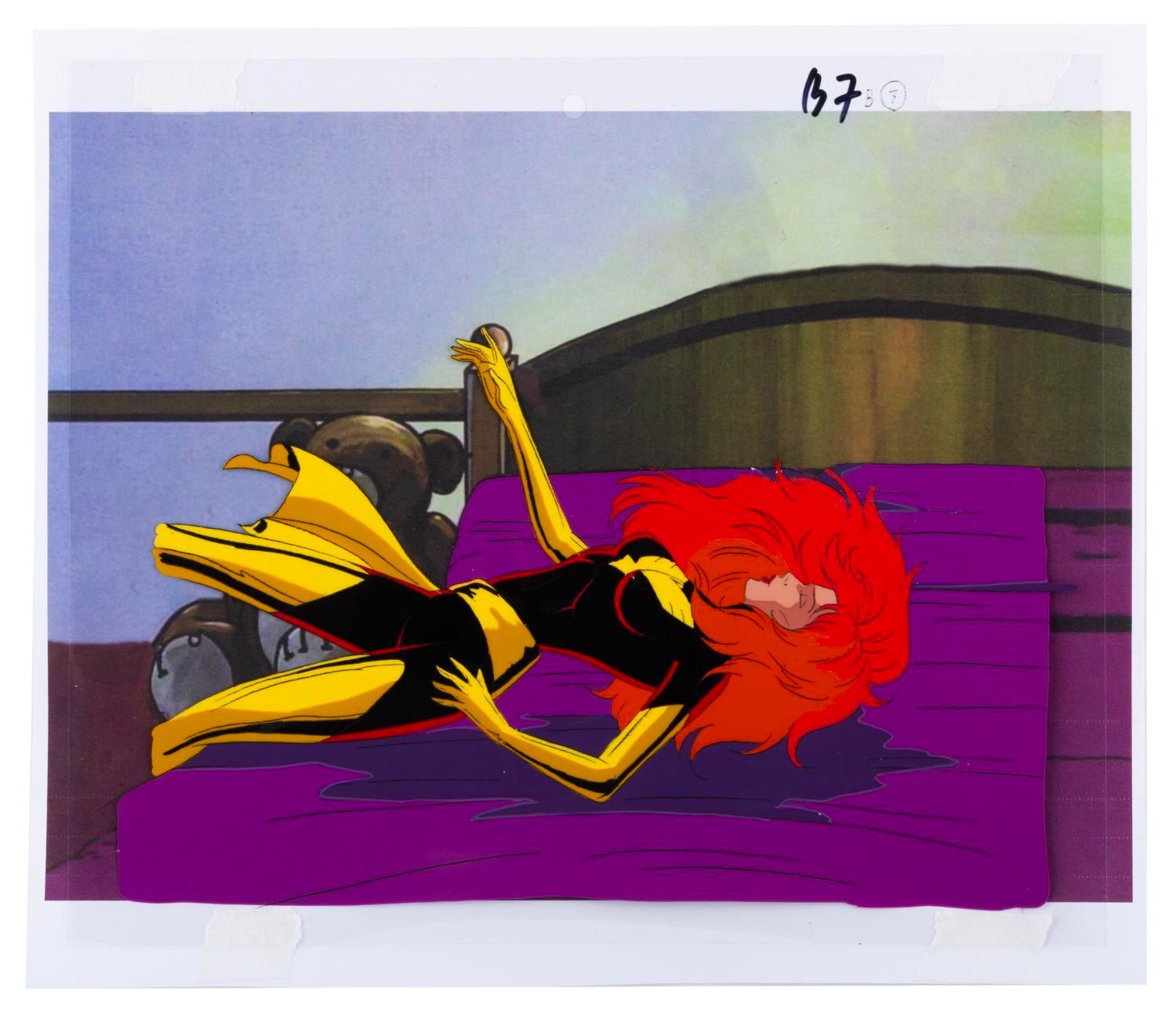 (Fox, 1994) An original production cel of Dark Phoenix from the "X-Men: The Animated Series " episode "The Dark Phoenix Saga Part 3: The Dark Phoenix, " with a color copy background. Dark Phoenix has an image size of 5.75 " x 9.5 " on a 9 " x 10.5 " trimmed cel. The art is in very good condition with light wear from production use and paper backing transfer on the reverse.