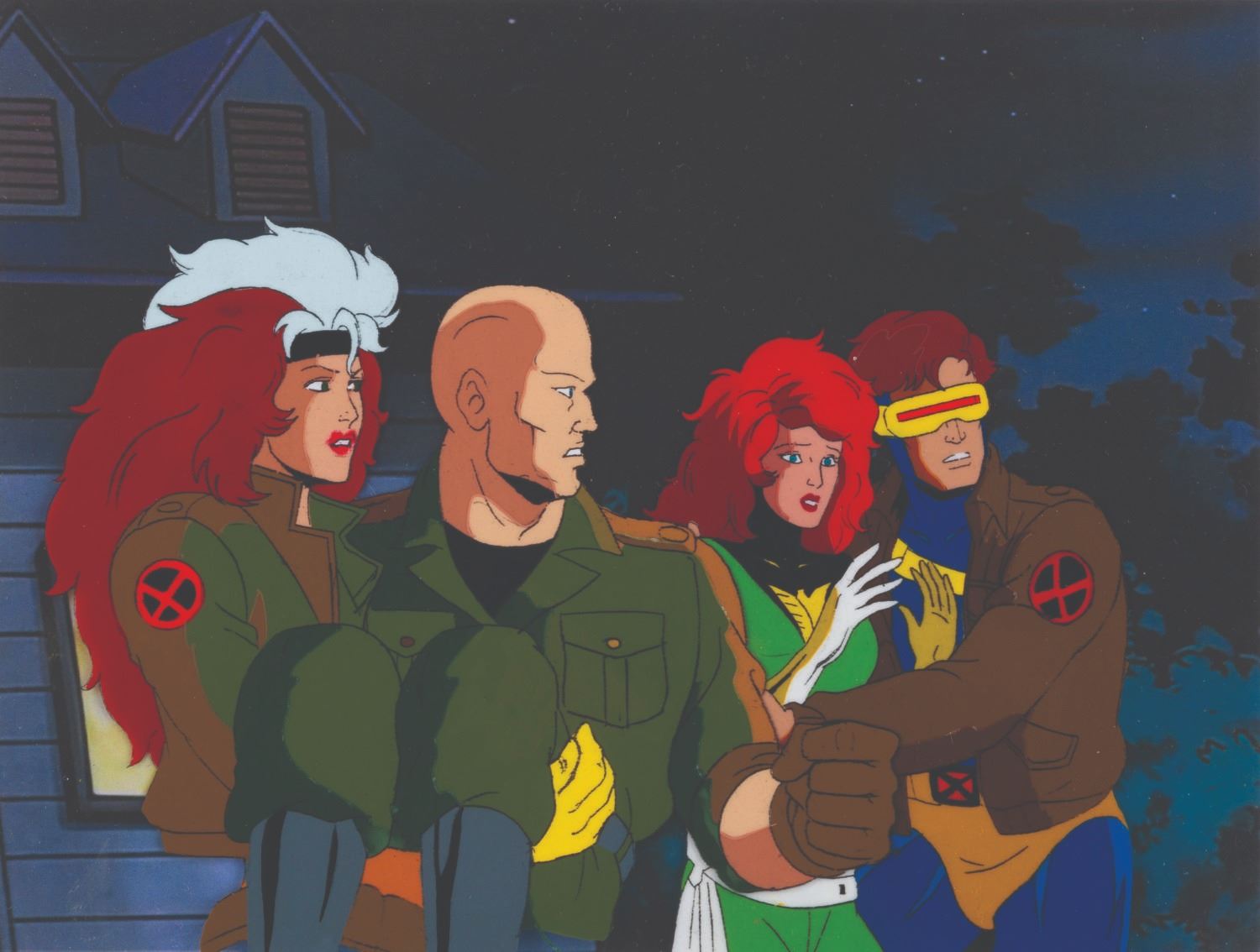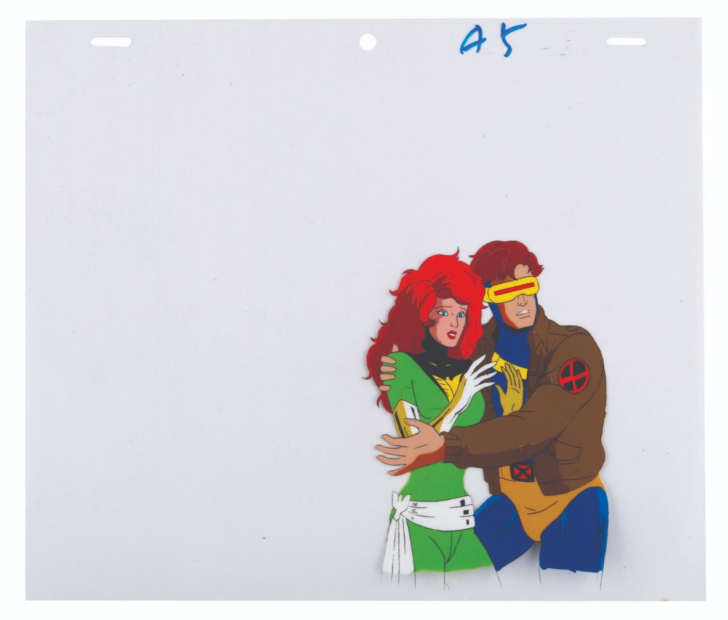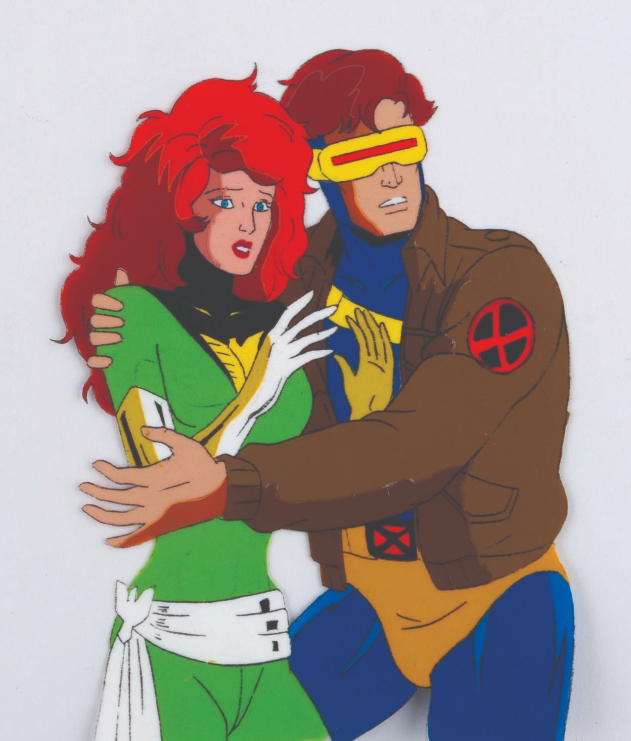 (Fox, 1994) An original multi-layer production cel from “X-Men: The Animated Series” of Rogue, Professor X, Cyclops, and Jean Grey from the season three episode "The Dark Phoenix, Part III: The Dark Phoenix" with a color copy background. Measuring 10.5” x 9” with a character image size of 5” x 8.5”, the cel is in fine condition.