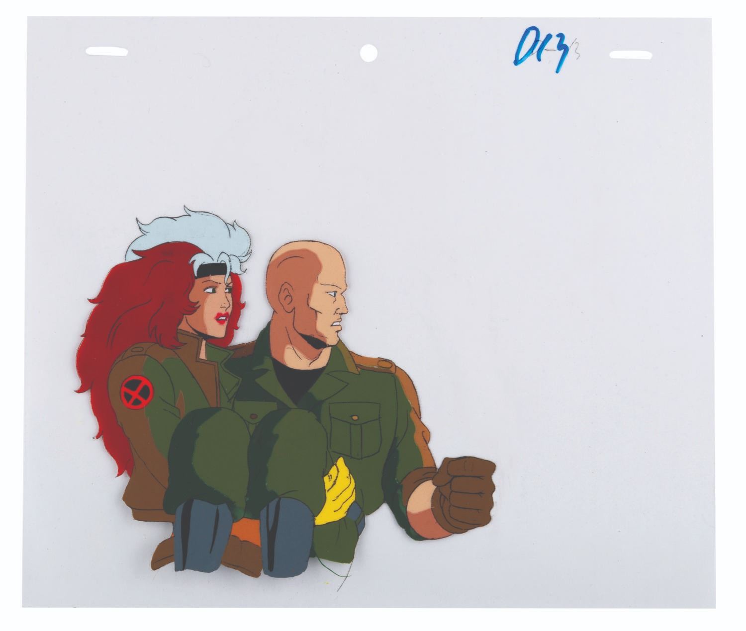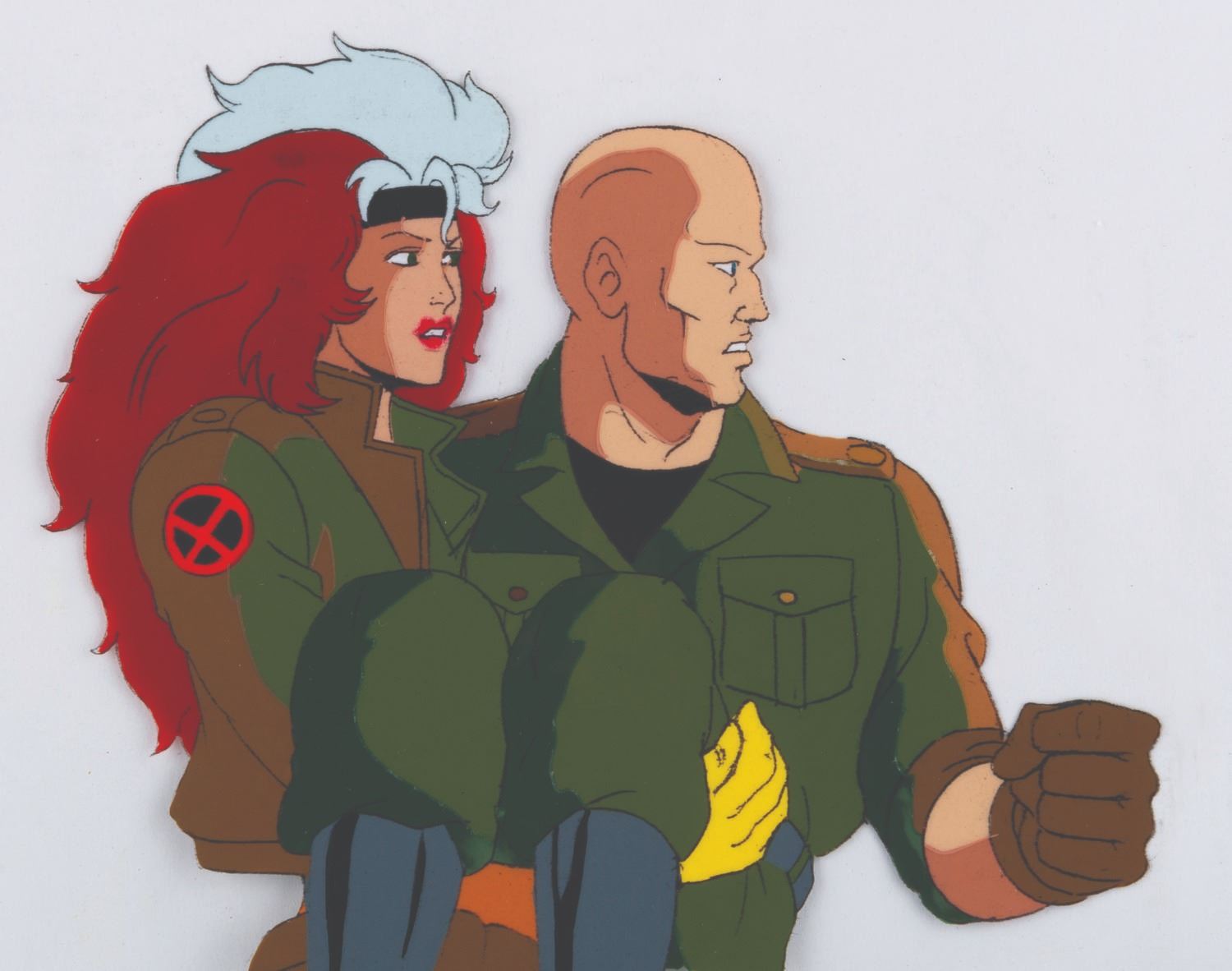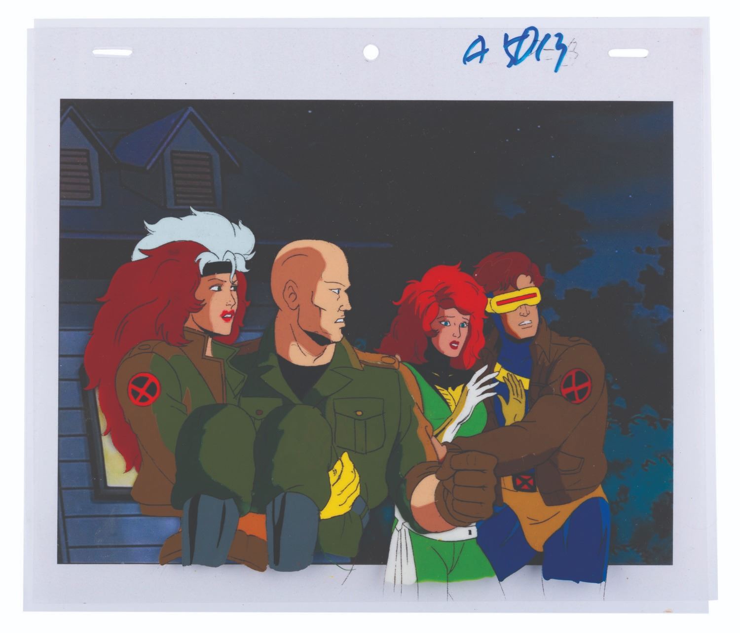 (Fox, 1994) An original multi-layer production cel from “X-Men: The Animated Series” of Rogue, Professor X, Cyclops, and Jean Grey from the season three episode "The Dark Phoenix, Part III: The Dark Phoenix" with a color copy background. Measuring 10.5” x 9” with a character image size of 5” x 8.5”, the cel is in fine condition.