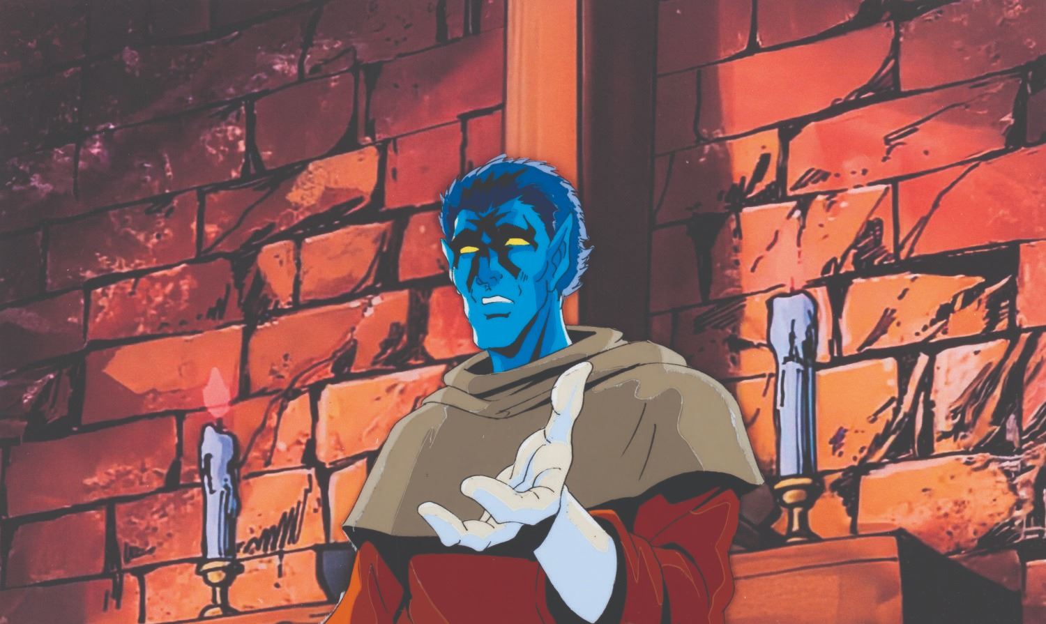 (Fox, 1995) An original production cel from “X-Men: The Animated Series” of Nightcrawler from the season four episode “Nightcrawler” with a color copy background. Measuring 10.5” x 12.5" with a character image size of 5.5” x 5.25”, the cel is in fine condition.