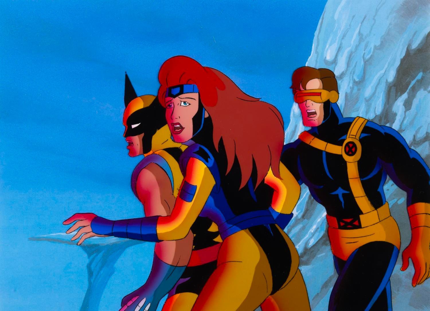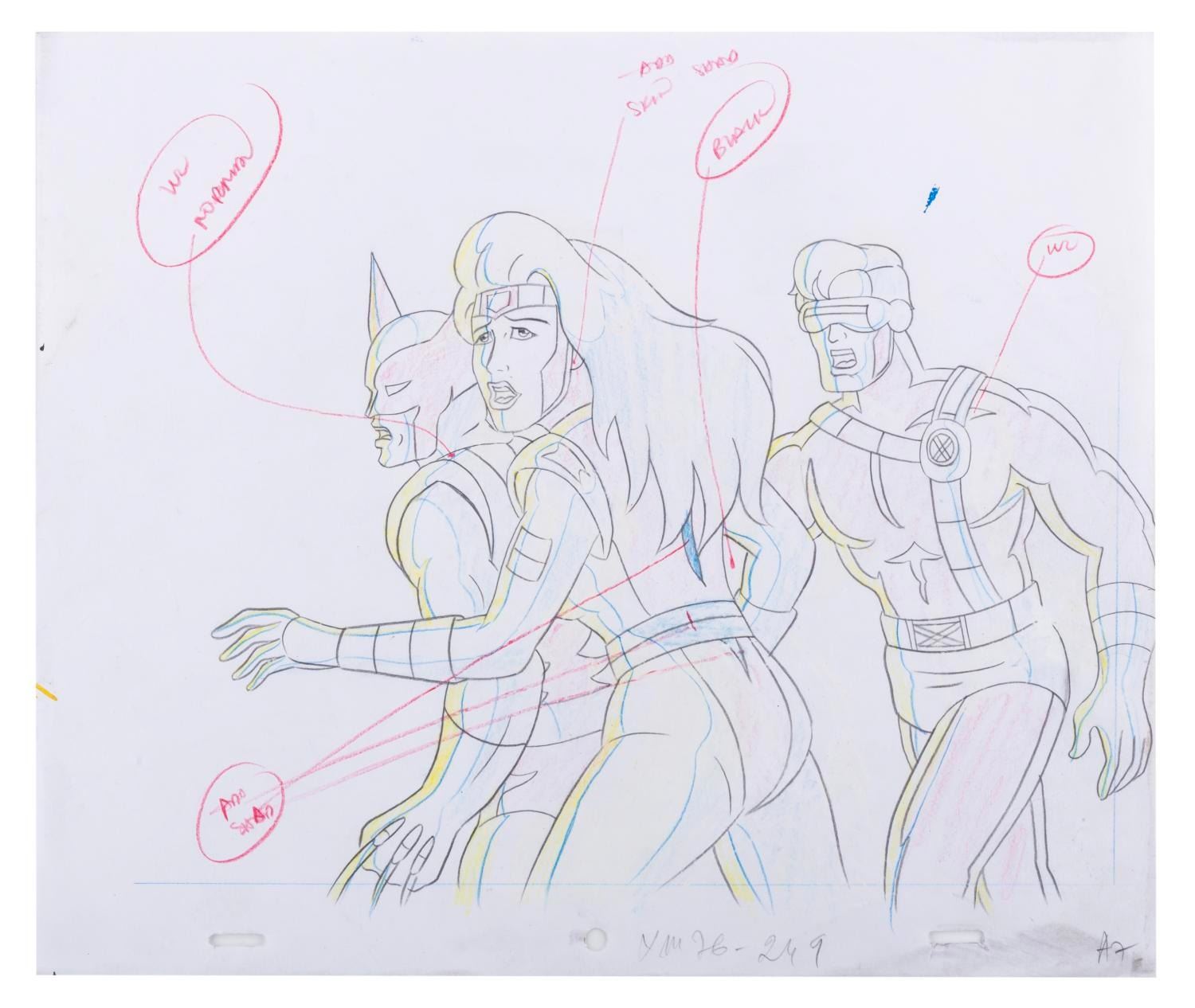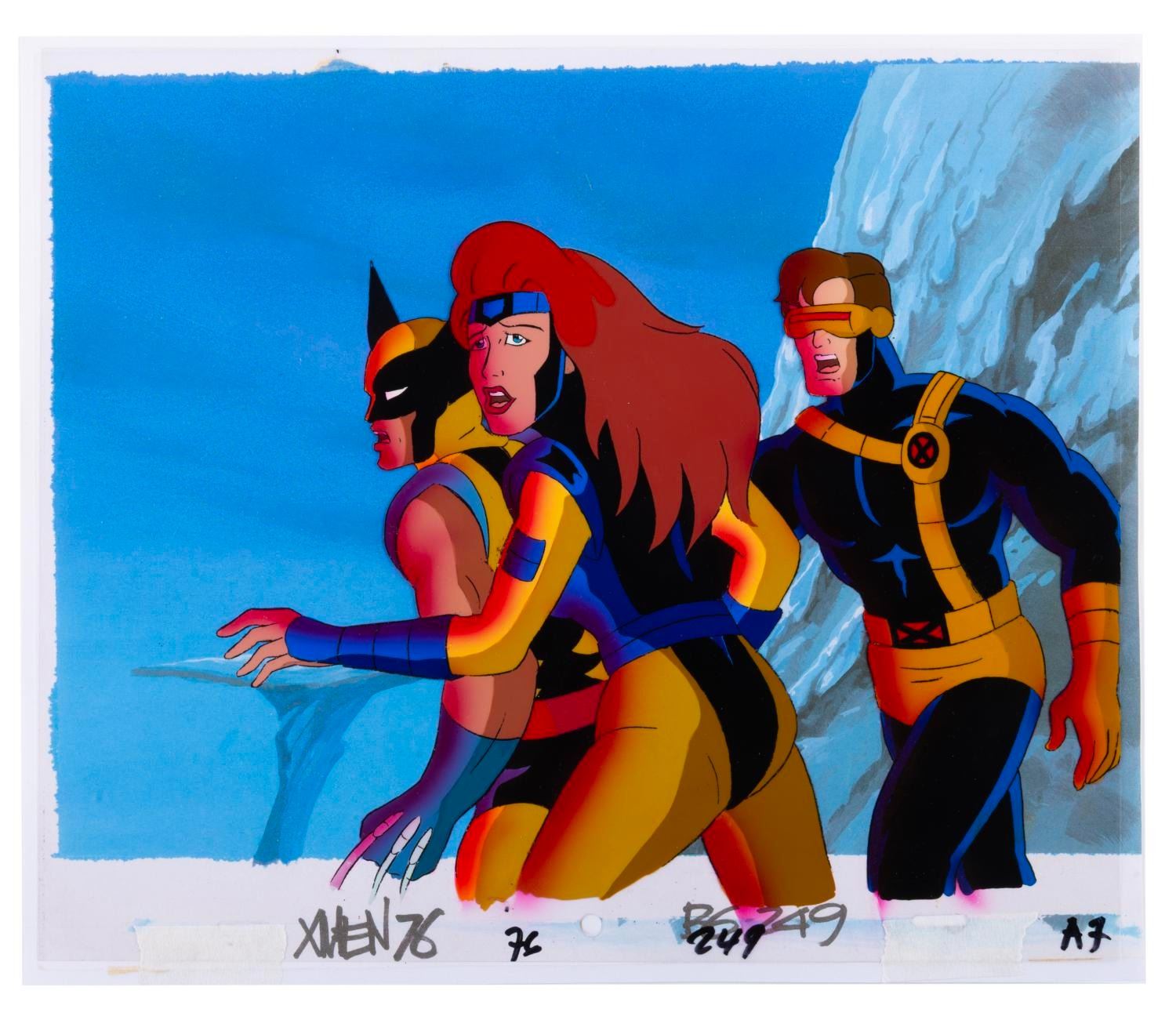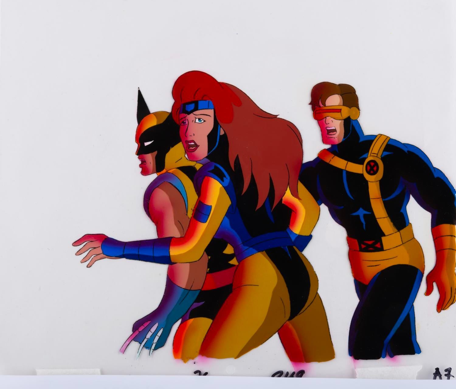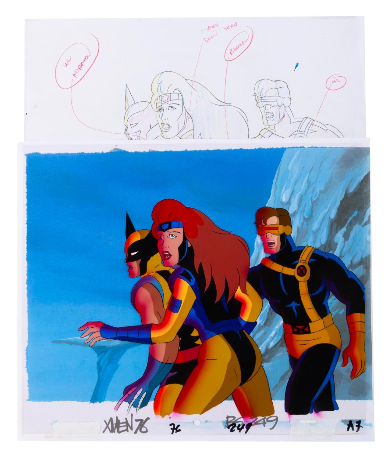 (Fox, 1997) An original production cel and color model drawing of Wolverine, Jean Grey, and Cyclops from the "X-Men: The Animated Series " series finale "Graduation Day. " With a character image size of 8 " x 10.5 " on a 10.5 " x 12.5 " cel and animation paper, the art displays in very good condition with light line loss, wear from production use, paper backing transfer on the reverse, and creases on the drawing.