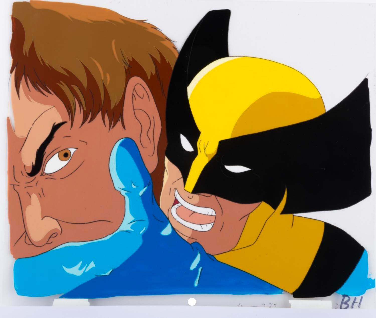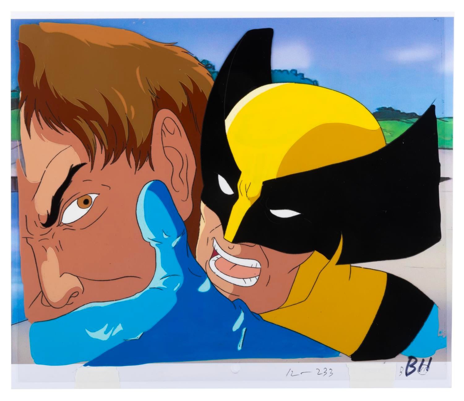 (Fox, 1993) An original production cel of Wolverine from the “X-Men: The Animated Series” episode “Days of Future Past Part 2” with a color copy background. Measuring 10.5” x 12.5”, the hand-painted cel is in very good condition with paint residue to the top left edge, which does not affect the image.