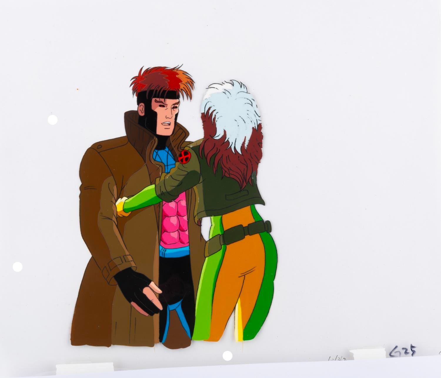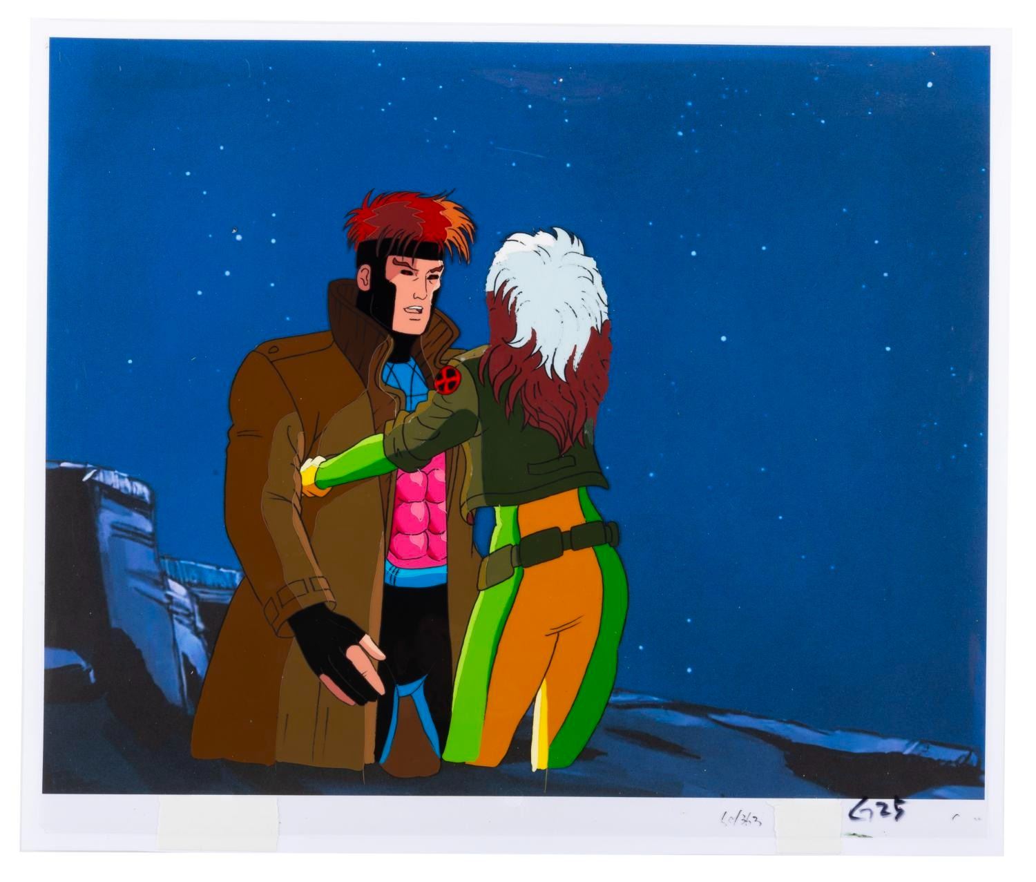(Fox, 1993) An original production cel of Rogue and Gambit from “X-Men: The Animated Series” episode “The Final Decision,” with a color copy background. Rogue and Gambit have an image size of 7.75” x 5.75” on a 10.5” x 12.5” cel. The hand-painted cel is in very good condition with light line loss to Rogue’s hair.