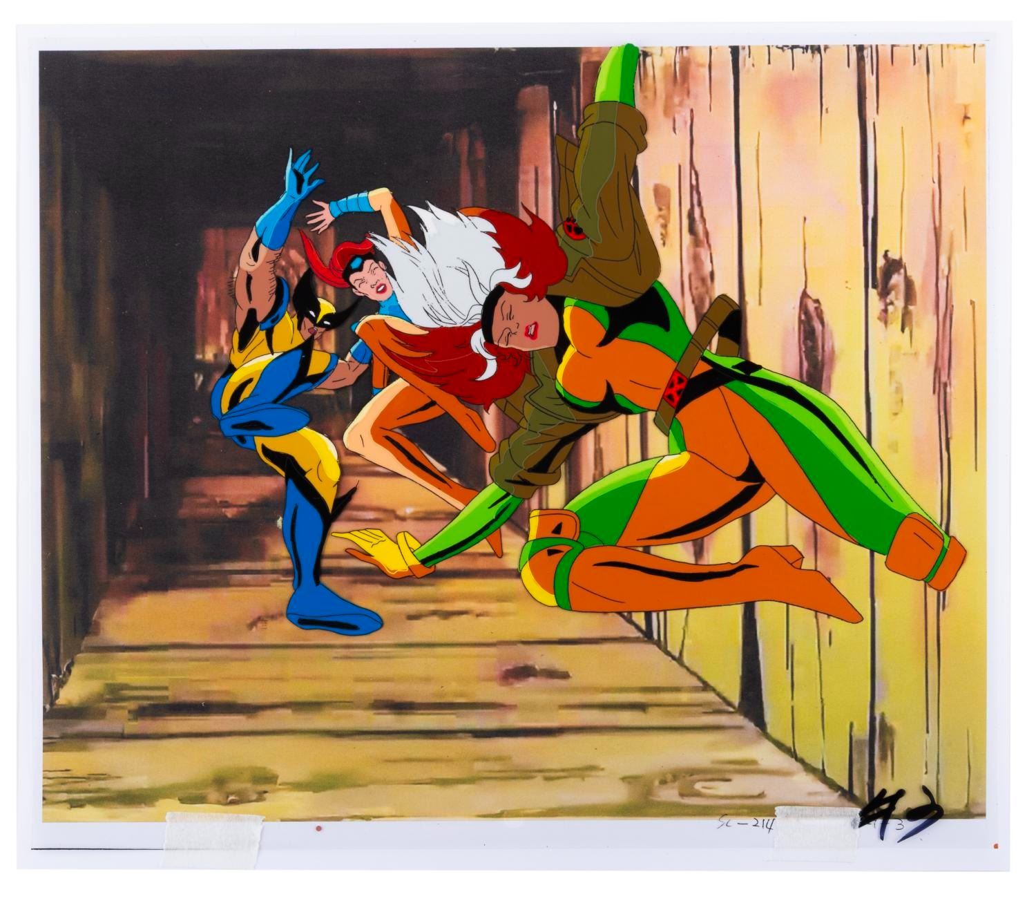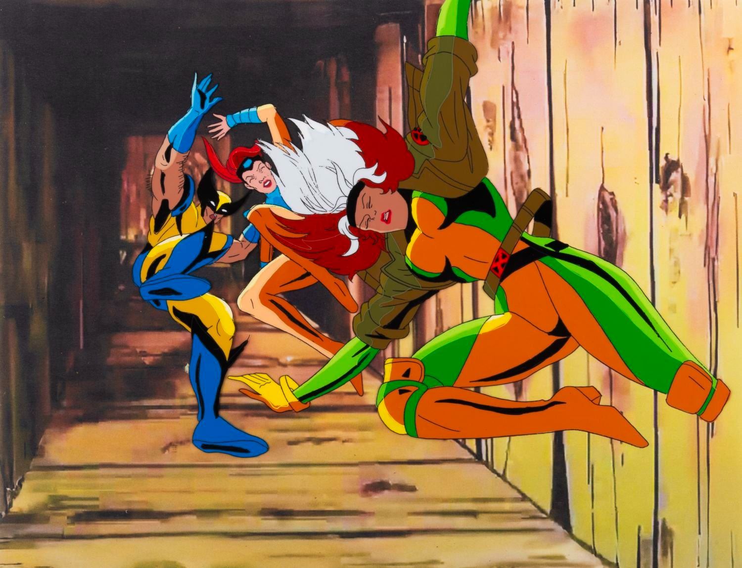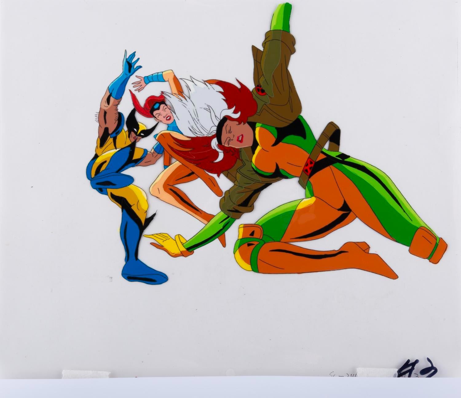 (Fox, 1993) An original production cel of Wolverine, Rogue, and Jean Grey from the "X-Men: The Animated Series " episode "X-Ternally Yours, " with a color copy background. The characters have an image size of 7.5 " x 9.75 " on a 10.5 " x 12.5 " cel. The art is in very good condition with light wear from production use and paper backing transfer on the reverse.