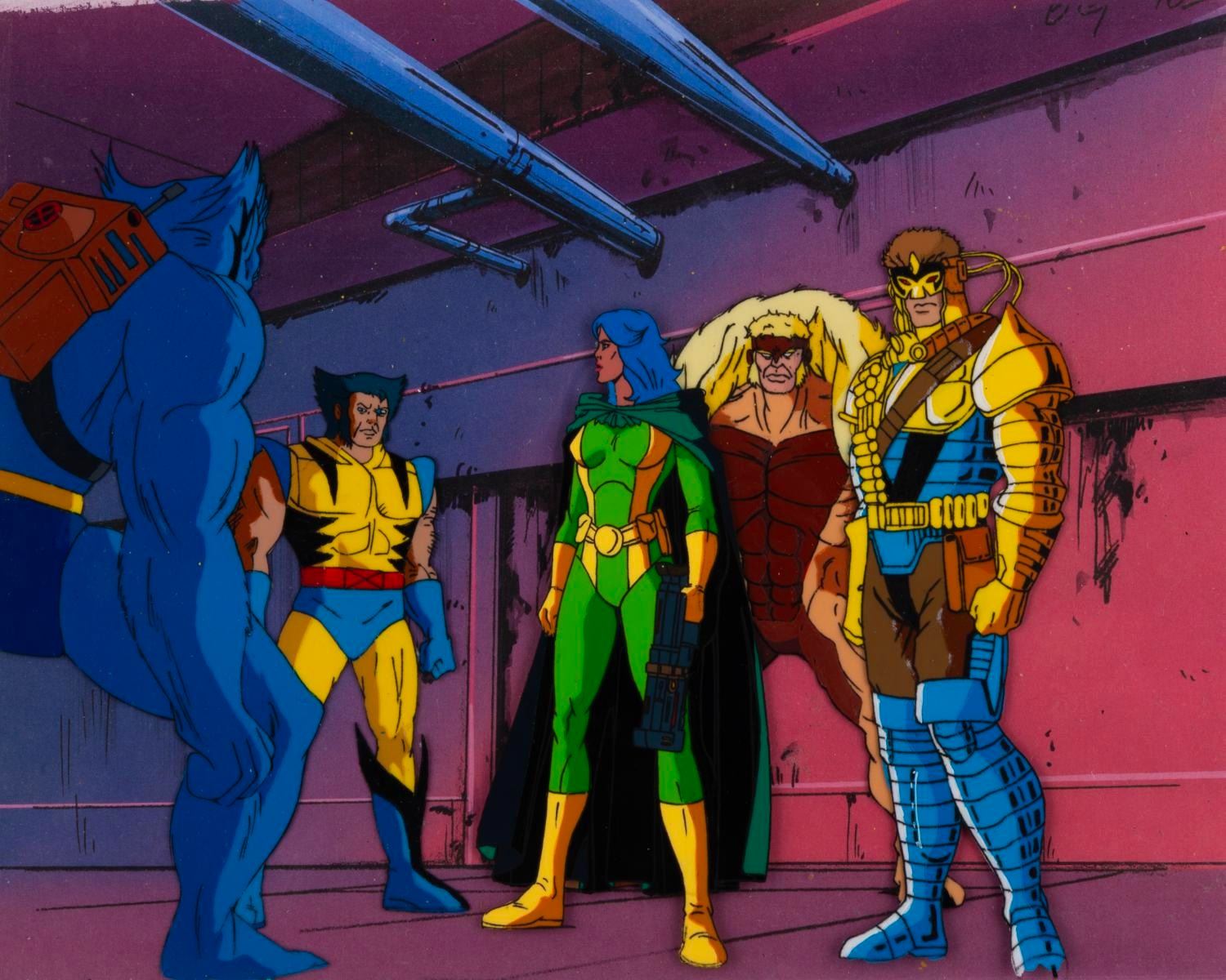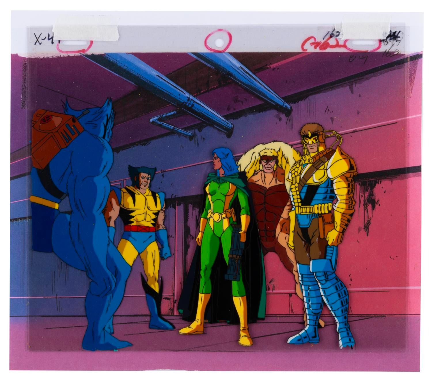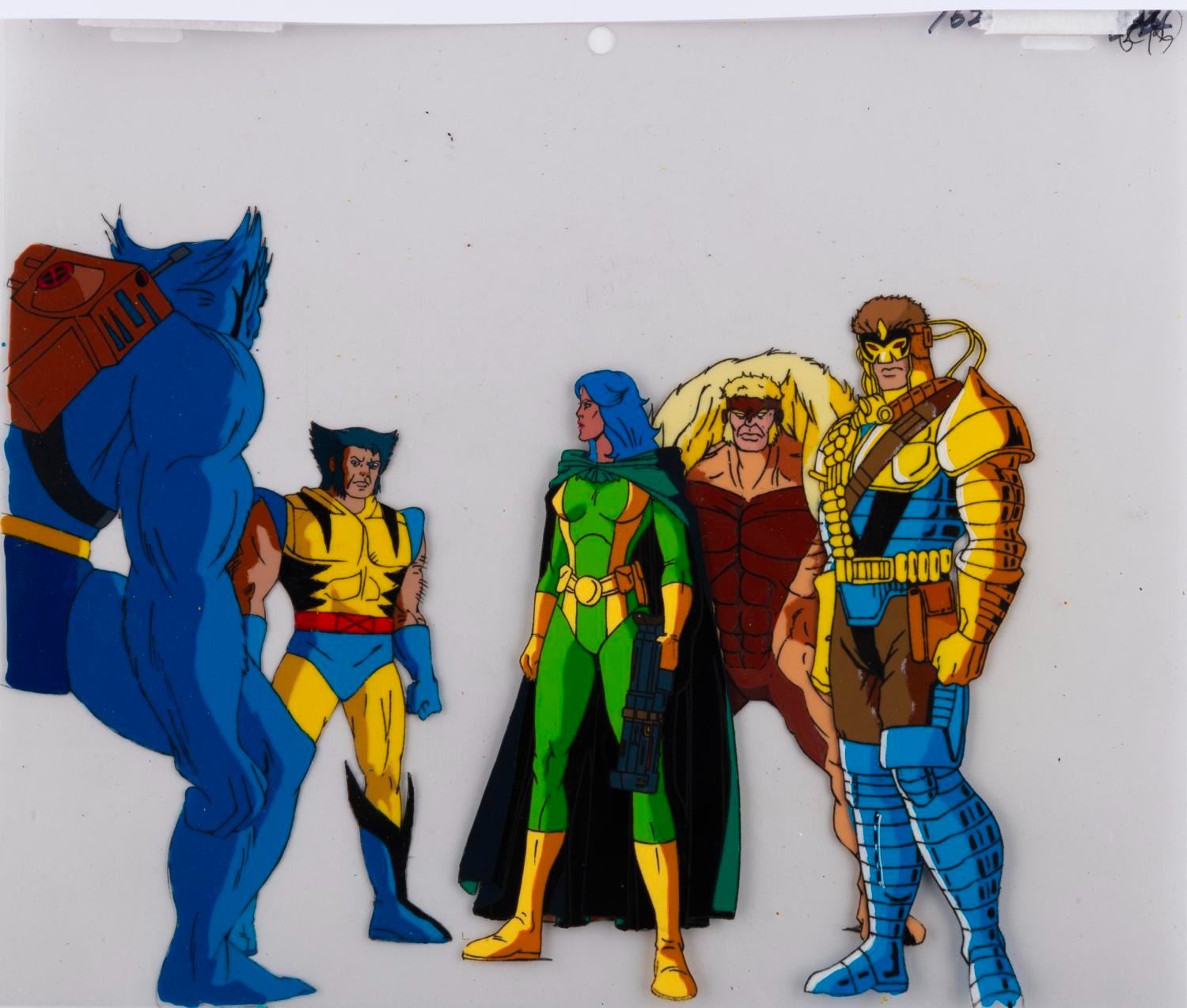 (Fox, 1995) An original production cel of Wolverine, Beast, and Team X members Maverick, Silver Fox, and Sabretooth from the "X-Men: The Animated Series " episode "Weapon X, Lies, and Videotape, " with a color copy background. The characters have an image size of 7 " x 9 " on 9 " x 10.5 " trimmed cels. The art is in very good condition with scratches, wear from production use, and paper backing transfer on the reverse.