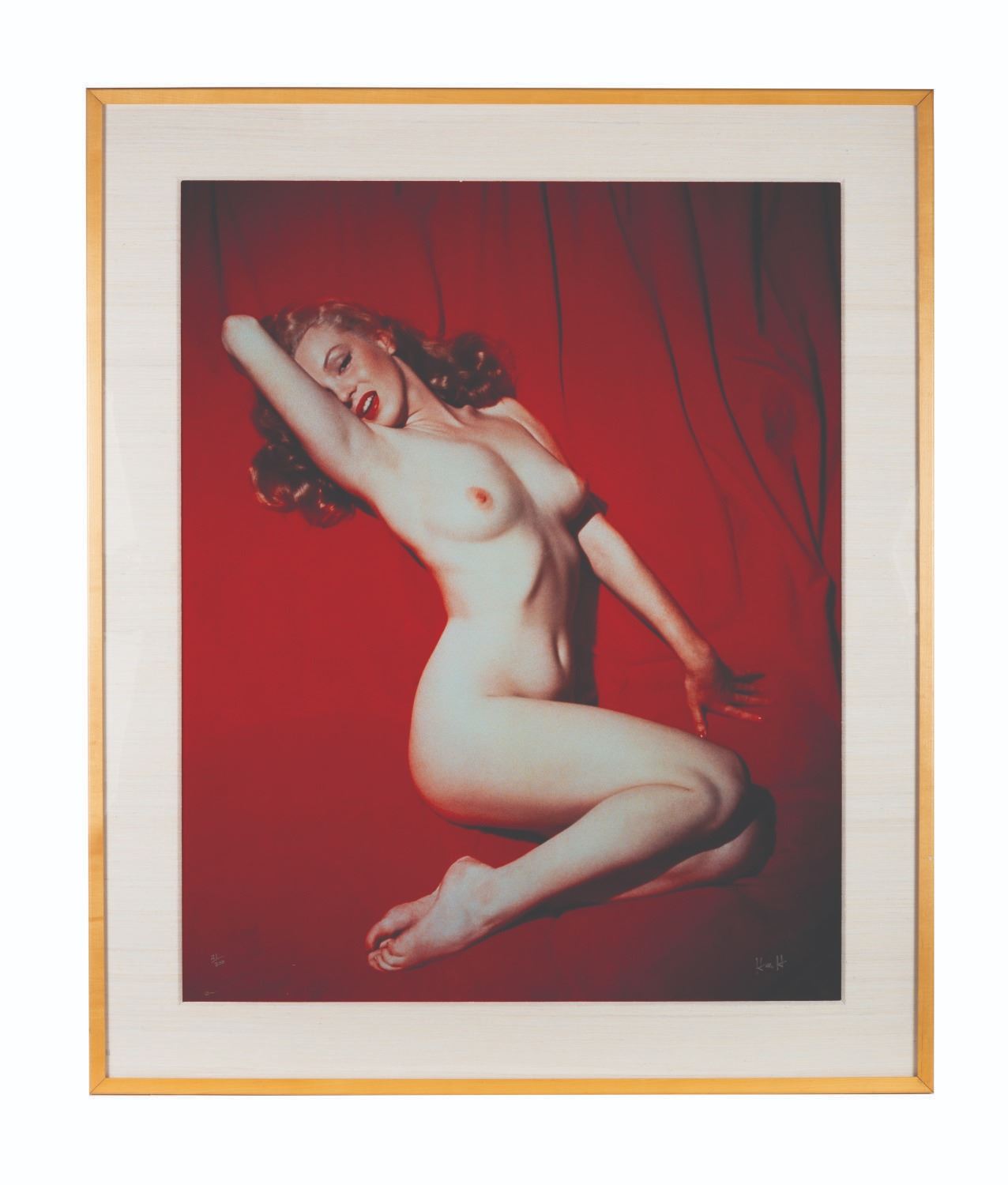 (Playboy, 1990s) An over-sized print of Marilyn Monroe's famous"red-velvet pose" signed by Playboy magnate Hugh Hefner. Monroe famously appeared in the very first issue of Playboy magazine. Hefner paid tribute to her with this Limited Edition print. The print is initialed in the bottom right corner"HMH" for Hugh Marston Hefner, and numbered in the left 21 out of 300. The print is in very fine condition, framed.
