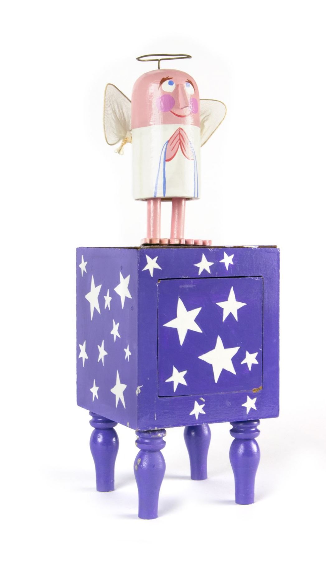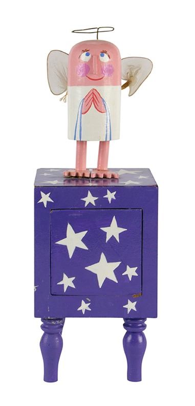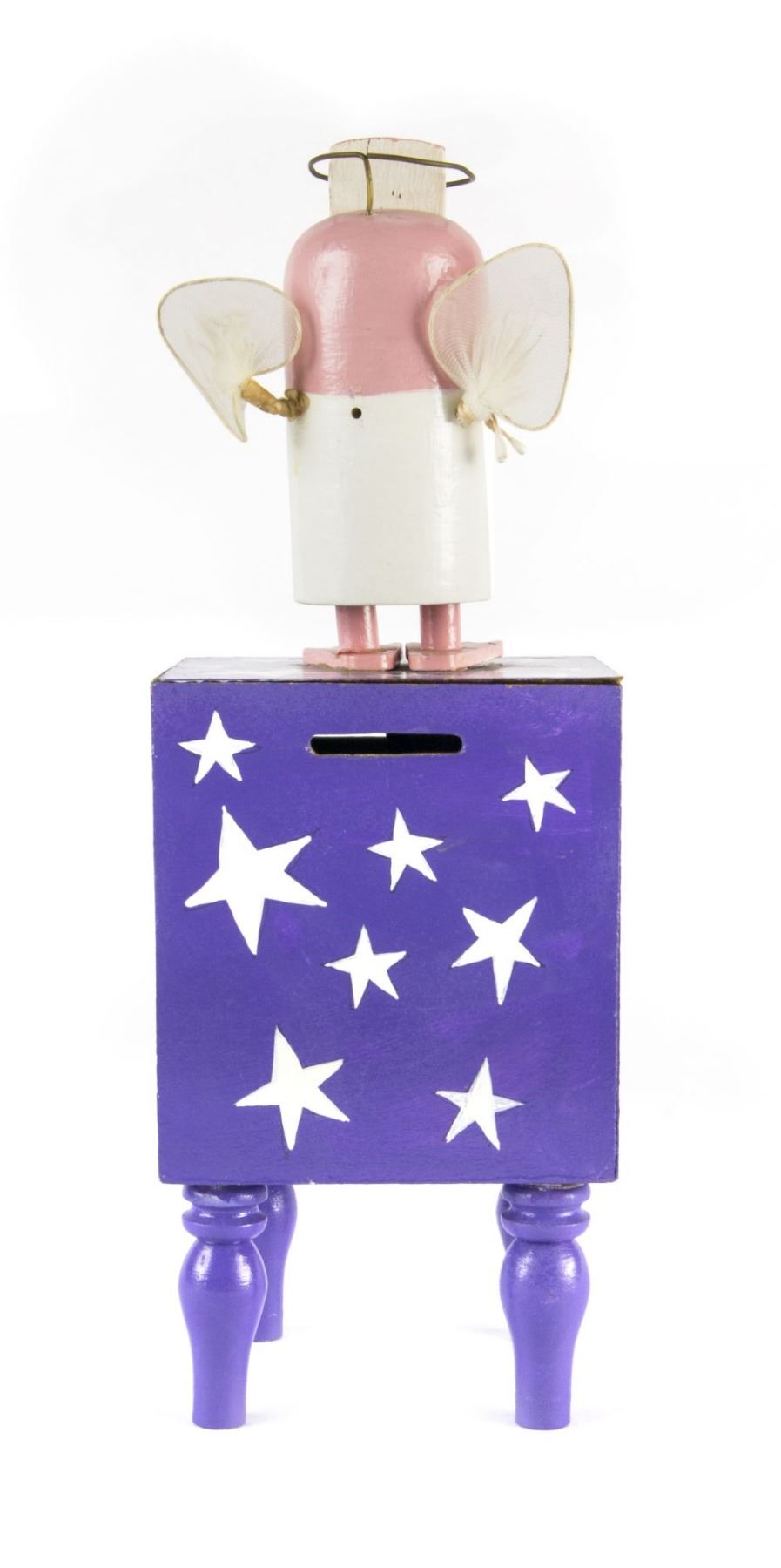 (1960s) An original one-of-a-kind "push-down" bank toy created and hand-painted by Rolly Crump. This bank was designed that when the angel is pushed down, a sign reads "Pennies from Heaven" and the bank would open and the coins inside would spill out. This bank measures 12" tall and is in good condition with some expected wear from age and minor repairs made by Rolly. The mechanisms which open the side panel do not currently function.