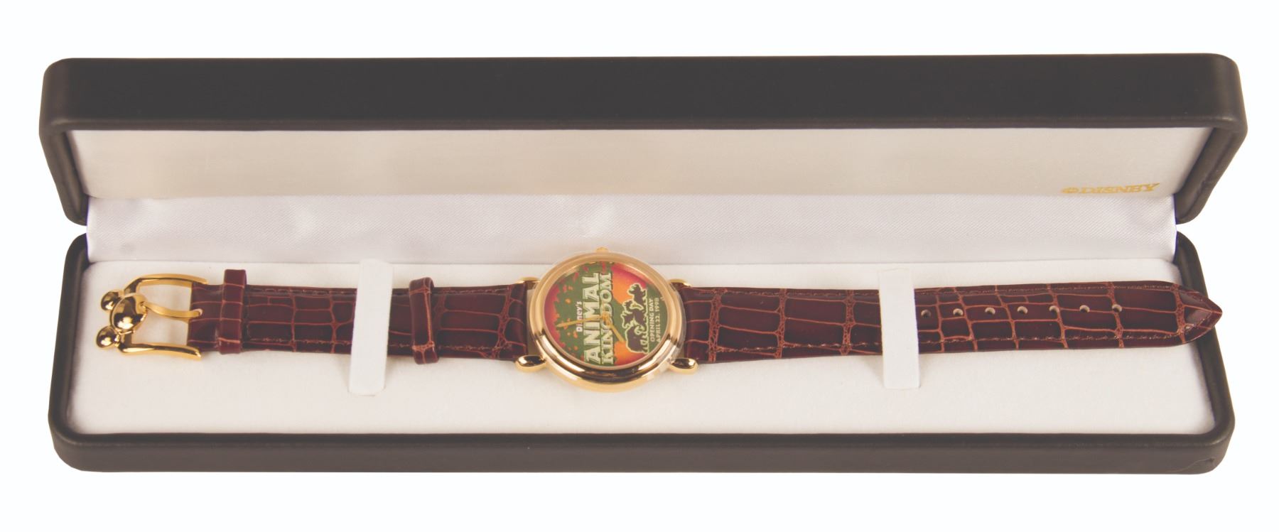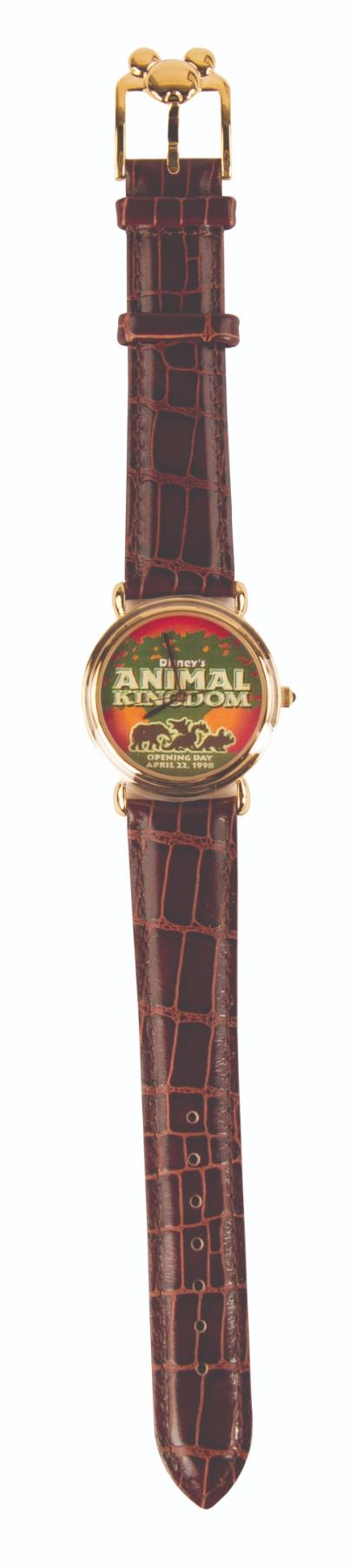 (Animal Kingdom, 1998) A limited edition watch commemorating the opening of the Animal Kingdom at Walt Disney World on April 22, 1998. The band is genuine leather and features a Mickey head on the buckle. Measuring 9.5" long, the watch is unused and in fine condition with the protective covering still on the face. The watch comes in its original box.