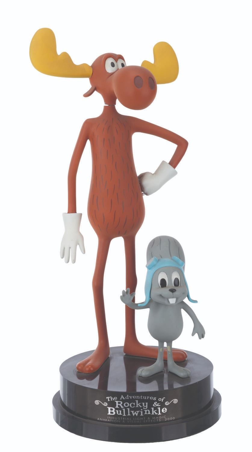 (ILM, 2000) Rare animator’s maquettes created by Industrial Light & Magic from the production of “The Adventures of Rocky and Bullwinkle.” Maquettes are used by animators as a three-dimensional reference while animating the characters. Measuring 17.5” tall and 7.5” in diameter, the maquettes are in good condition with light paint chipping, part of Bullwinke’s hair missing, separation at Bullwinkle’s neck, and wear from production use.