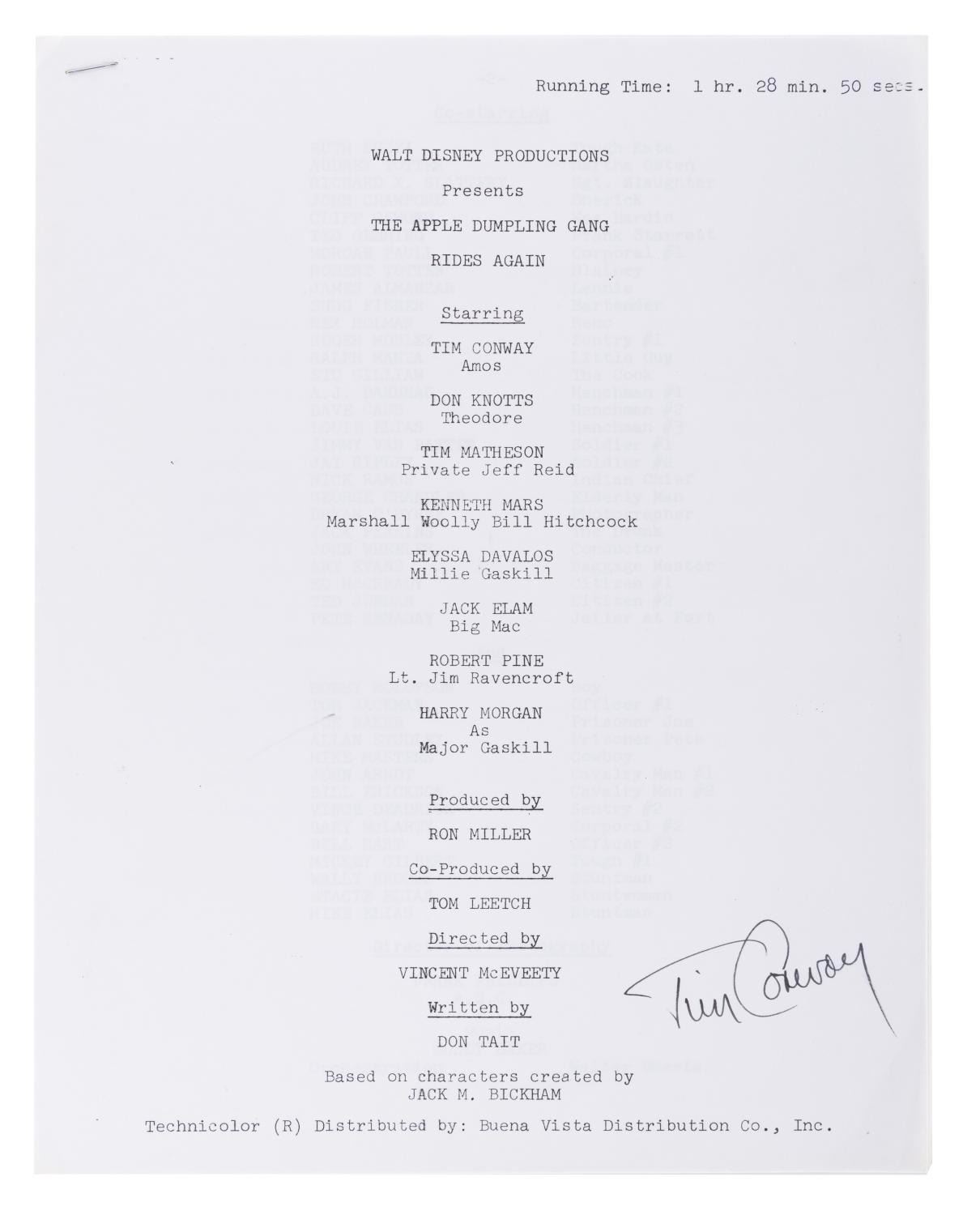(Disney, 1979) A press packet for "The Apple Dumpling Gang Rides Again" signed by the film's star Tim Conway. The twelve-page packet includes credits, production information, cast biographies, and the story of the film. Measuring 8.5" x 11", the signed packet is in very good condition, with typical light wear from handling.