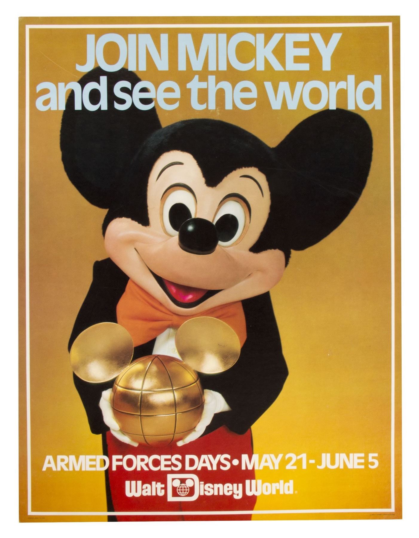 (Walt Disney World, c.1977) A counter display for Walt Disney World's "Armed Forces Days". The display is on sturdy board with a foldable stand attached to the back, and features a great photo of Mickey. This display measures 19.5"x14.75" and is in very good condition with minor wear from use.