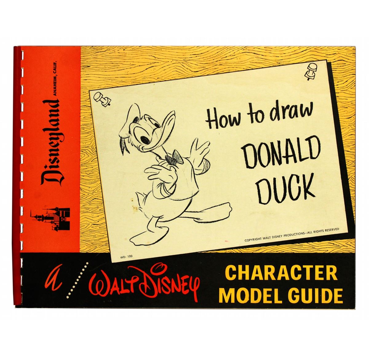 (Disneyland, 1957) Souvenir guide sold at the Disneyland Art Corner with instructions on how to draw “Donald Duck”. Measuring 8.5 x 11 in. and in very good condition. Red plastic spiral binding is brittle and is cracked.
