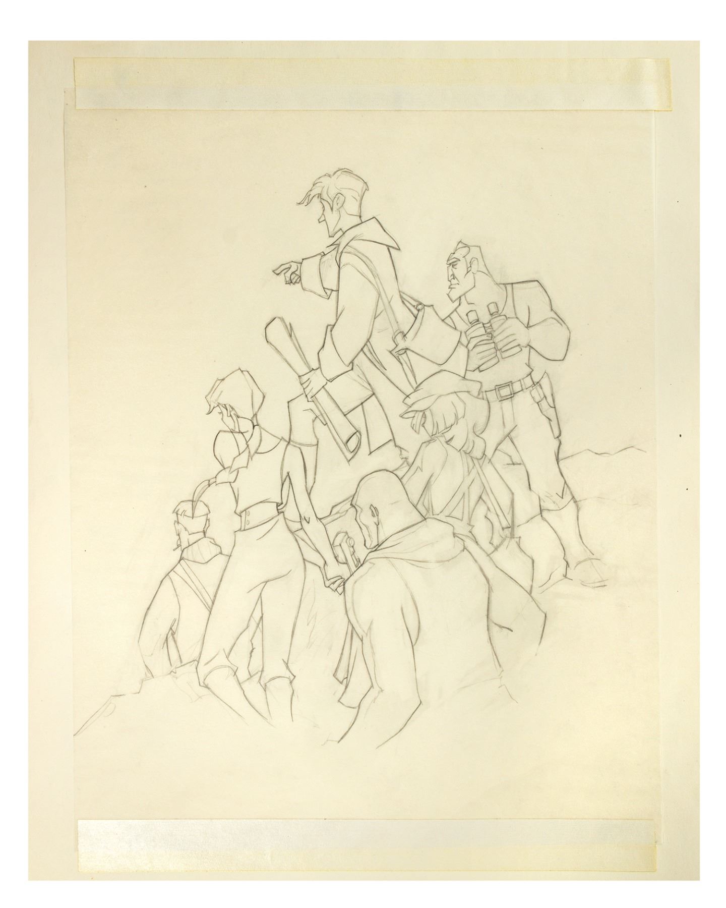 (Disney, 2001) An original drawing created for Atlantis: The Lost Empire. The artwork is believed to have been created for posters or other promotional materials for the theatrical release of the film, and features the principal cast of characters including Milo, Rourke, Vinny, Dr. Sweet, and others. The drawing is accomplished in pencil on a 15"x12" vellum sheets that is taped to a 16.75"x14" sheet of art paper. The condition is good, with a slight wavy quality to the vellum.