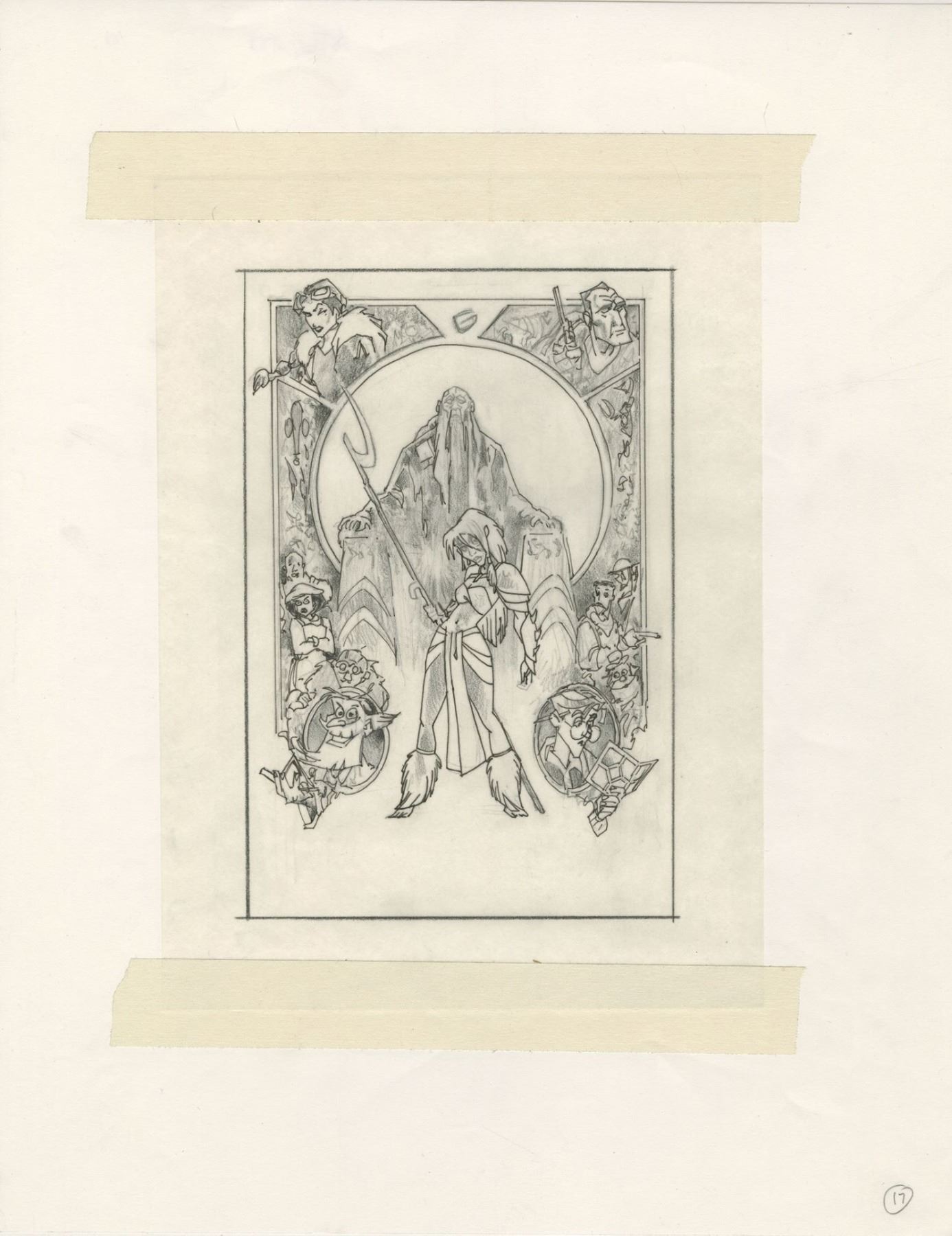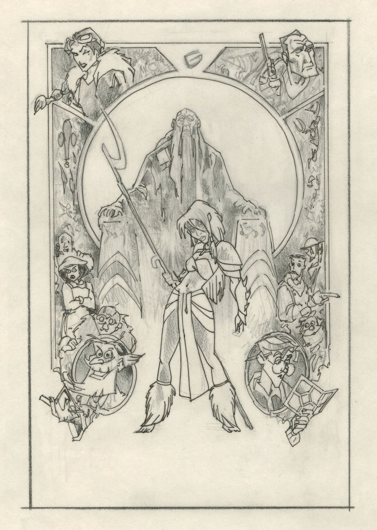 (Disney, 2001) An original promotional drawing created for Atlantis: The Lost Empire. The drawing is believed to have been created for merchandise or promotional purposes, and features the principal cast of characters including Milo and Princess Kida. The drawing is accomplished in pencil and ink on a 9.5"x7" vellum sheets that is taped to a 14"x11" sheet of paper. The condition is very good, and the paper is marked with a small "17" in the lower-right corner.