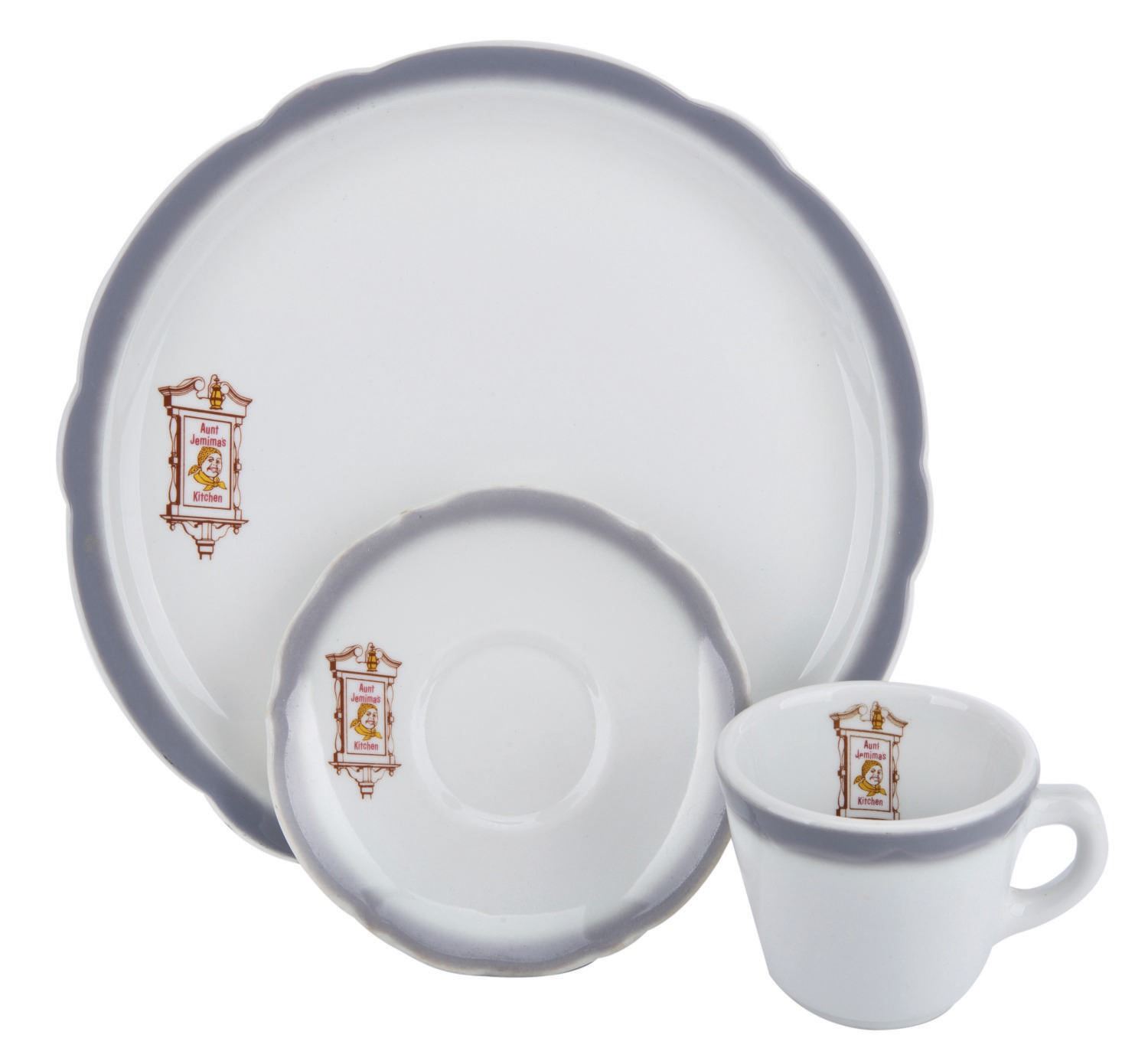 (Quaker Oats, 1950s-60s) A set including (1) vintage plate, (1) saucer and (1) coffee cup from Aunt Jemima's Kitchen restaurant. These dishes with the Aunt Jemima Kitchen logo were expressly used at their restaurants including Aunt Jemima's Old South Kitchen in Frontierland at Disneyland. The ceramic china plate and saucer Measure 10.25", and 5.5" in diameter, the ceramic coffee cup is 4.25"x3". All are in very good condition with scuffs and light wear from age and handling.