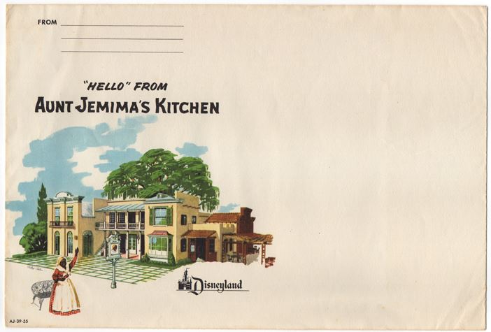(Disneyland, 1963) Extremely rare mailing envelope for sending souvenir menus from Aunt Jemima’s Kitchen. Measuring 6.5 x 9.5 in. and in fine condition overall.