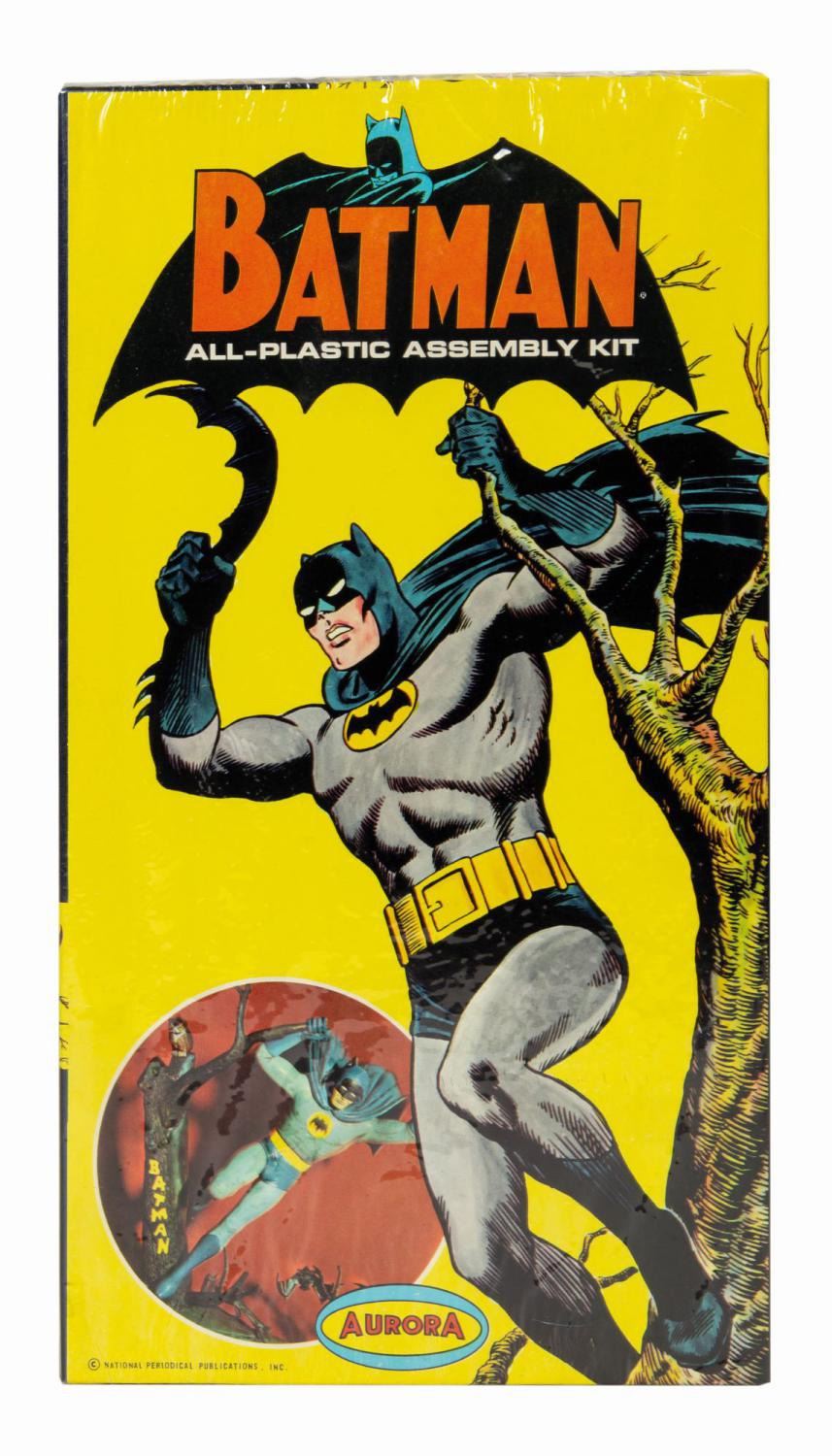 (Aurora, 1964) An incredibly rare factory-sealed Aurora model kit depicting Batman. This popular kit debuted at a very significant time in Batman history. The toy was based on the newly redesigned appearance of Batman within the comic series, and was sold between 1964-65, shortly before the January 1966 debut of the Batman television series which would cause "Batmania" to sweep the nation. The kit is scarce in any condition, with a still factory-sealed versions such as this being a true Aurora and Batman artifact. The box measures 13"x7.25" and 2.25" thick. It is in very fine condition.