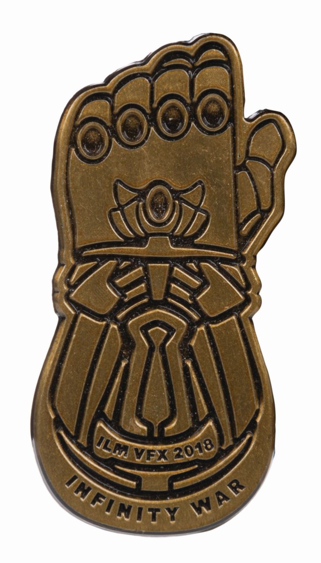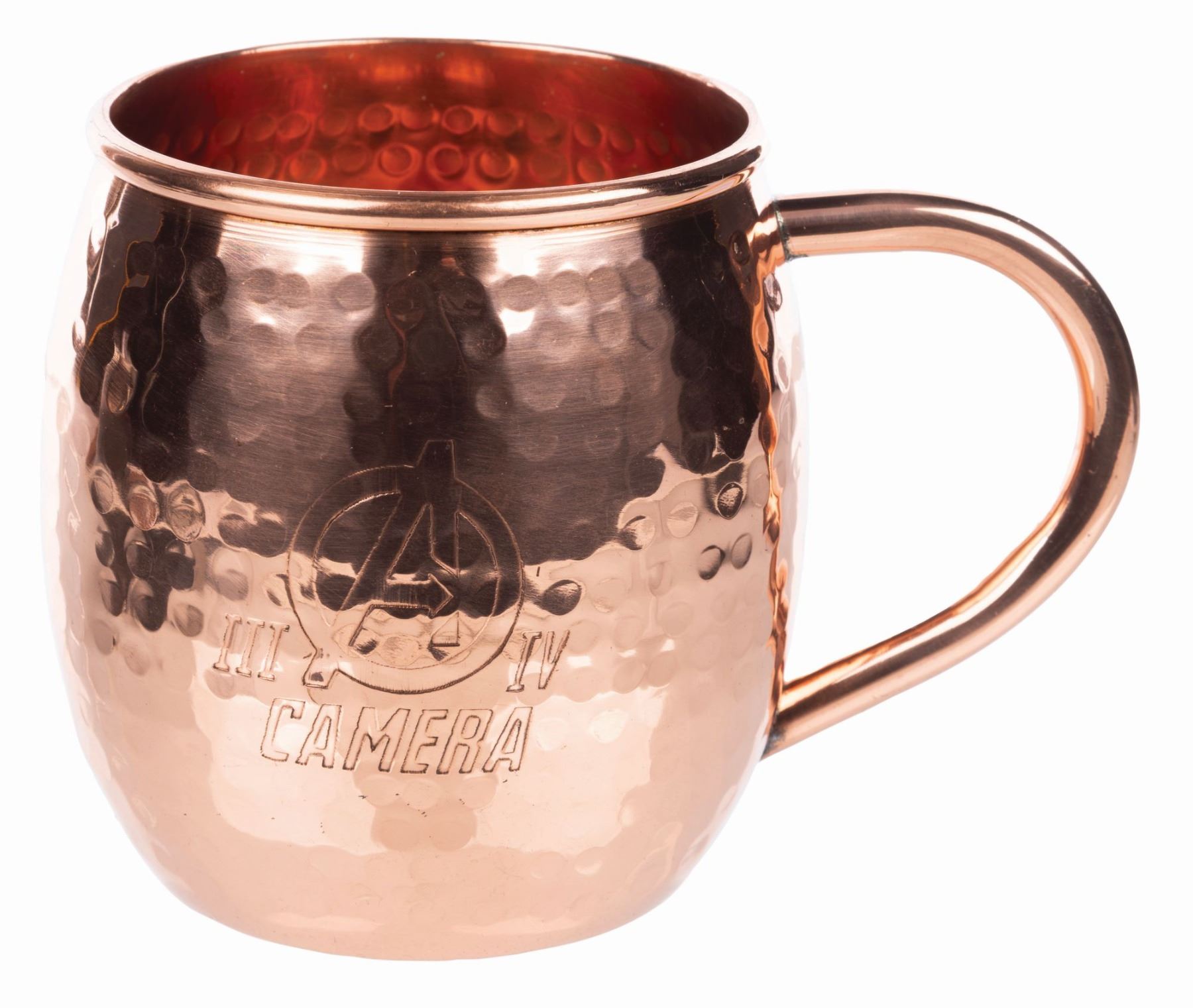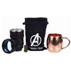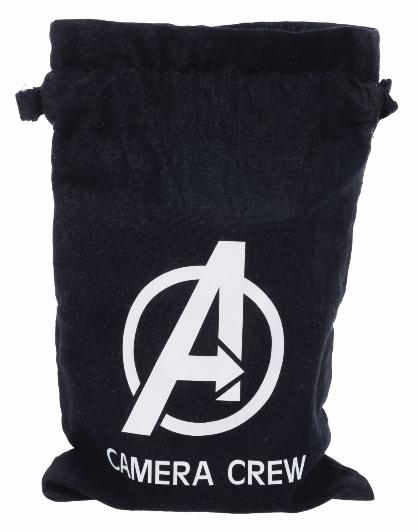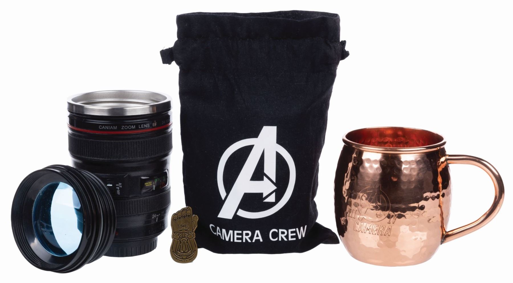 (Disney, 2018-19) A collection of "Avengers: Infinity War” and "Endgame” camera crew gifts. Included are a crew-exclusive copper mug and pin, and a camera-lens-shaped mug. The crew mug is etched with the Infinity Gauntlet on one side and the Avengers "A” logo with "III – IV Camera” on the other. The pin depicts the Infinity Gauntlet and reads "ILM VFX 2018 Infinity War.” The plastic "lens” mug seals with a screw-on lid and comes in an "Avengers Camera Crew” drawstring bag. Measuring 3.75" tall, the copper mug and 1.75” mug are in fine condition. The lens mug measuring 3.25” in diameter x 5.5” high is in very good condition with very light handling wear.