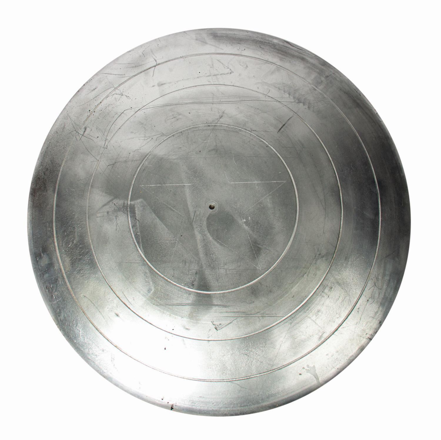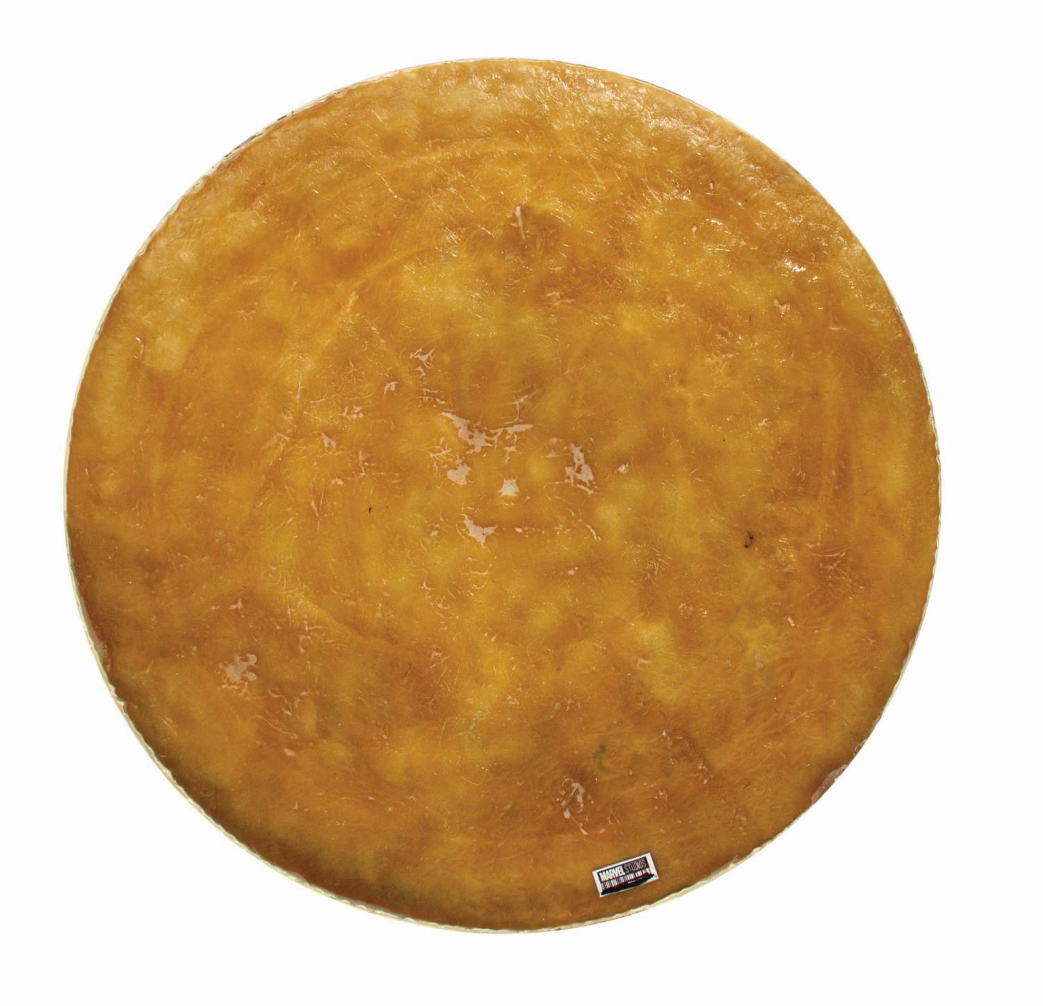 (Marvel, 2012) A production made signature Captain America “Vibranium” shield from The Avengers. Constructed of cast fiberglass resin painted metallic silver, the front of the shield shows traces of the typical rings and central star of the finished examples, and the reverse is entirely unfinished. While metal shields were used for hero shots in Captain America: The First Avenger, the Prop Master on Avengers preferred a fiberglass shield as it was lighter and less prone to accidental damage. Additional shields would have been created and available for detailing as needed. This piece is likely a test pull or an unfinished alternate. Measuring 24” in diameter, the shield is in production used good condition with scattered surface scuffs and scratches. The reverse retains a Marvel Studios barcode label.
