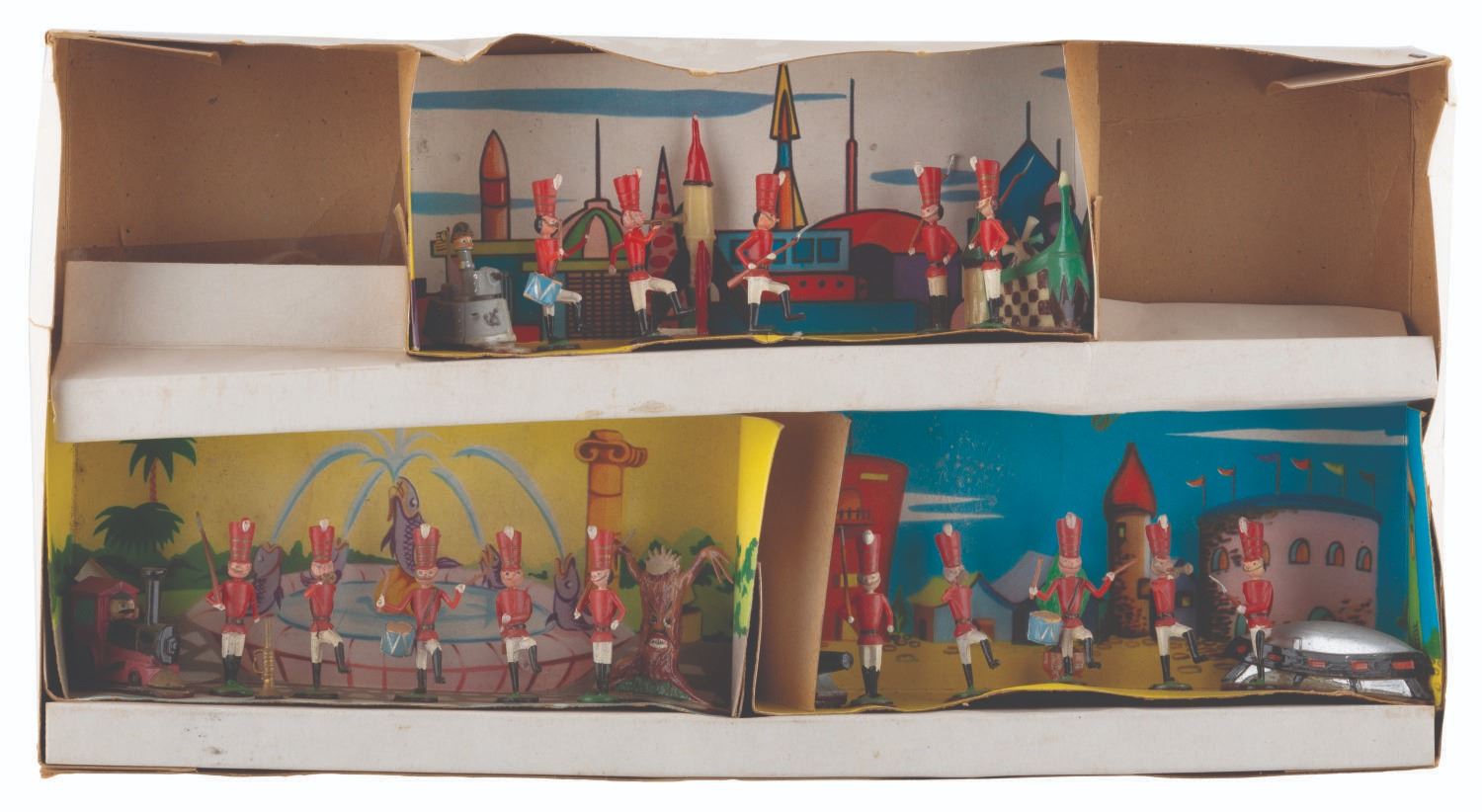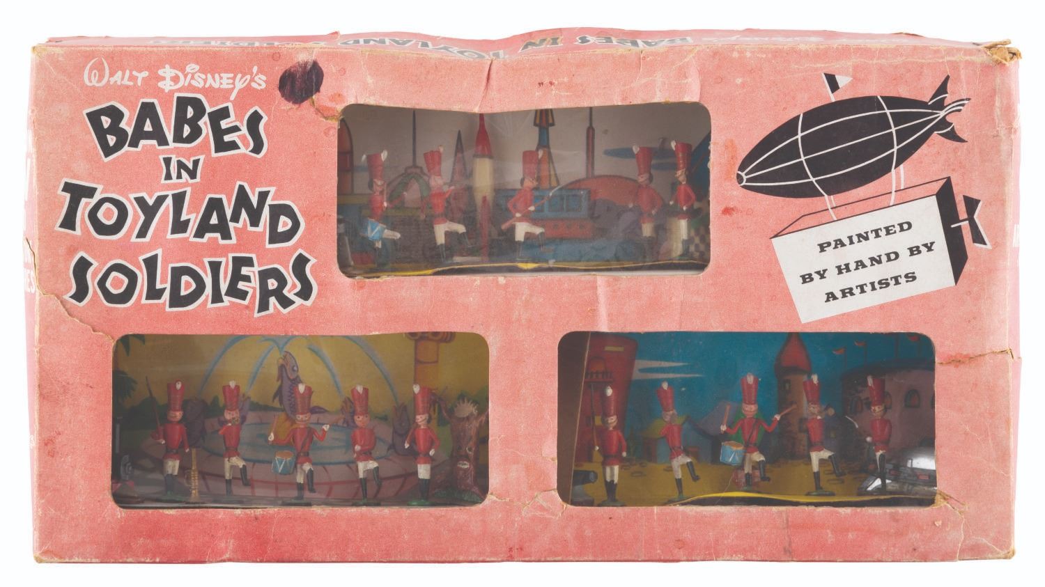 (Marx, 1961) Three sets of hand-painted Disneykins based on Walt Disney’s “Babes in Toyland,” all housed in one package. These are three of the six scenes released in the series play sets collection. Included are the Toyland Scene with Spaceport, Toyland Scene with Coliseum, and Toyland Scene with Fountain sets. Measuring 1.5” tall each, the Disneykin soldiers are in good to very good condition with paint loss and wear, while the 12.25” x 1.5” x 6.5” original box is in fair condition with heavy tears, creases, warping, tape residue, crushed windows, stains, and discoloration from age.