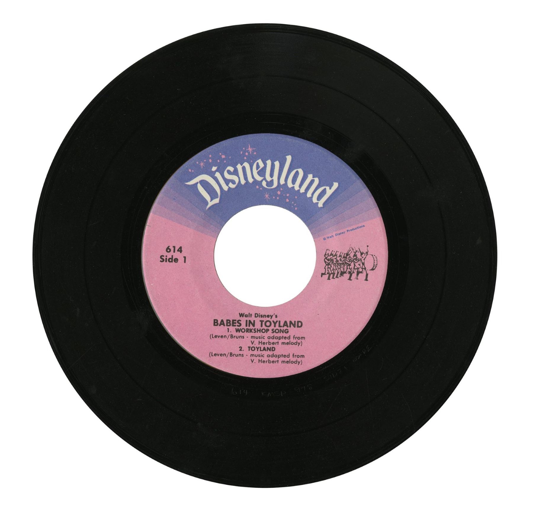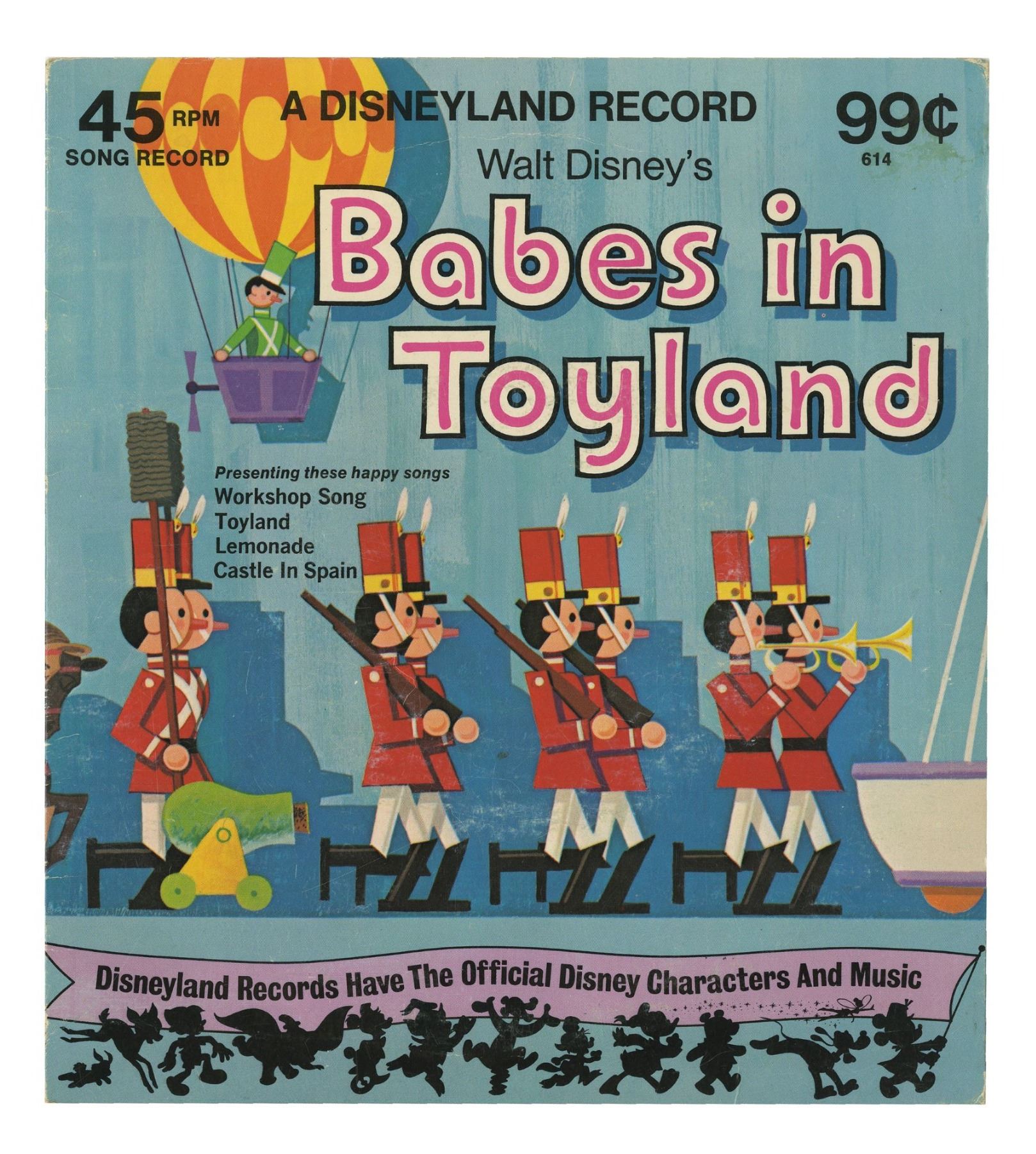 (Disneyland, 1975) A souvenir 45rpm record featuring songs based on Babes in Toyland. The record measures 8"x7.25" within its original paper sleeve. The condition is very good overall with some small amounts of wear to the sleeve from use.