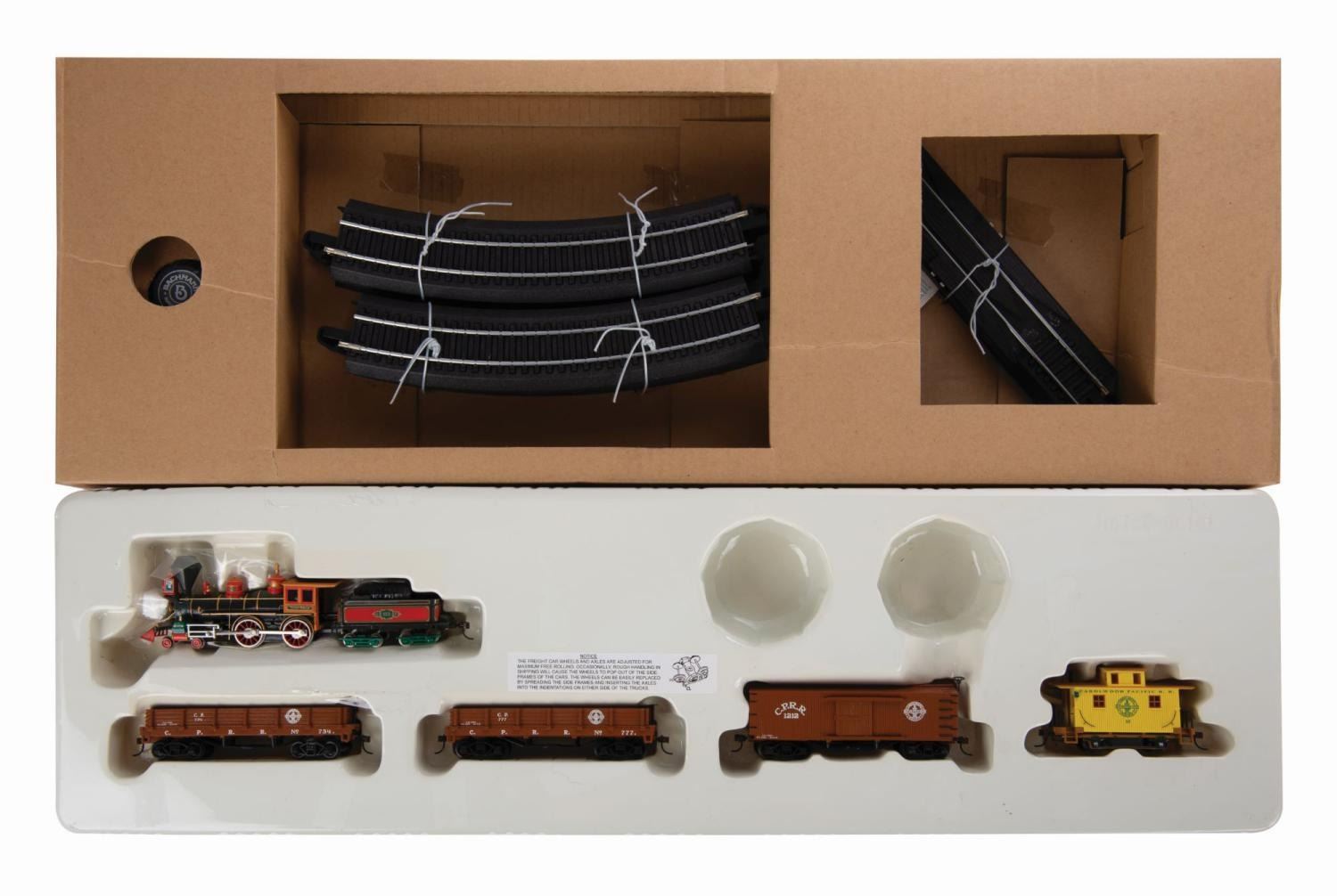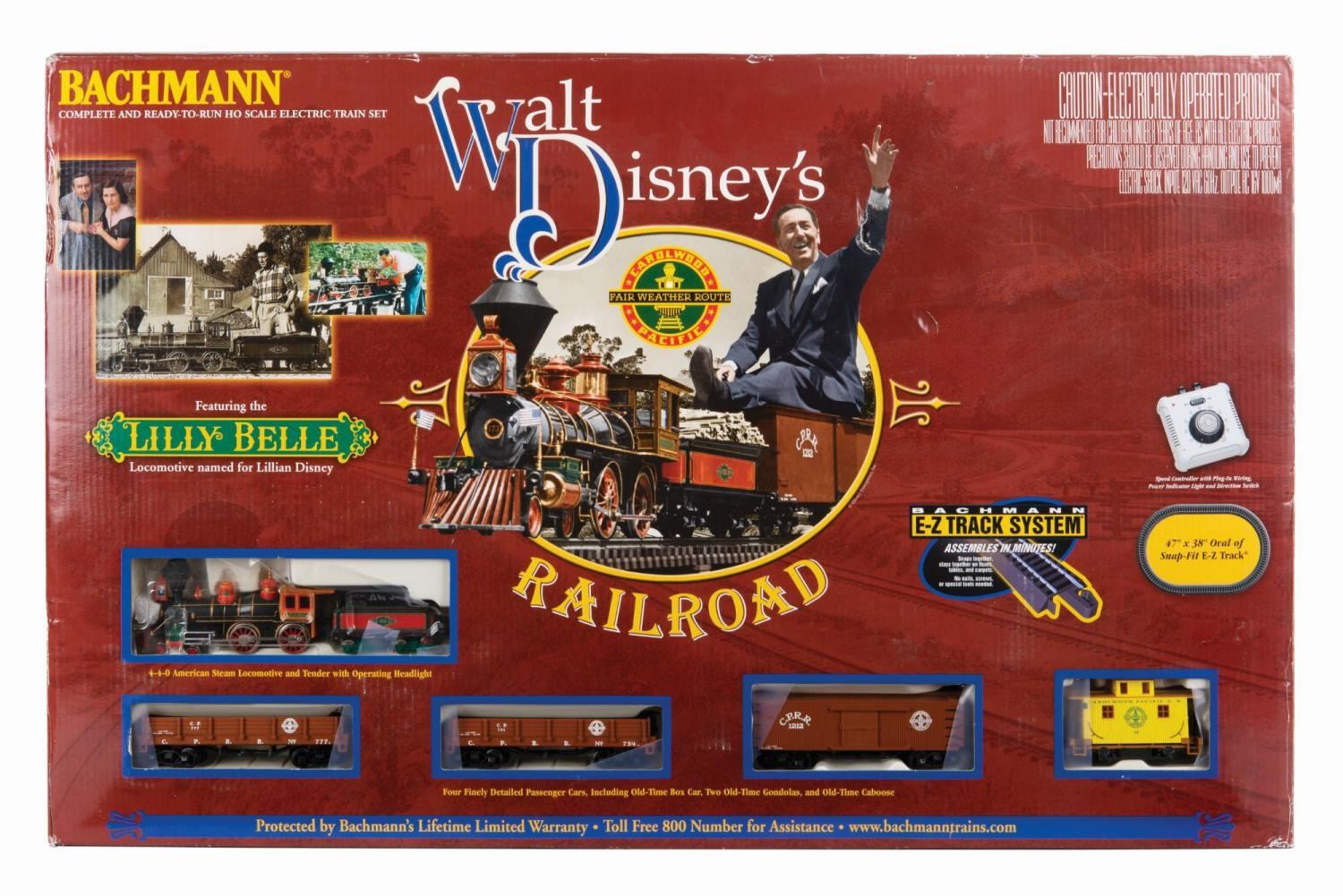 (Bachmann, 2007) An HO 1/87 scale electric train set manufactured by Bachmann recreating the engine and stock of Walt Disney’s backyard Carolwood Pacific Railroad. The set includes a replica of the iconic “Lilly Belle” American 4-4-0 steam locomotive and tender, one box car, two old-time gondolas, and a bobber caboose. Also included are a power pack and speed controllers, one plug-in terminal retailer, and a thirteen-piece snap-together track measuring 47” x 38” when assembled. The train set is in presumed fine, as-new condition with all components including the illustrated instruction manual, housed in the original 17.75” x 27.75” and 3” deep box. The box exhibits some surface scuffs, and edge and corner wear.