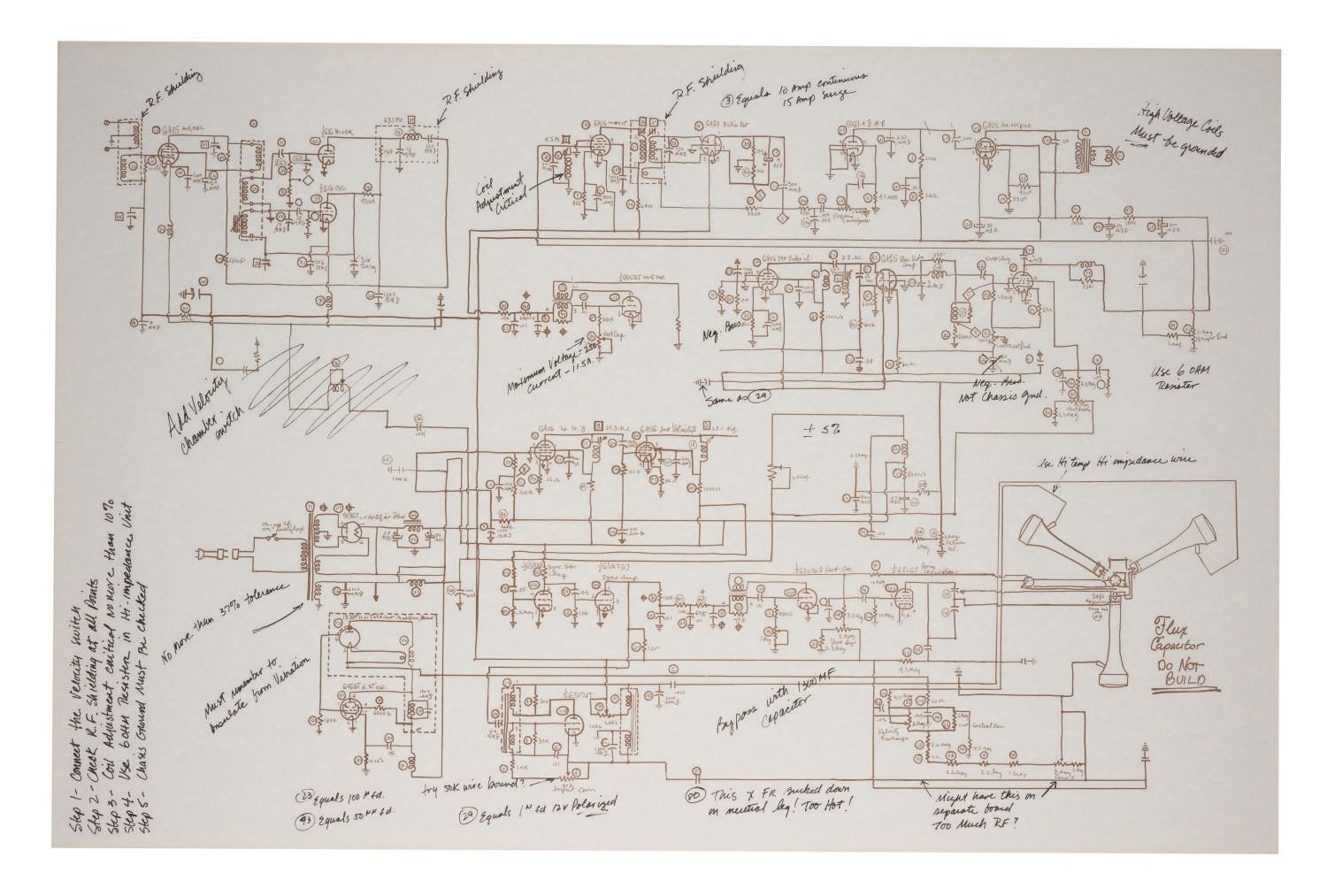 (Universal, 1990s) A Back to the Future III Flux Capacitor schematic print. This custom print of the Flux Capacitor Blueprint was prepared for the production of Back to the Future III. The print was made to look like an electrical diagram schematic with details and differs slightly from the prop seen on screen. Measuring 23"x35", the print has been stored rolled and displays in fine condition.