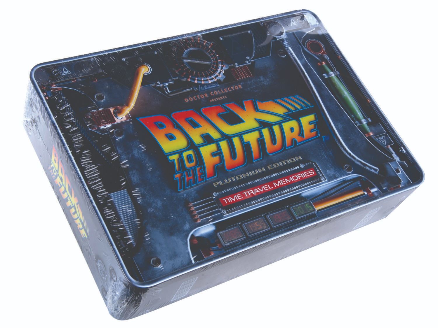 (Universal/Amblin/Doctor Collector, 2021) A sealed Time Travel Memories Platinum Edition collection of (36) prop reproductions from the Back to the Future films. Included within the collectible tin are the distressed"OUTATIME" license plate, a map of Hill Valley in 1885, a Save the clock Tower ribboned badge, and many more prop reproductions from the 1885, 1955, 1985, and 2015 settings of the films. Measuring 12"x8.5"x2.75", the set is in fine condition, sealed.