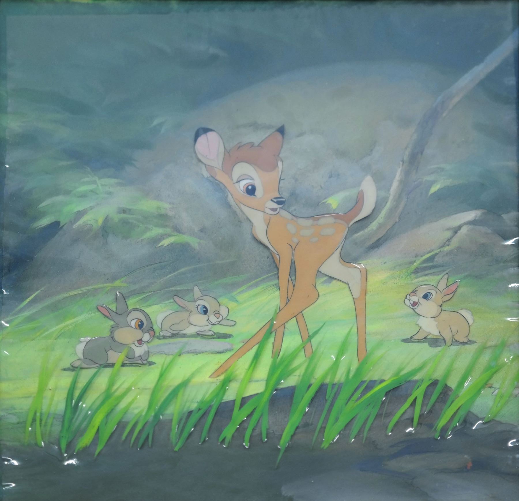 (Walt Disney Studios, 1942) A stunning original cel and production background setup featuring Bambi, Thumper, and Rabbits from "Bambi". The cels have been trimmed and applied to an original production background from the film as prepared by Courvoisier Galleries for sale. The setup also includes a cel overlay of grass. The entire piece measures 11"x9" and still retains its original Courvoisier Galleries label on the reverse. Cels are in excellent condition.