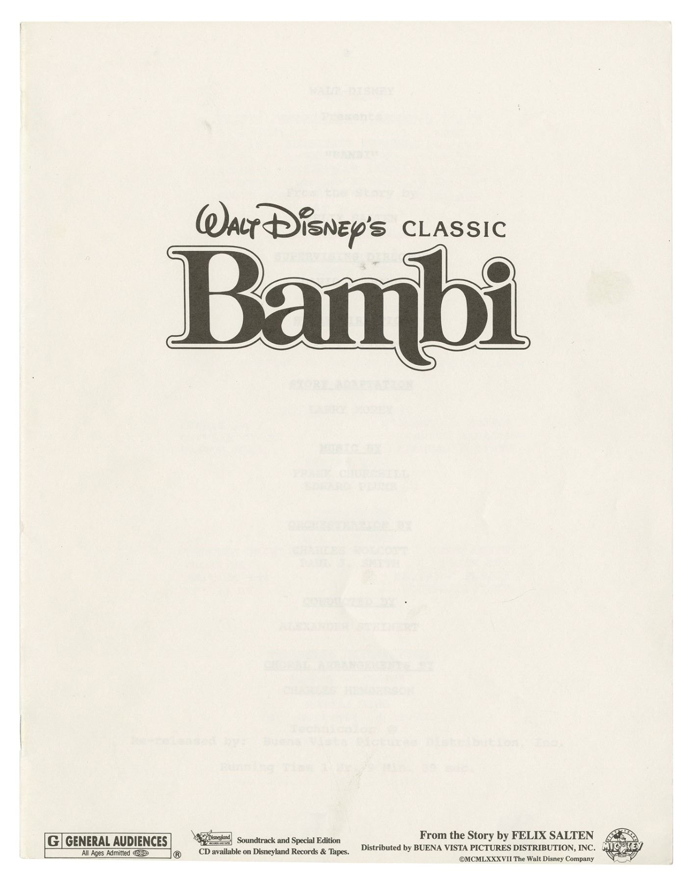 (Disney, 1982) A press book created for the theatrical re-release of Walt Disney's Bambi. This book contains information on the production crew, voice cast, and a description of the story. The book is signed by Peter Behn, the voice of Young Thumper, on the inner page that describes the character. The 24-page book measures 11"x8.5" and is in very good condition with minor wear along the edges.