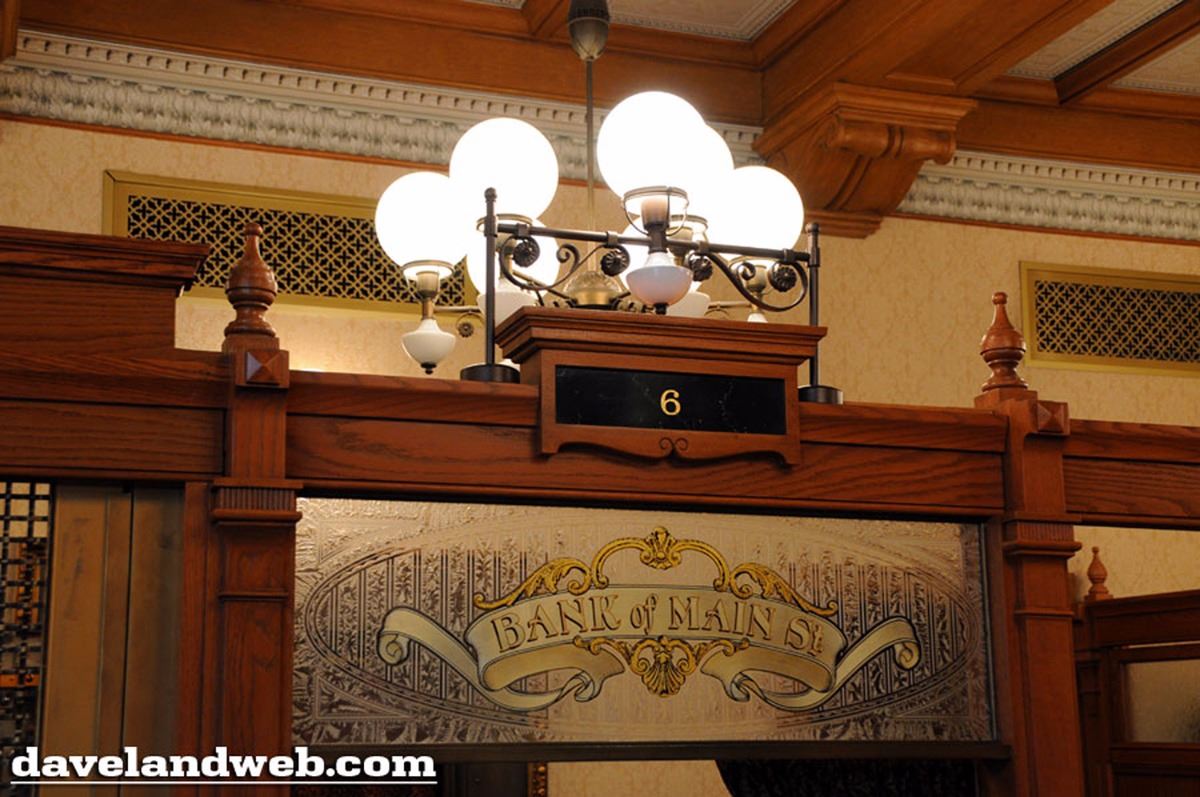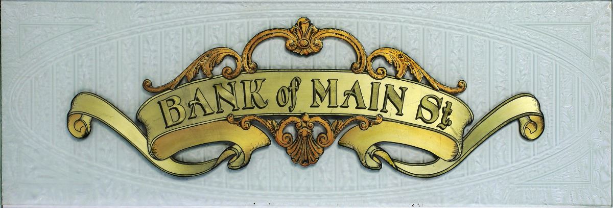 (Disneyland, 1990s) Beautiful etched glass panel that hung above a teller window in Disneyland's Bank of Main Street. Originally a Bank of America when Disneyland opened in the 1950s, the bank was converted to an annual pass center in the early 1990s. Panel measures 37.5"x12". In fine condition with only light wear.