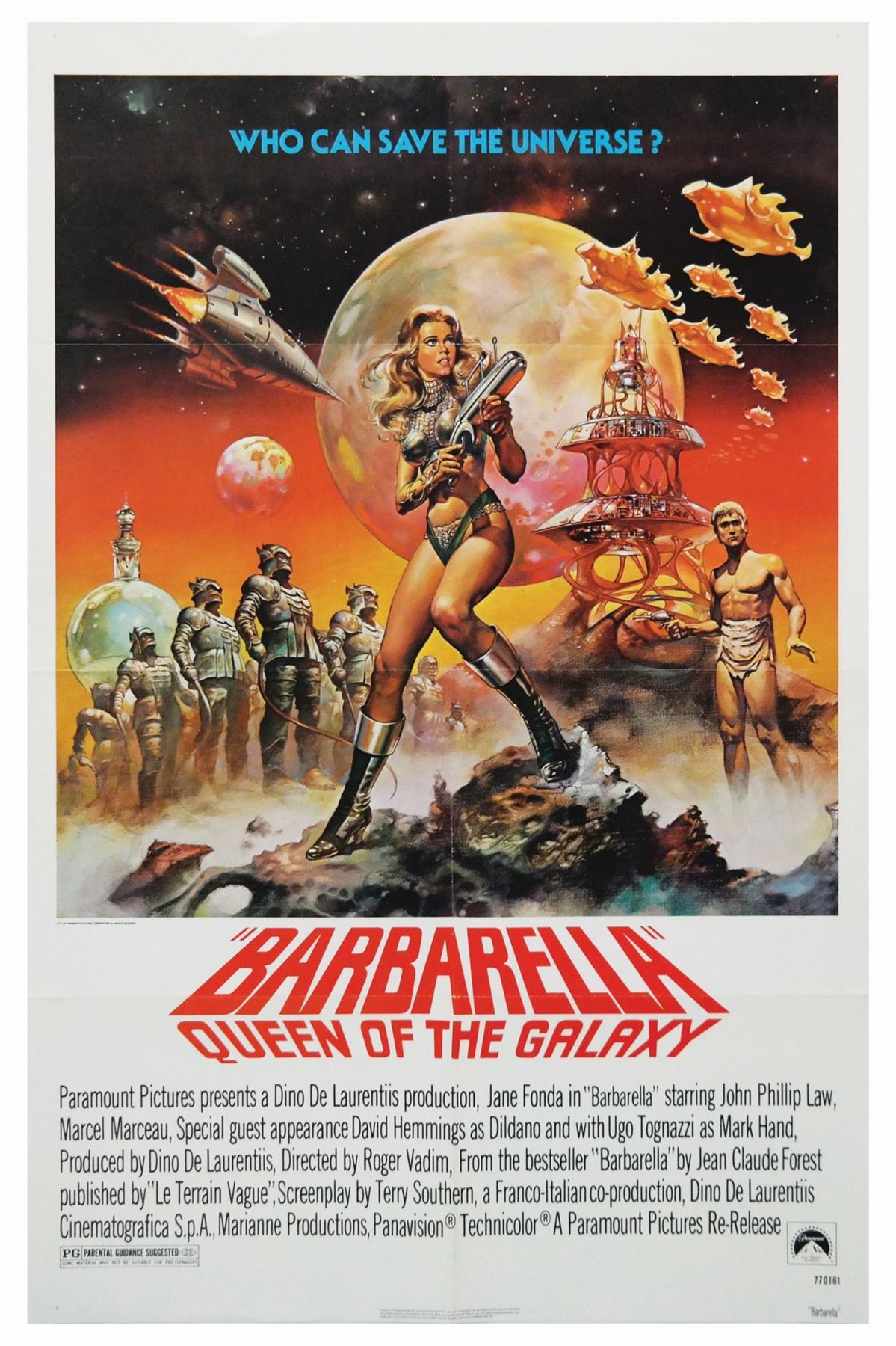 (Marianne Prod., 1977) A rare one sheet poster for the theatrical re-release of the 1968 Jane Fonda film Barbarella, titled Barbarella: Queen of the Galaxy. Measuring 41"x27", the poster is in good condition with minor wear along the original fold lines and edges.