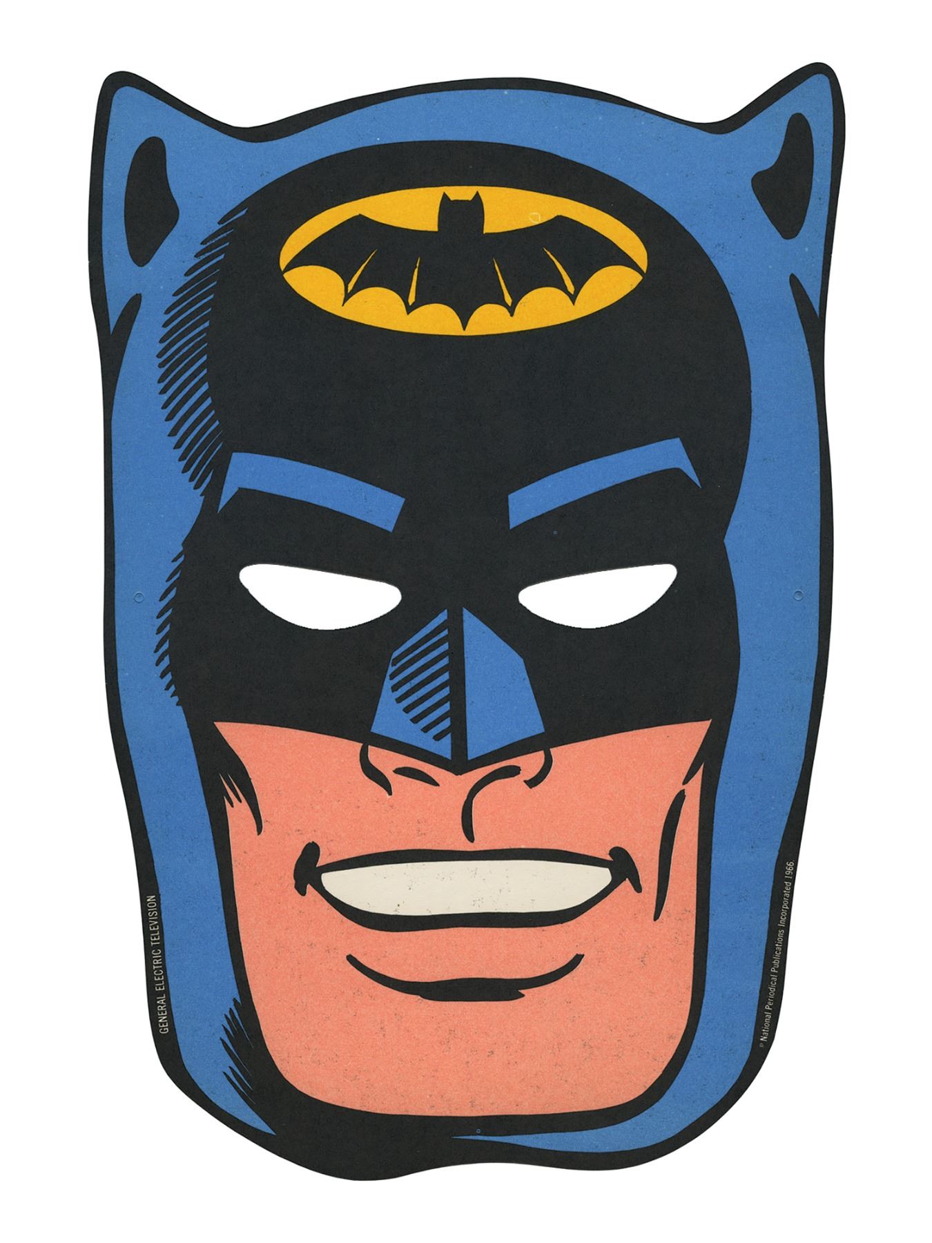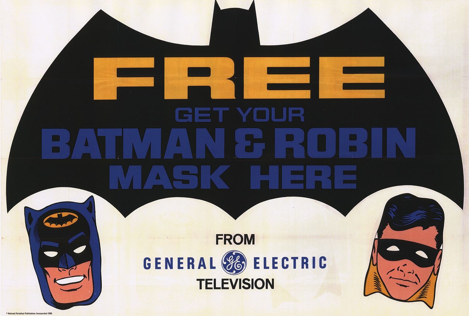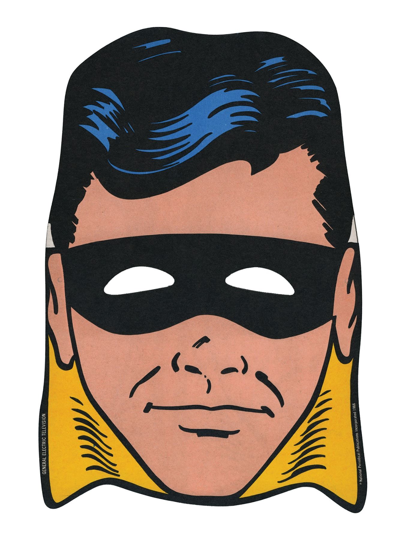 (General Electric, c.1966) A vintage promotional paper Batman mask provided by General Electric in the mid-1960s. The mask is double-sided and depicts both Batman and Robin. Included with the mask is the original string for wearing the mask, and a reproduction of a General Electric promotional poster for the masks. The poster measures 11"x17" and the mask itself measures 11"x7". The condition is very good with minor wear to the mask.