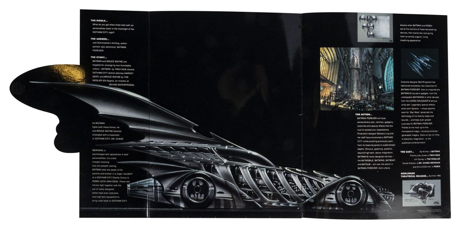 (Warner Bros., 1994) A stylish press folder for Batman Forever. The folder cover features the Riddler's question mark which keeps the cover closed with velcro. The inside of the folder opens up to reveal a large Batmobile image with concept art and information about the upcoming film. The packet measures 12"x9" closed and 12"x26" opened, and the condition is good with some wear and smudging to the glossy cover from use. The folder likely originally contained a few loose sheets of information, however this folder does not have any additional materials inside.
