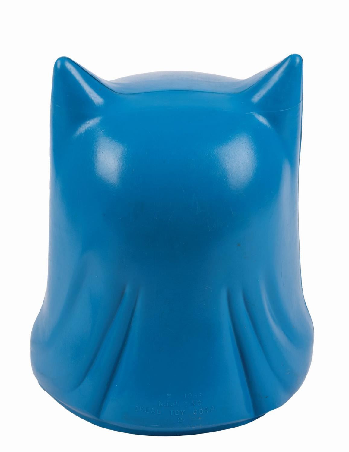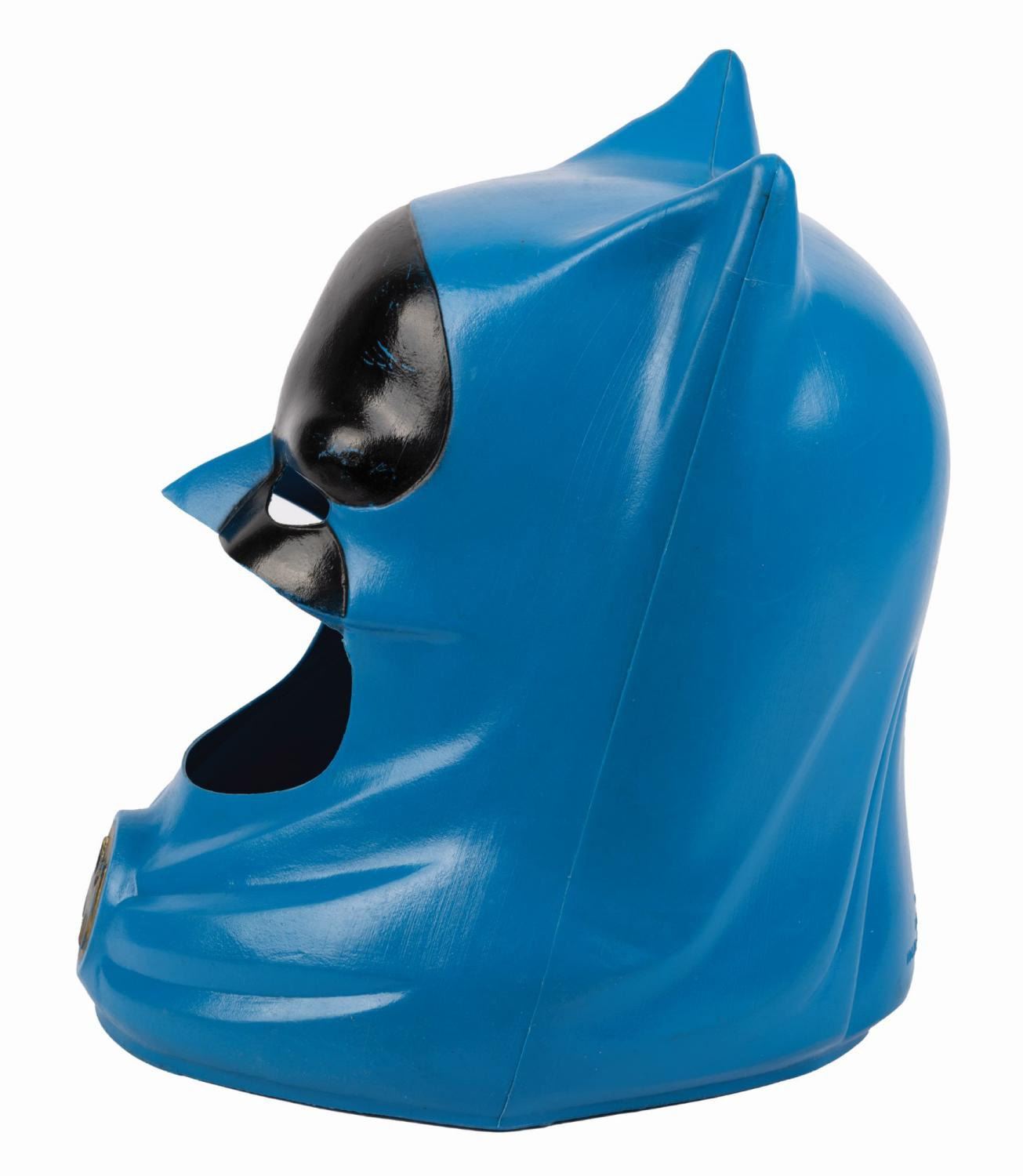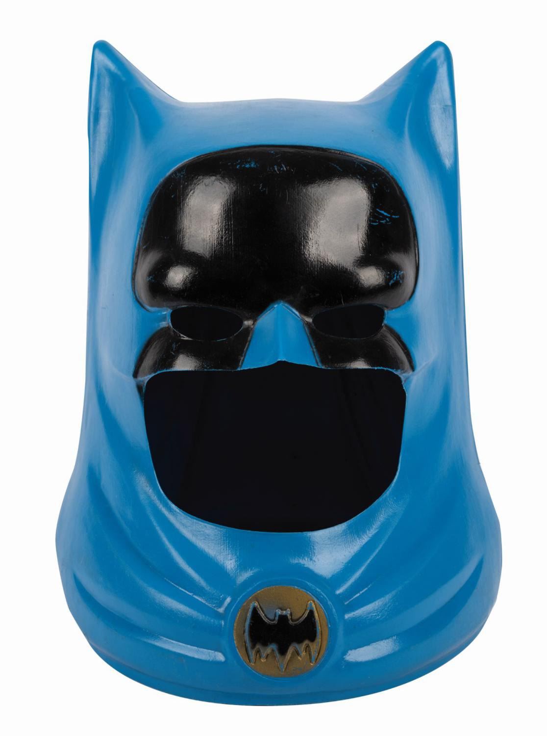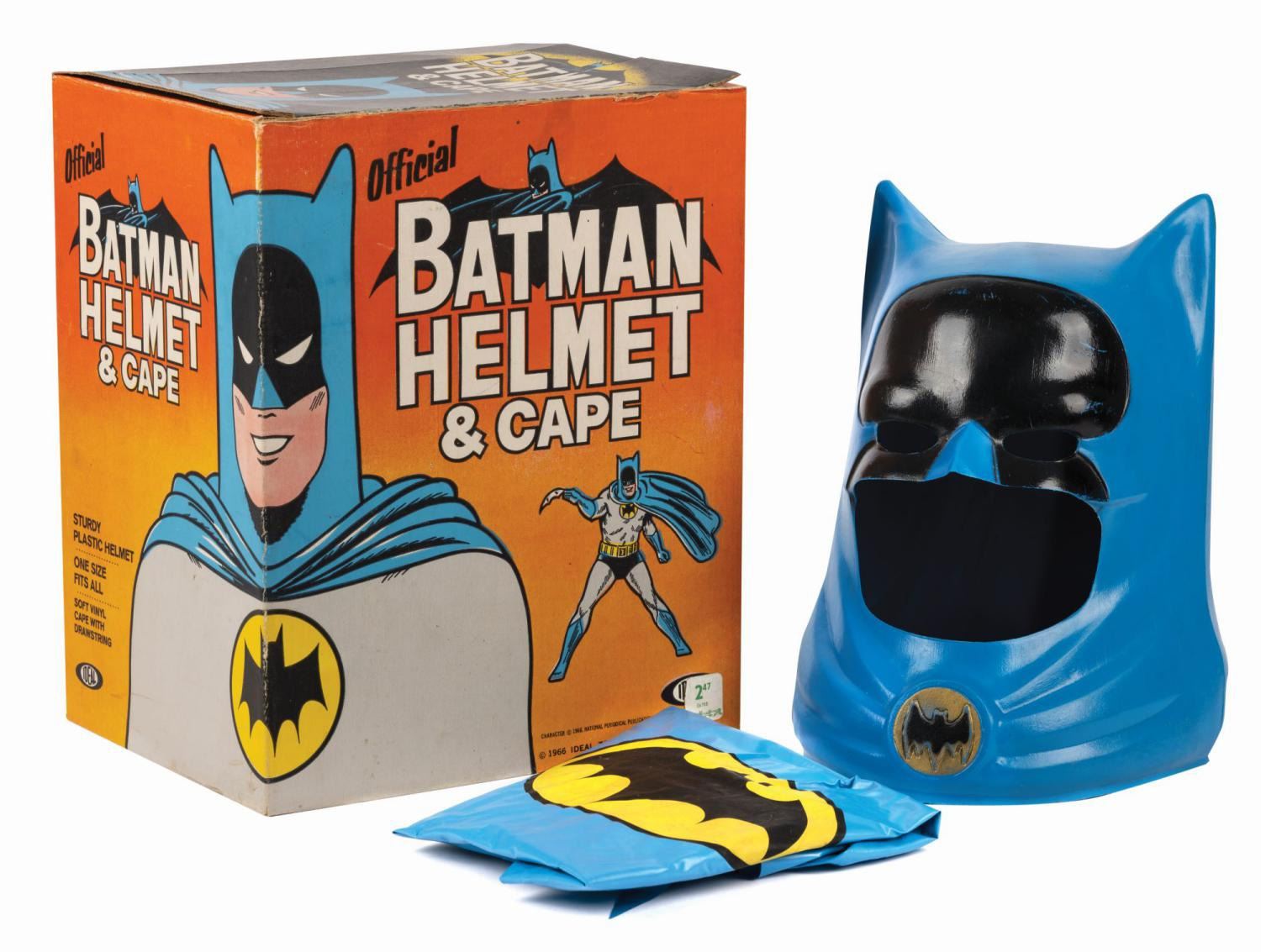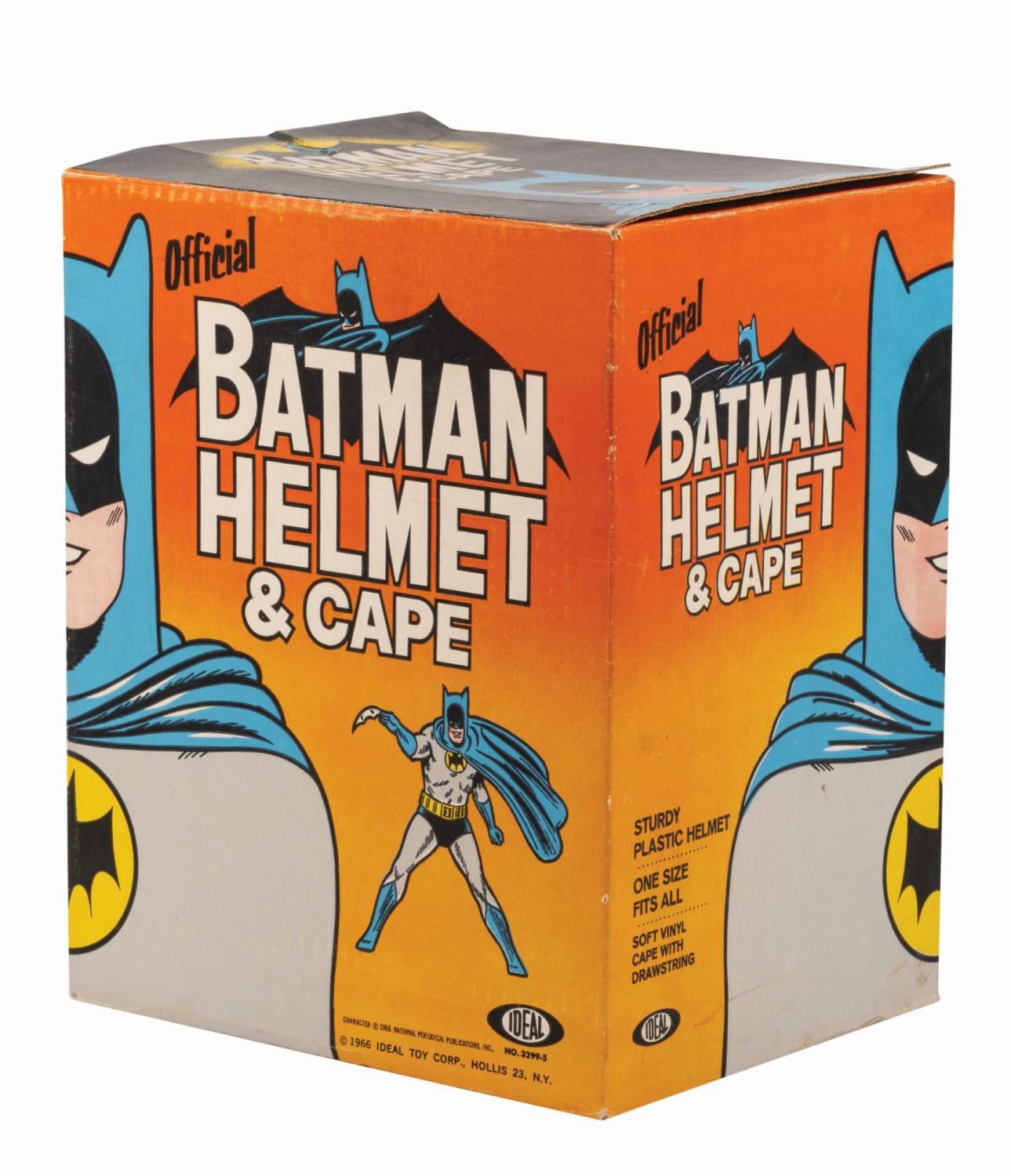 (Ideal, 1966) A rare unused Official Batman Helmet & Cape by Ideal. The set features one Batman cowl with pads, soft vinyl cap, and instructions. Measuring "one-size-fits-all" the 12.5"-tall cowl is in fine condition exhibiting , the 25"-long cape presents in fine unused condition. All pieces are packaged inside the original very good condition box.