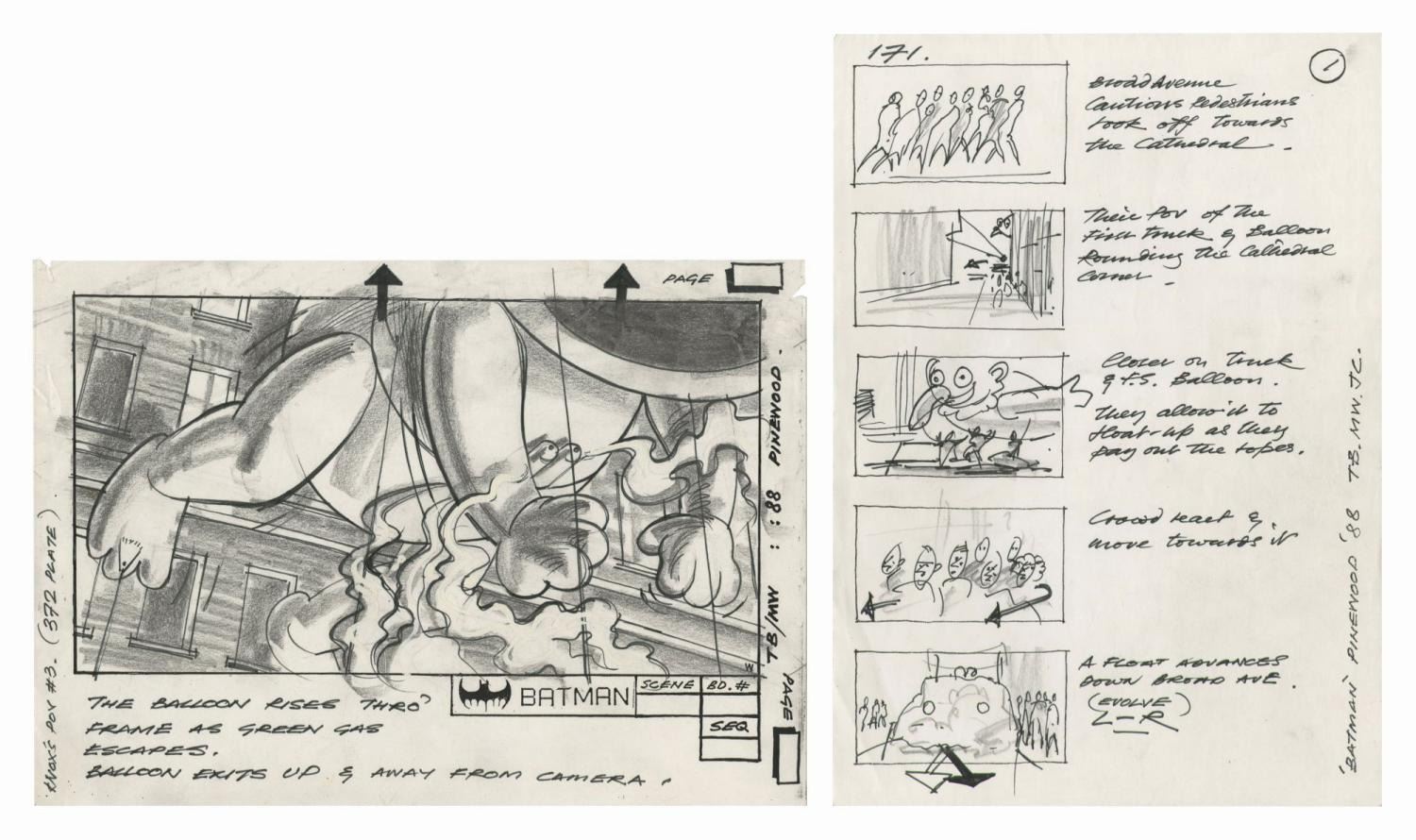 (Warner Bros., 1989) An original illustrated storyboard page and an original illustrated storyboard sequence page from Tim Burton’s Batman. The illustrated page, titled “Knox’s Pov #3,” contains a large panel featuring the Joker’s parade balloon spewing gas with the hand-written caption, “The balloon rises thro frame as green gas escapes. Balloon exits up & away from camera.” The sequence page is titled “171” and features four panels depicting the pandemonium as the balloons poison the parade crowd. Accomplished in graphite and ink on 11.75”x8.25” drawing paper, the pages are in very good condition, exhibiting some corner creases, edge chipping, and graphite smudges from production handling.