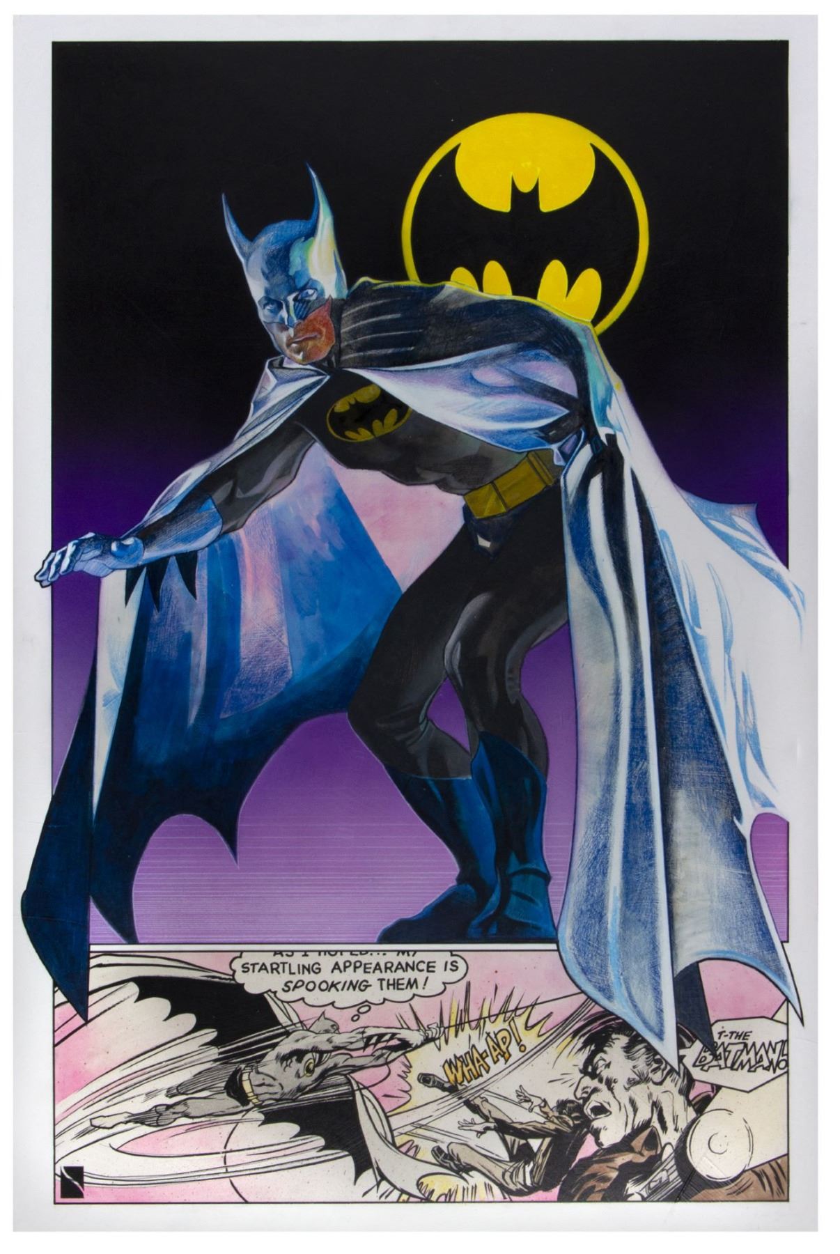 (Thought Factory, 1977) An extremely rare original painting of the classic DC Comics superhero "Batman”. The artwork features a more realistic depiction of the character at top, and a more traditional comic-panel style representation at the bottom. This original artwork was created and used in a popular series of collectible posters that were marketed by a partnership between Thought Factory and Bill Wallen, with this poster artwork coming from Wallen's personal collection. Notably, renowned poster artist Drew Struzan worked on stages of this dynamic poster including its early conceptual designs. The artwork is composed of primarily airbrush and acrylic, and the lower-left corner features Struzan's stylized gestalt "S" logo which pays respect to Struzan for his contributions towards the creation of the final poster. Measuring 33.5"x22.25" on sturdy art board, the original painting is in very fine condition with little wear. There are a few thin creases in the artwork that are difficult to see, however these small creases can actually be seen in the final poster, and did not occur after the artwork's initial use. The Thought Factory superhero posters were very popular when they debuted in 1977, with surviving examples becoming difficult to find. This is the first time the original artwork for these exceptional posters has ever been offered for public sale.