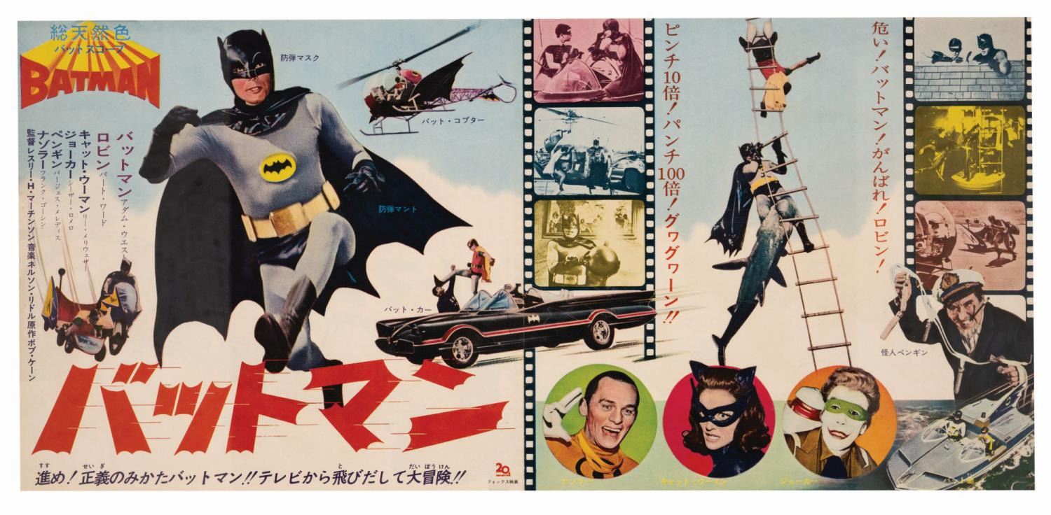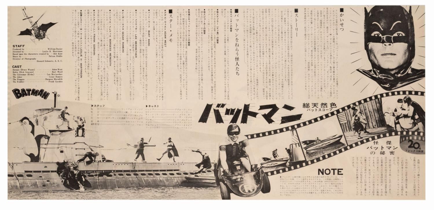 (20th Century Fox, 1966) A rare poster produced for the Japanese release of Batman: The Movie. Batman's greatest foes unite in this cinematic souvenir featuring Japanese text, stylized movie scenes, and character portraits. Measuring 9.5"x10.25" the poster is in fine condition with light wear along edges, corners, and original folds.