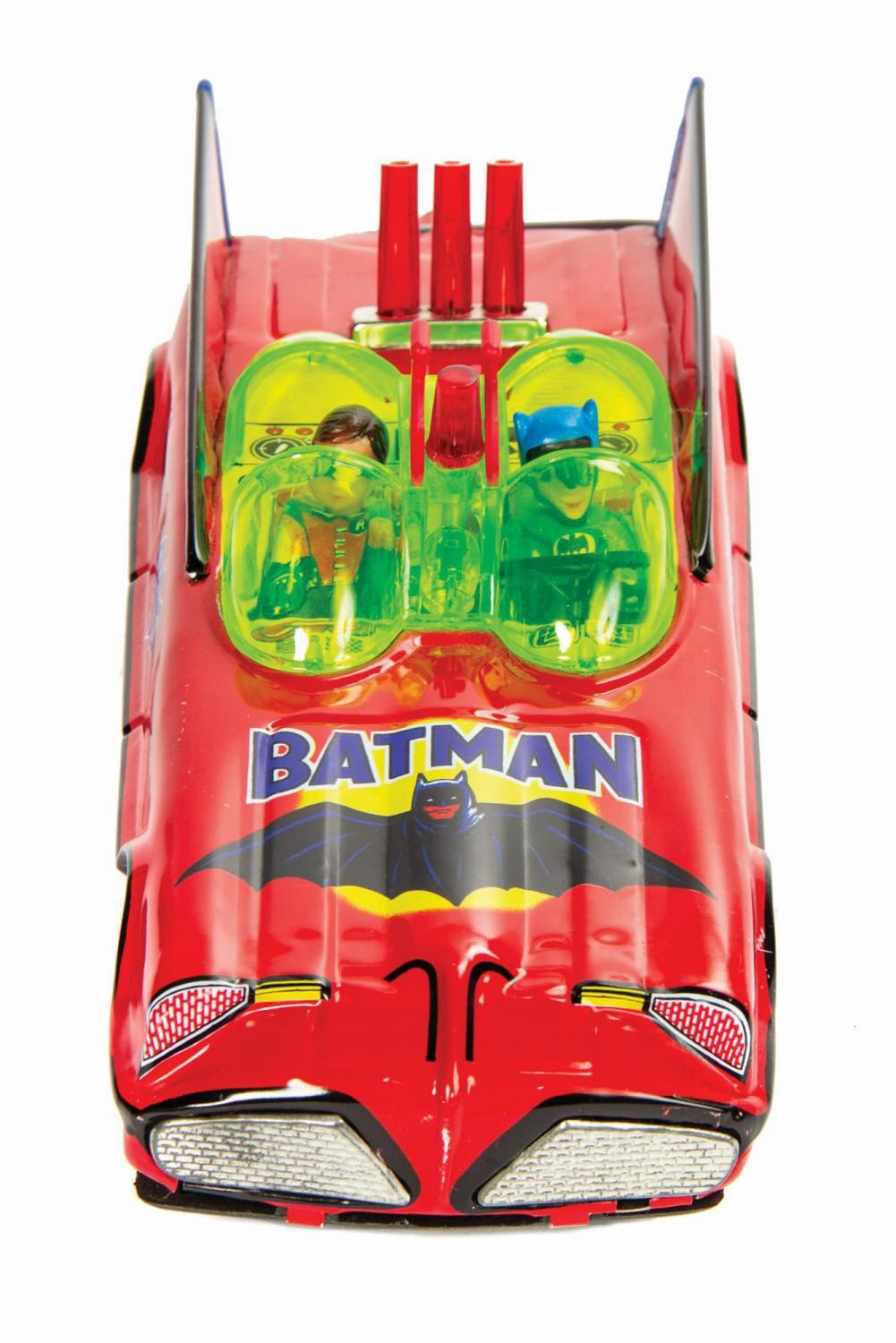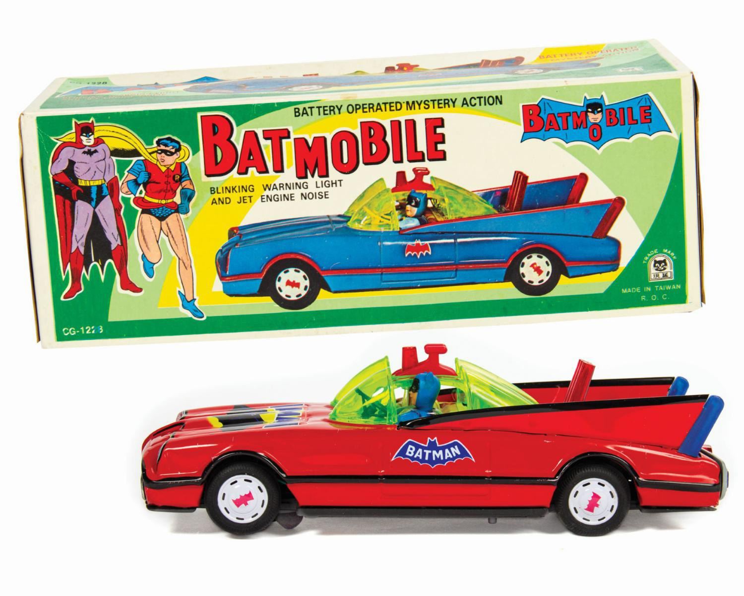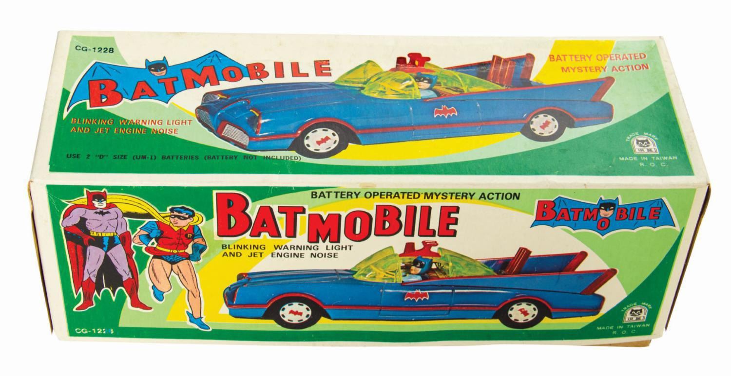 (Cien Ge Toys, 1966) A vintage tin lithographic Batmobile with battery powered blinking lights and "mystery action" manufactured by Cien Ge Toys. The "mystery action" consists of a turntable with two wheels on the bottom of the car between the front tires that spins in a circular motion when the slider switch is turned "On." The resulting sound is described on the packaging as "jet engine noise" and the motion calls to mind the extravagant "Bat Turn!" sequence of the Adam West TV show. The electronics have been tested and are in working order. The toy retains its original cardboard box packaging replete with Batman and Robin graphics. The car measures approximately 12.5" long and is in fine condition with only some tiny nicks and scratches to the paint. The packaging, measuring 4.5"x12.5" and 4.25" deep, is in very good condition with minor denting, creasing, and edge wear to the lid.