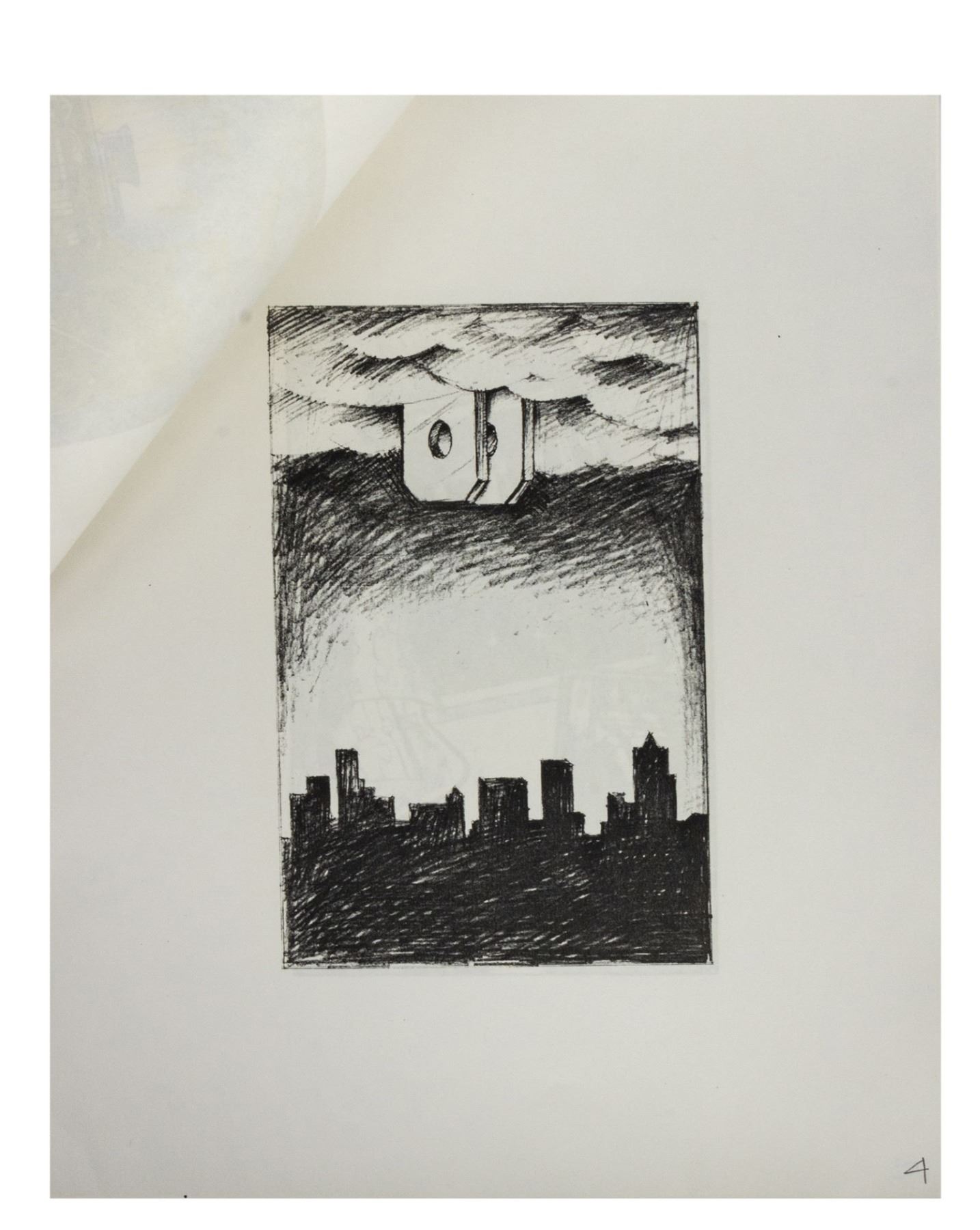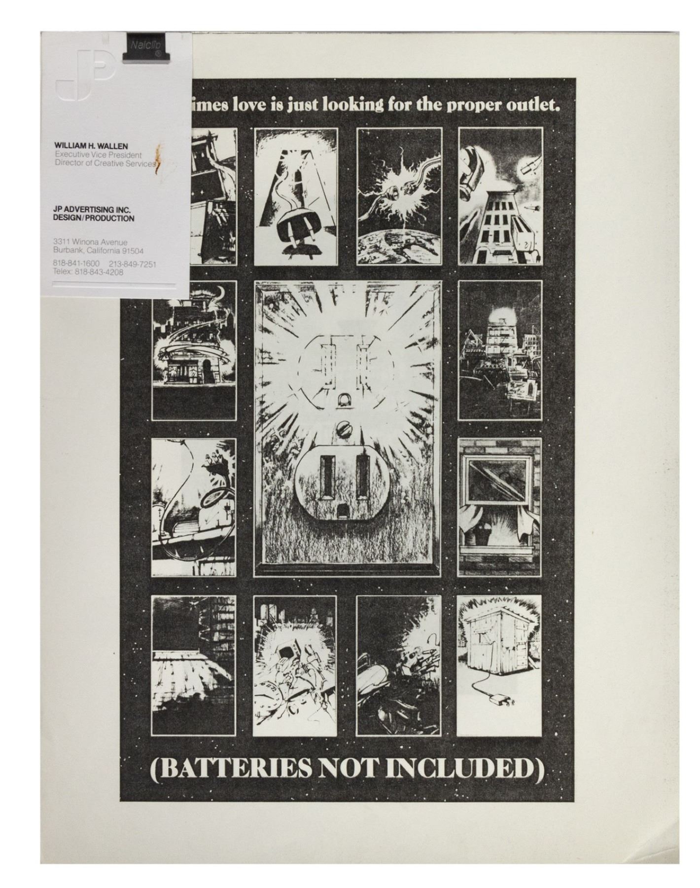 (Amblin, c.1987) A very rare internal packet created by JP Advertising Inc that features the many promotional concepts for Batteries Not Included. The (43) hand-numbered pages feature various printed concept designs in black and white that were designed to be used for film posters, advertisements, and other promotional materials. The pages measure 11"x8.5" and the packet is held together by a bracket in the top-left corner with a business card from William (Bill) Wallen. The condition is very good with little wear from use.