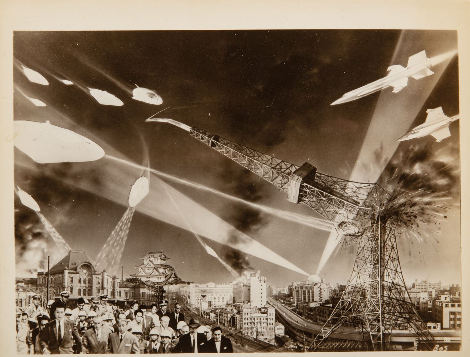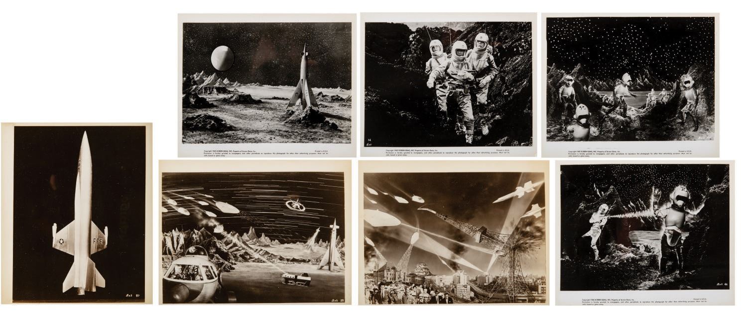 (Toho, 1959) A collection of (7) "Battle in Outer Space" promotional photos. Among the photos are images from the film featuring Natal saucers and invaders, and the United Nation's two SPIP rocket ships. Measuring approximately 7.75"x10", the photos are in very good condition, despite minor scuffs and light wear to edges and corners.