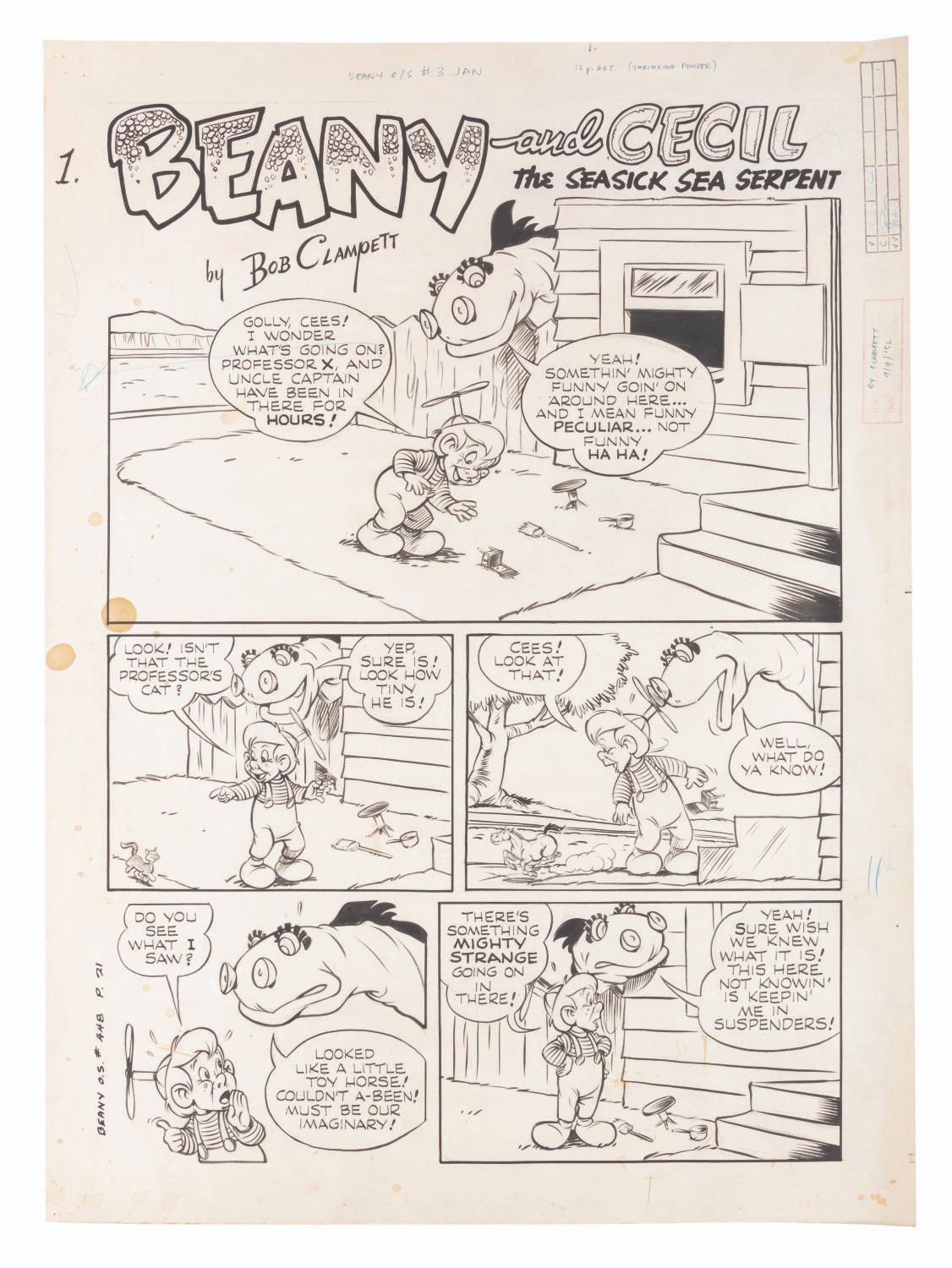 (Dell, 1952) A page of original comic book art by Jack Bradbury from Dell Four Color #448 featuring Beany and Cecil. This is the lead page to the third story in the comic, in which Beany and Cecil encounter a miniature horse. The margin is stamped with approval by Bob Clampett and dated September 9, 1952. Measuring 19” x 25.75”, the art accomplished in ink with some pencil marks is in good production-used condition with spotting, edge wear, and some discoloration from age.