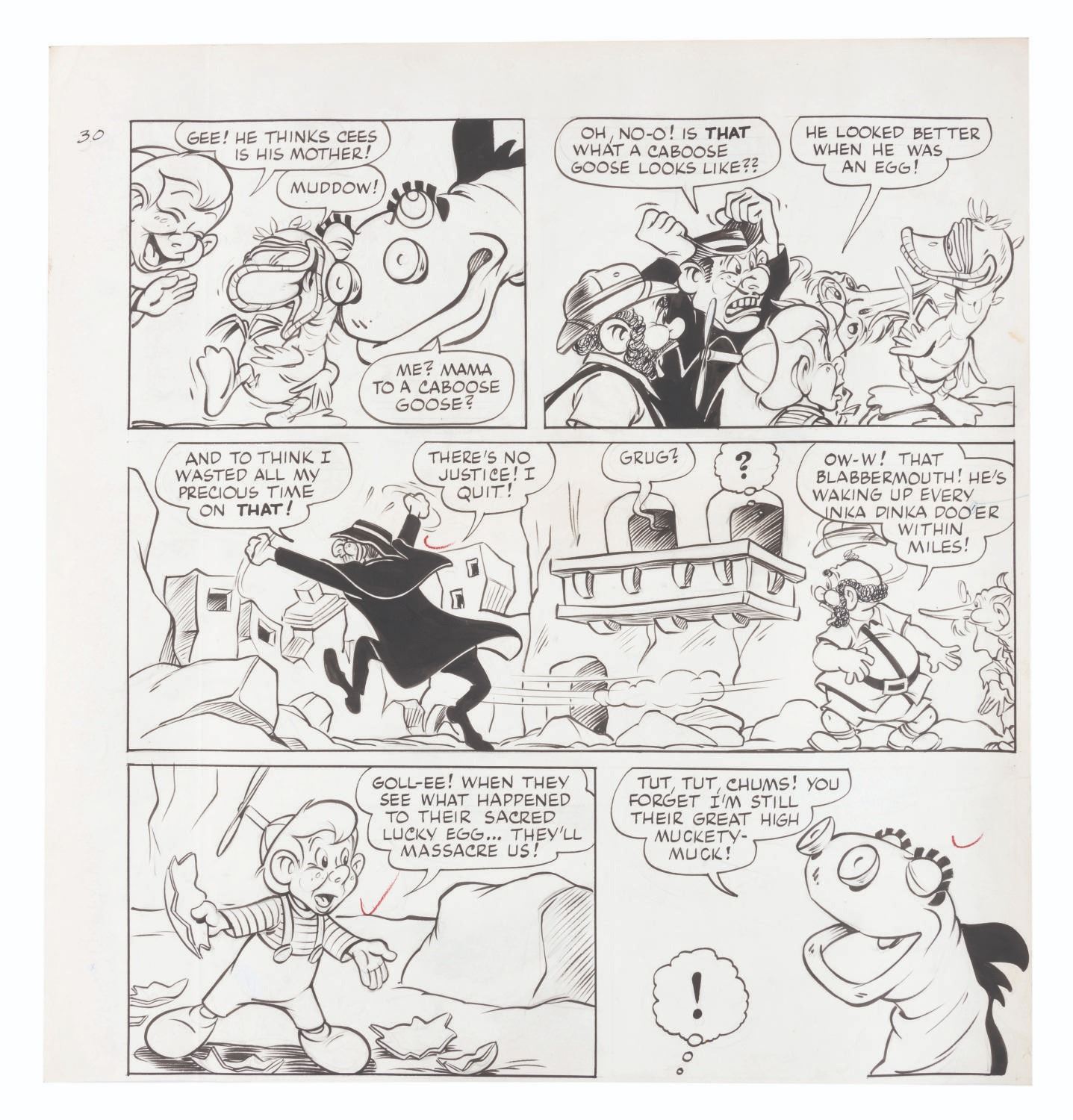 (Dell, 1953) The original art for five panels of the 1953 Dell Four Color #477 by Jack Bradbury. The art is the top of a page from the story “In Search of Caboose Goose Egg” with the bottom two frames missing. Measuring 18.75” x 17.75”, the art accomplished in ink on paper is in very good condition, with light edge wear, light waviness, and red grease pencil checks to the last three frames.