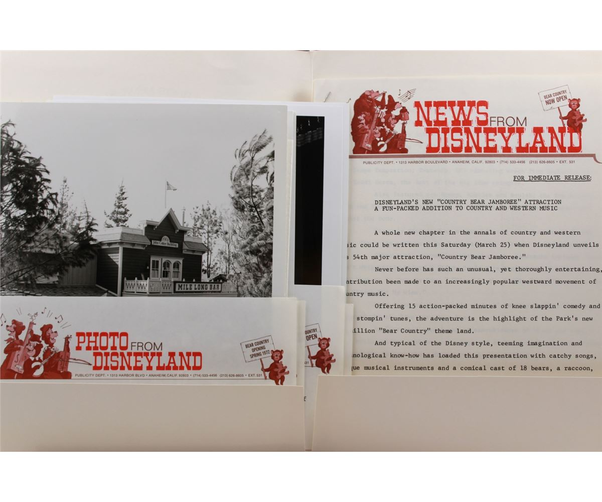 (Disneyland, 1972) Rare press kit in folder featuring photos and Marc Davis concept art for the newest land at Disneyland since Opening Day. Filled with typed info sheets and photos for press release. Measuring 12 x 9 in. and in very good condition.