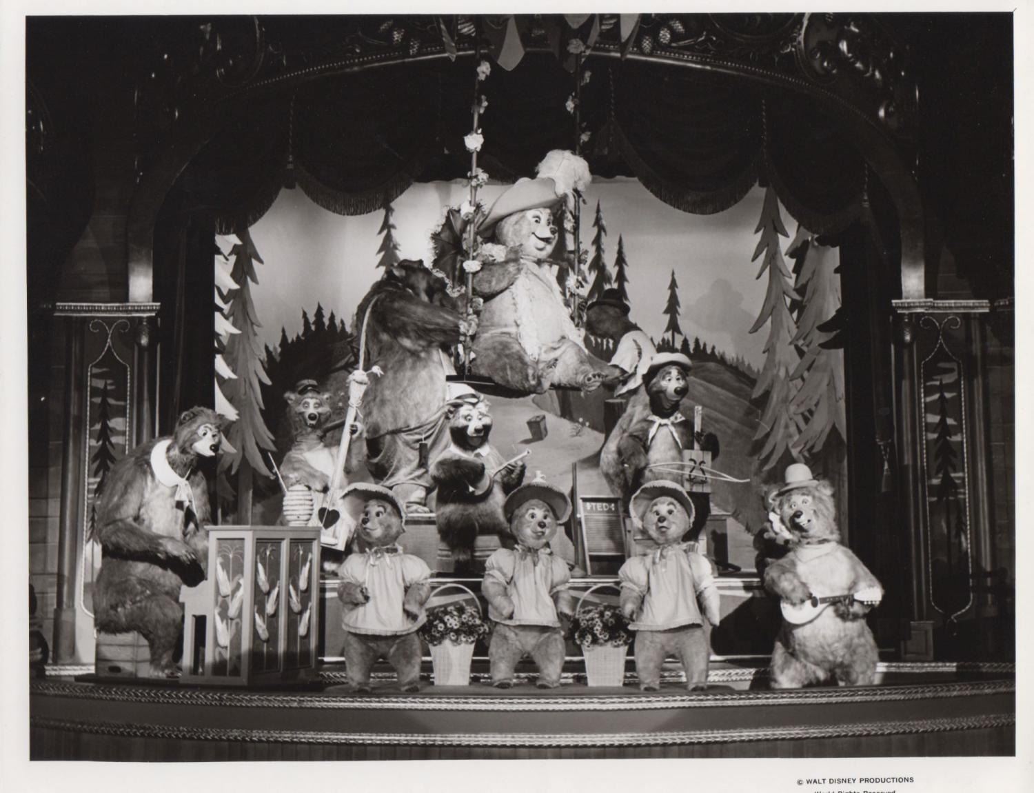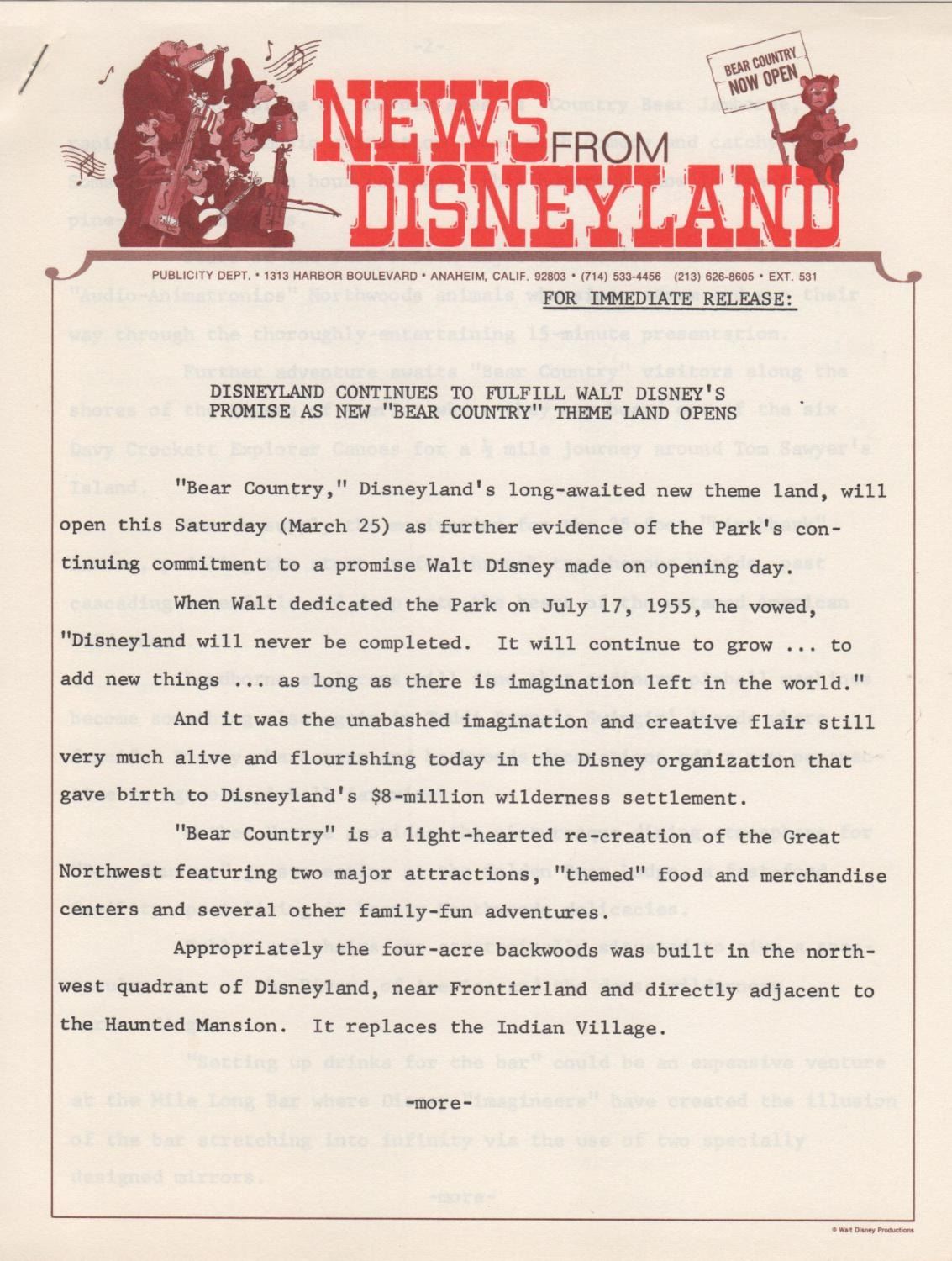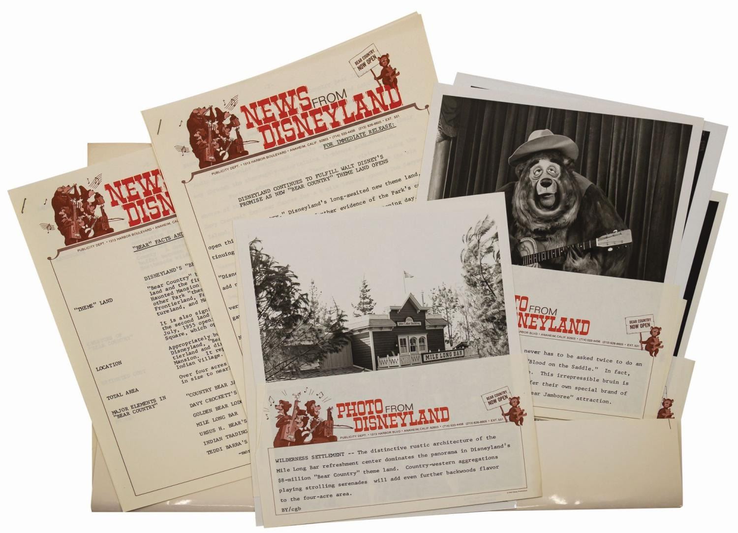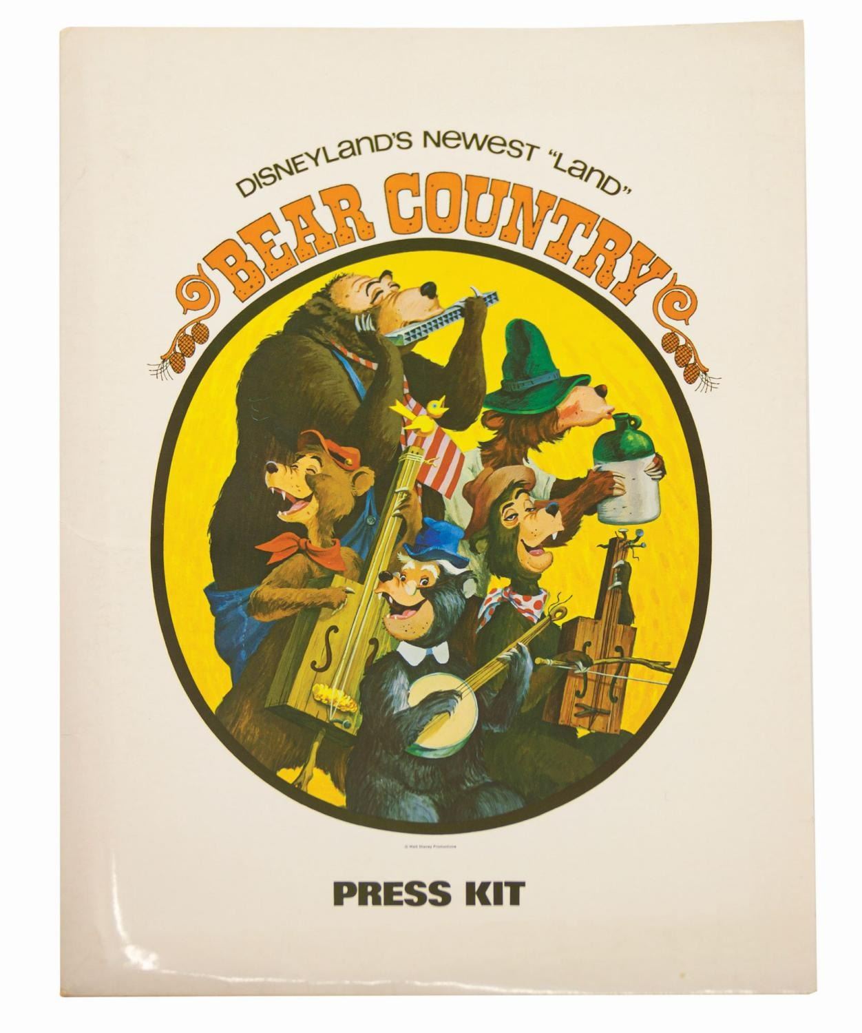 (Disneyland, 1972) A vintage Bear Country press kit released by Disneyland to promote the park's newest land. The kit includes (6) gelatin silver 8"x10" press photos with snipes on Bear Country stationery and (3) informational packets totaling 7-pages on Bear Country Disneyland stationery. All items are assembled in a pocket folder with cover artwork by Marc Davis on the cover. The packets measure 11"x8.5" and the folder is 12"x9". All items are in good to very good condition. The folder has some browning and faint scuff discoloration, spidering along the spine, and edge creasing. The other items exhibit light edge and corner wear.