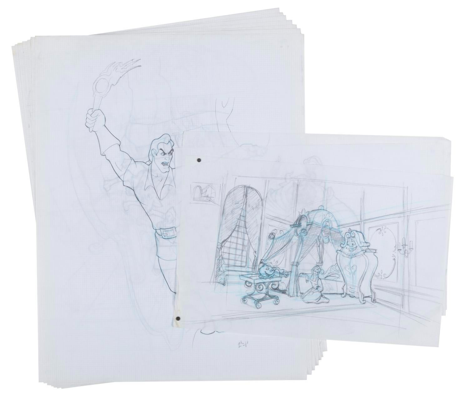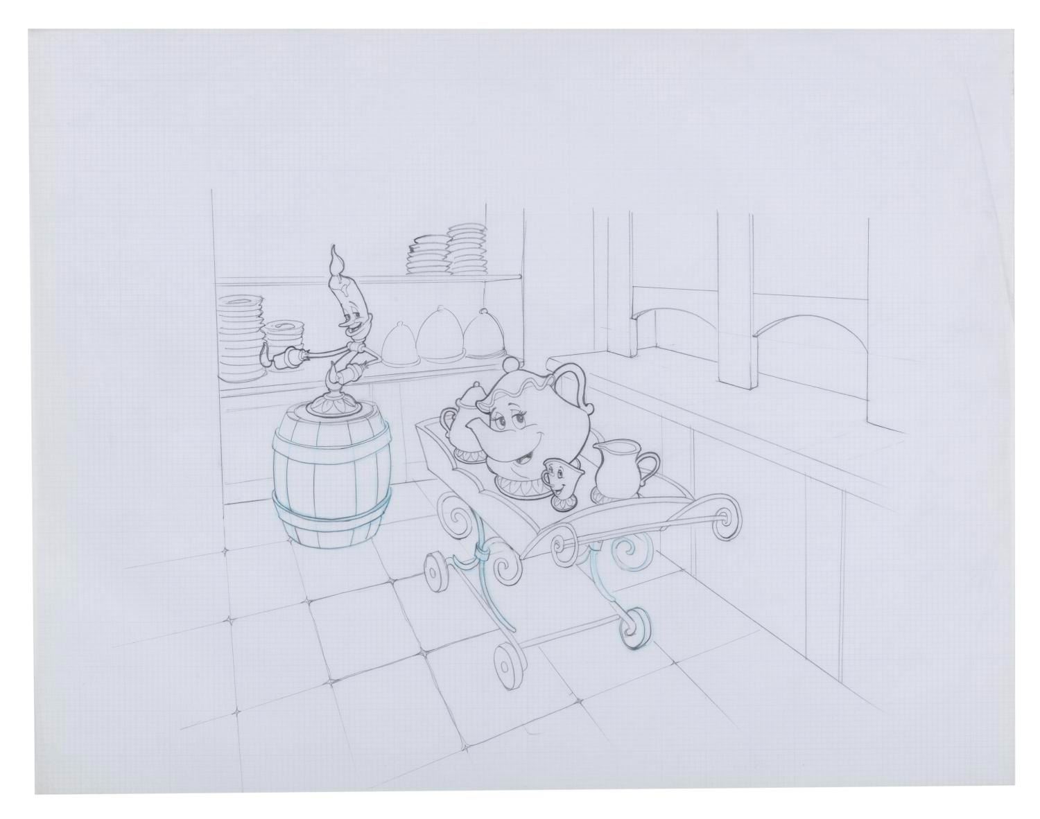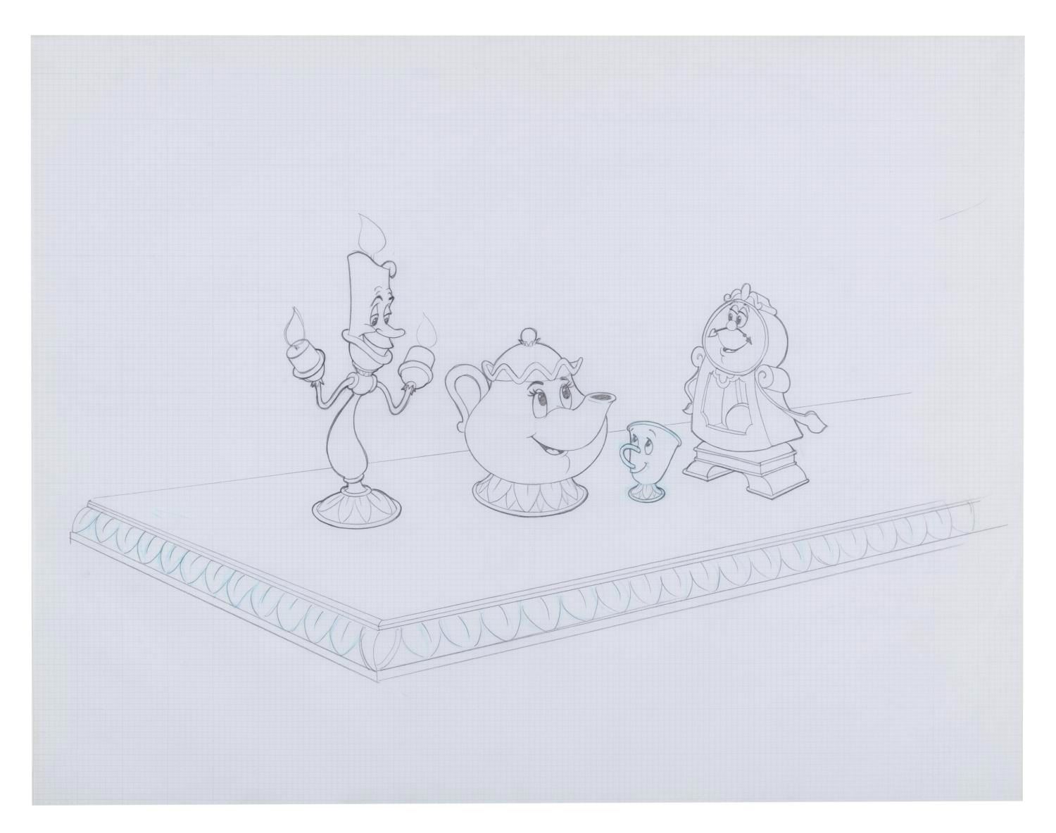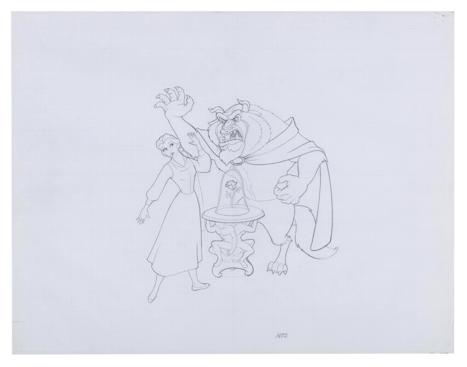 (Disney, 1990s) A collection of ten "Beauty and the Beast" concept drawings for merchandise featuring Belle, Beast, Lumiere, Chip and Mrs. Potts, and Gaston. The graphite and colored pencil drawings have image sizes from 9.25" x 12.25" to 15.5" x 20" on paper ranging from 11" x 17" to 17" x 22". The art is in good to very good condition with creases, folds, light tape residue on one edge, and edge wear from production use.