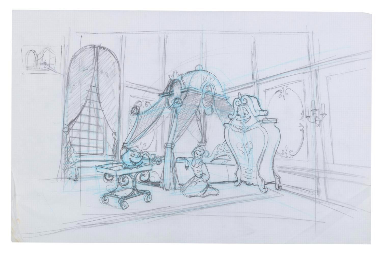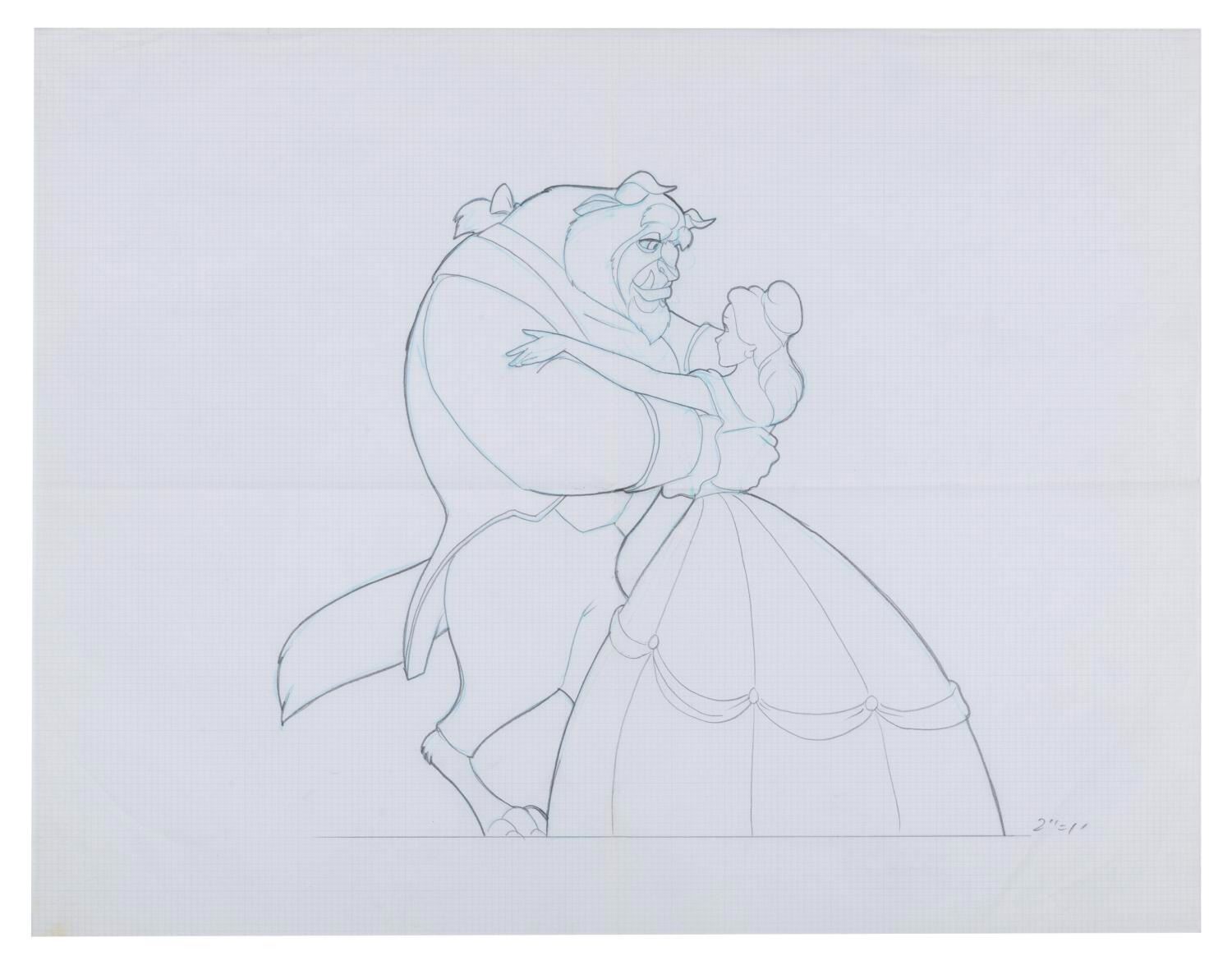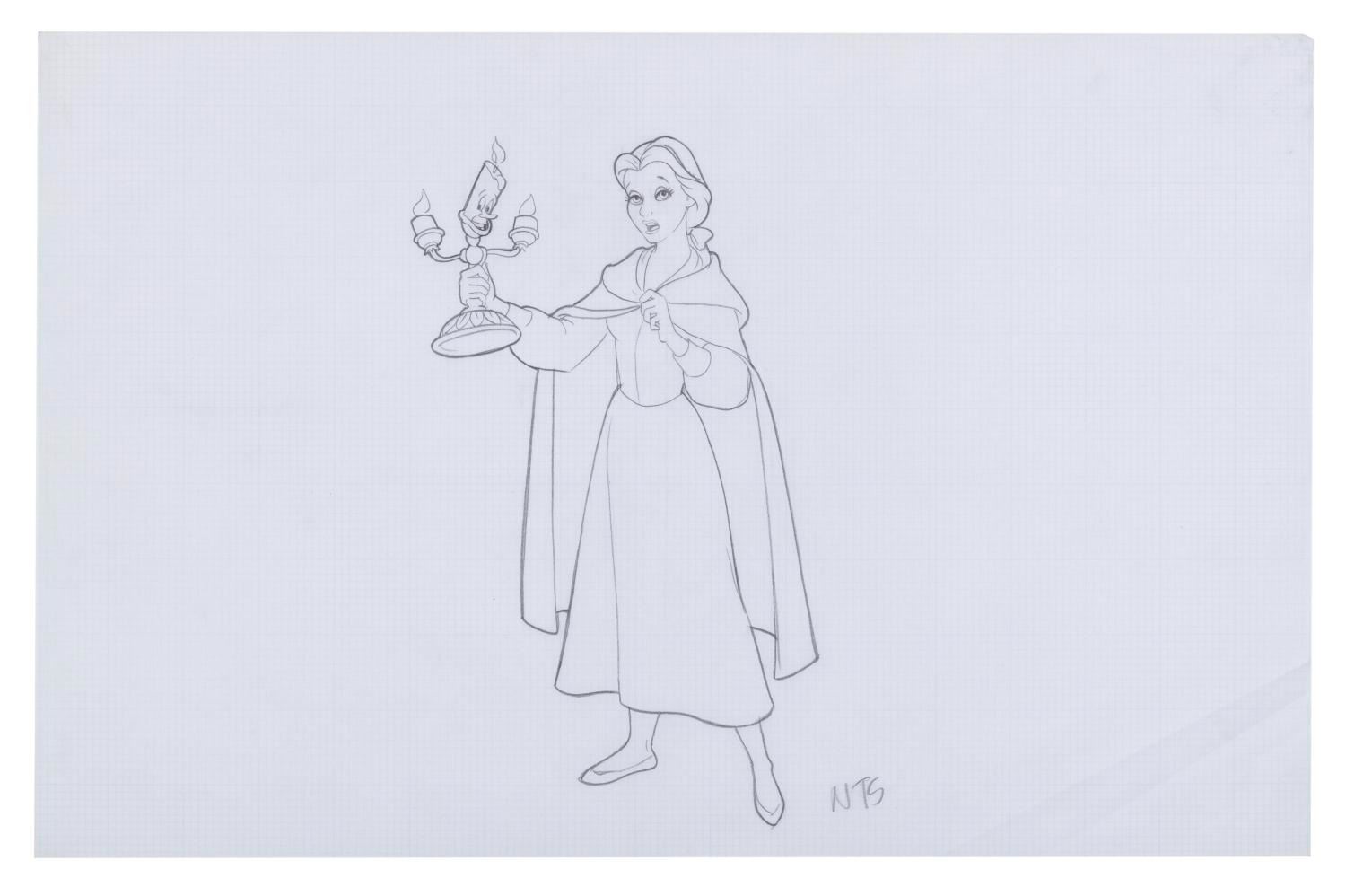 (Disney, 1990s) A collection of ten "Beauty and the Beast" concept drawings for merchandise featuring Belle, Beast, Lumiere, Chip and Mrs. Potts, and Gaston. The graphite and colored pencil drawings have image sizes from 9.25" x 12.25" to 15.5" x 20" on paper ranging from 11" x 17" to 17" x 22". The art is in good to very good condition with creases, folds, light tape residue on one edge, and edge wear from production use.