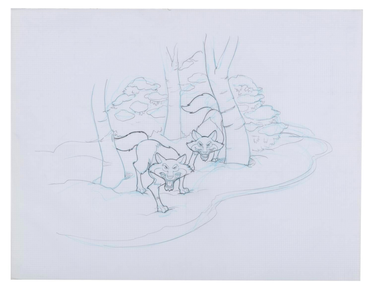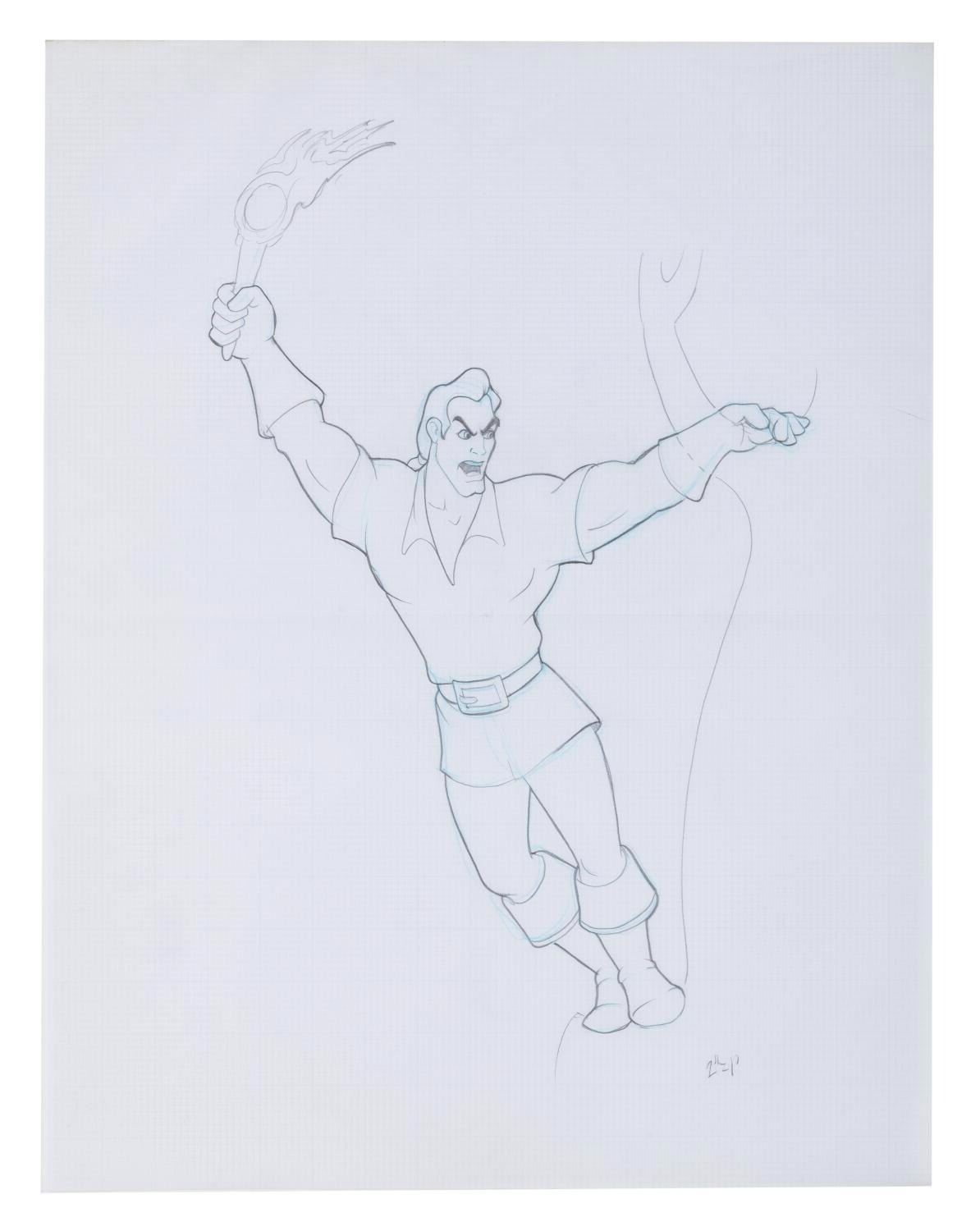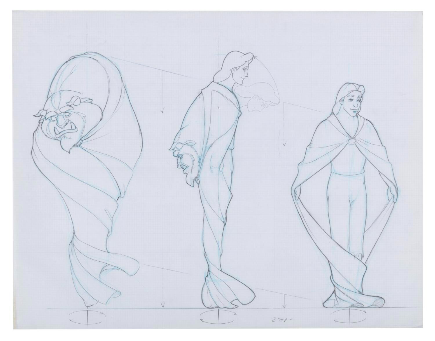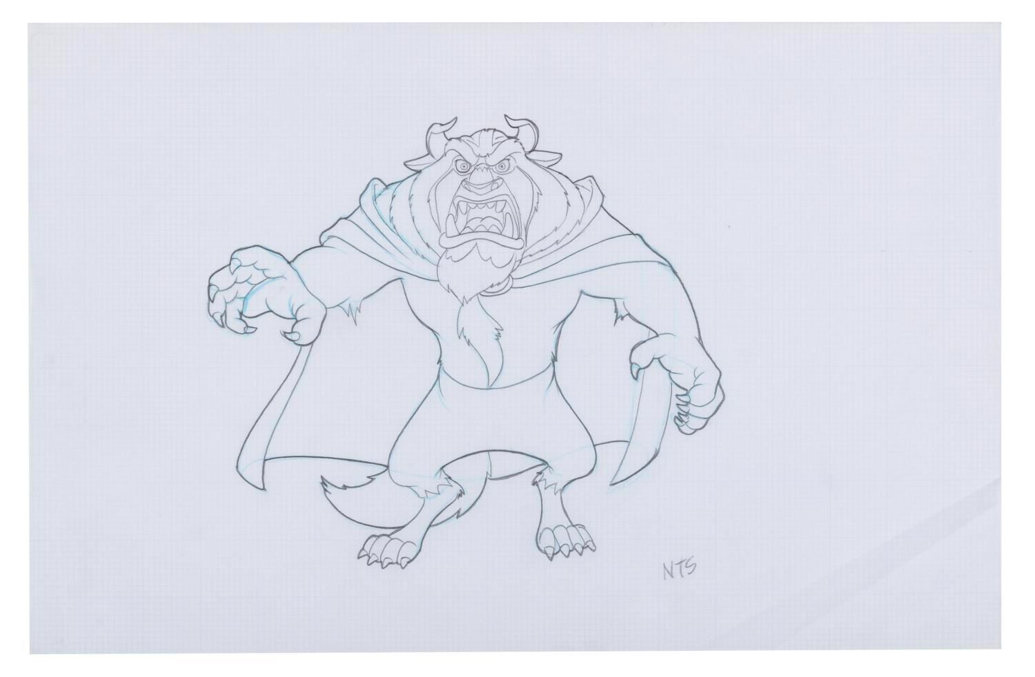 (Disney, 1990s) A collection of ten "Beauty and the Beast" concept drawings for merchandise featuring Belle, Beast, Lumiere, Chip and Mrs. Potts, and Gaston. The graphite and colored pencil drawings have image sizes from 9.25" x 12.25" to 15.5" x 20" on paper ranging from 11" x 17" to 17" x 22". The art is in good to very good condition with creases, folds, light tape residue on one edge, and edge wear from production use.