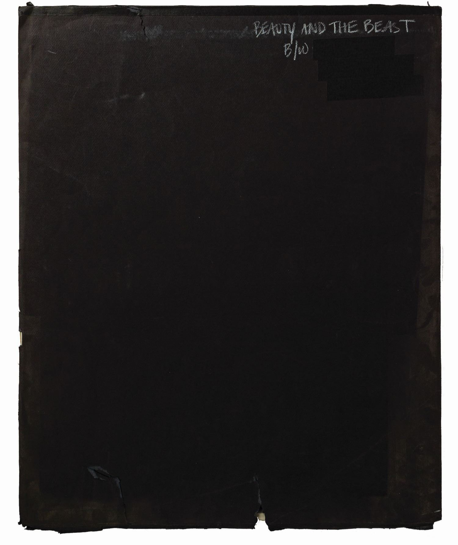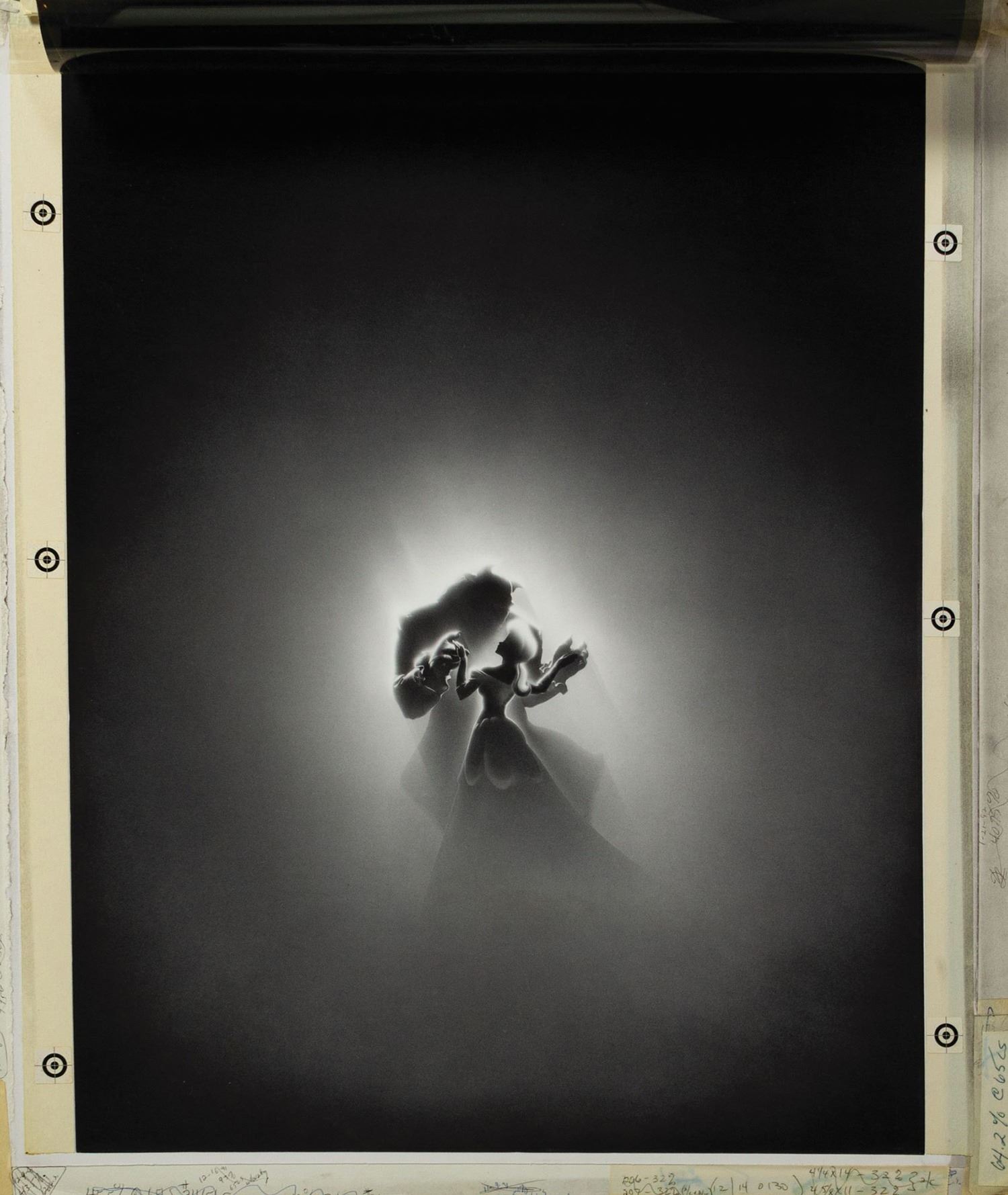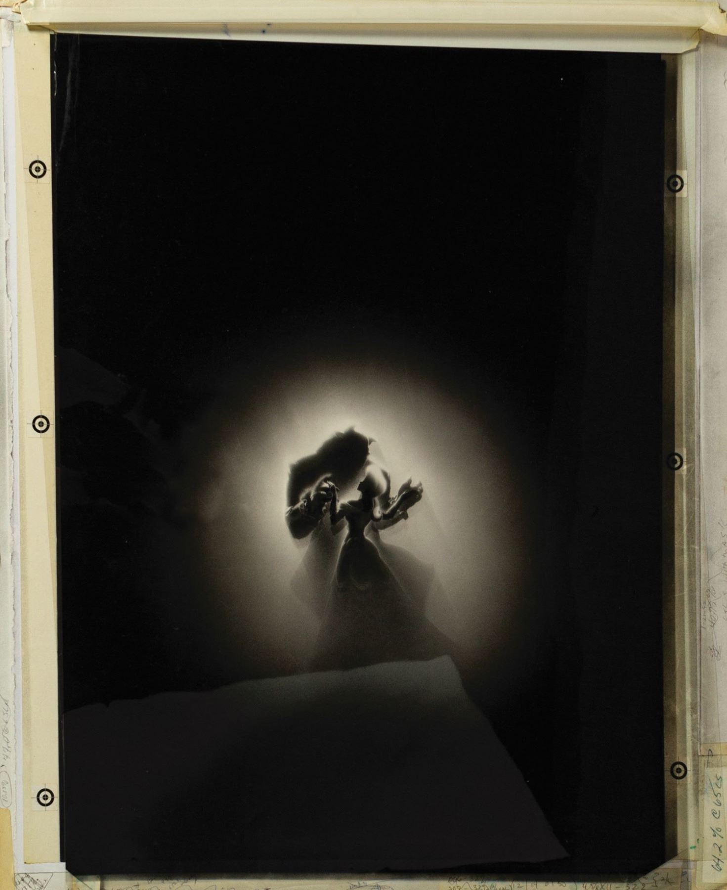 (Disney, 1991) A promotional image for the animated feature film Beauty and the Beast. The image consists of a cel overlay which adds shadow over the printed image of Beauty and the Beast. A color version of this image can be seen in the film poster and other promotional materials. Measuring approximately 24"x19.75" attached to a 25.5"x21.25" art board, the image is in good condition with some wear from use and age. There appears to be some color bleed from the cel onto the art board, and there are numerous hand-written notes on the front and reverse of the board.