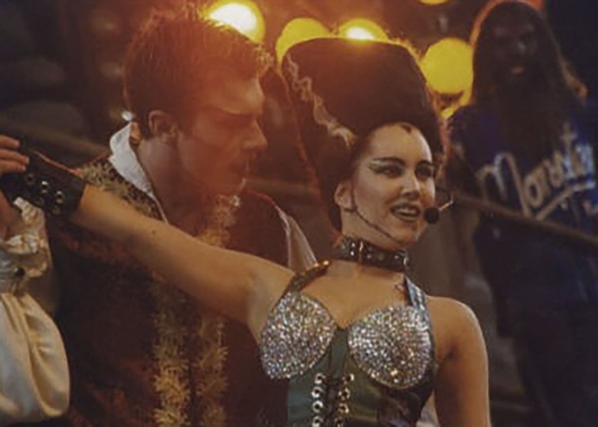 (Universal, c.2000s) A wig costume prop worn by the Bride of Frankenstein in the beginning of Beetlejuice's Rock and Roll Graveyard Revue at Universal Studios Florida. This style of wig is seen only for a few minutes, when the Bride first emerges on stage in her regular monster form, but it is replaced by a different hairdo once the monsters are "transformed" into rock stars. Measuring approximately 12.5" tall with an adjustable band to allow for a better fit, the wig is in good used condition. There are multiple loose, flyaway hairs and spots where the covering hairnet is tearing. There appears to be minor discoloration to the white streaks. This is a very recognizable costume piece from one of Universal's most well-known monsters, from one of the park's most popular former shows.